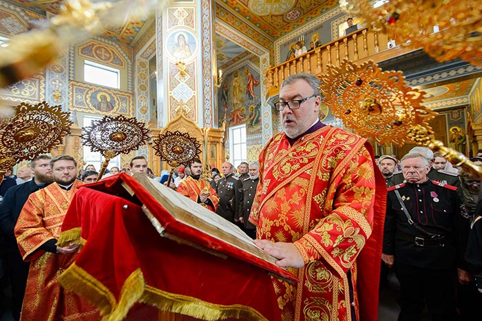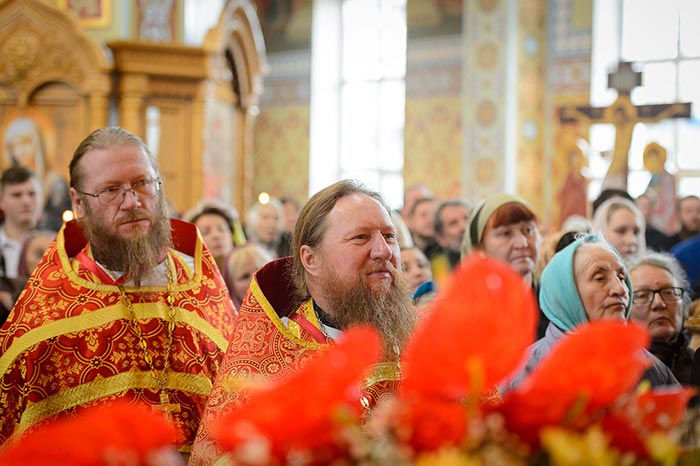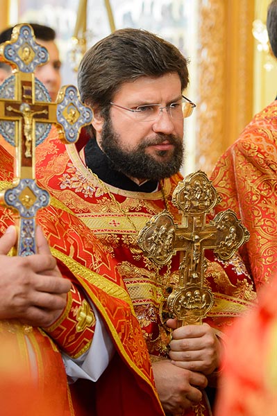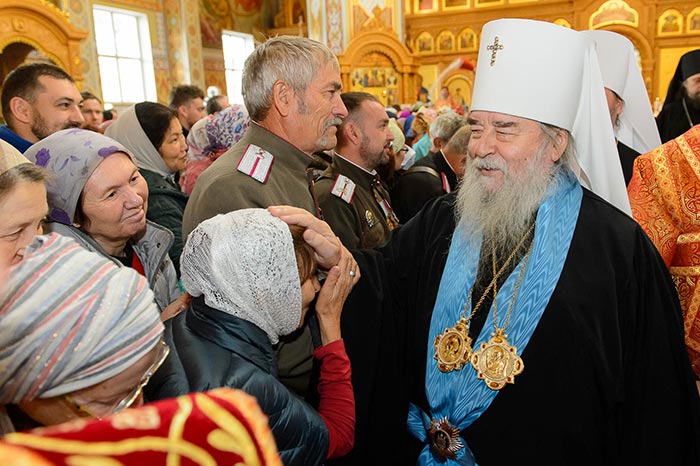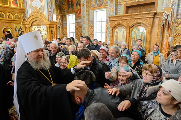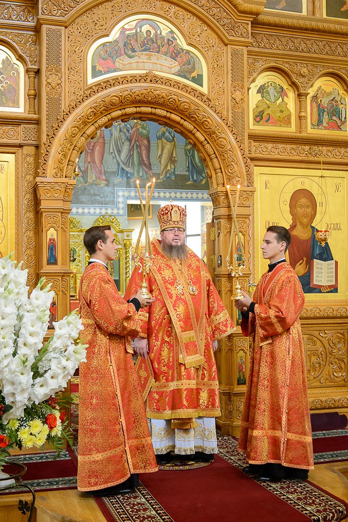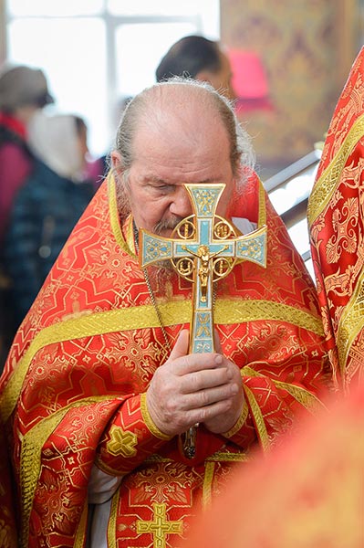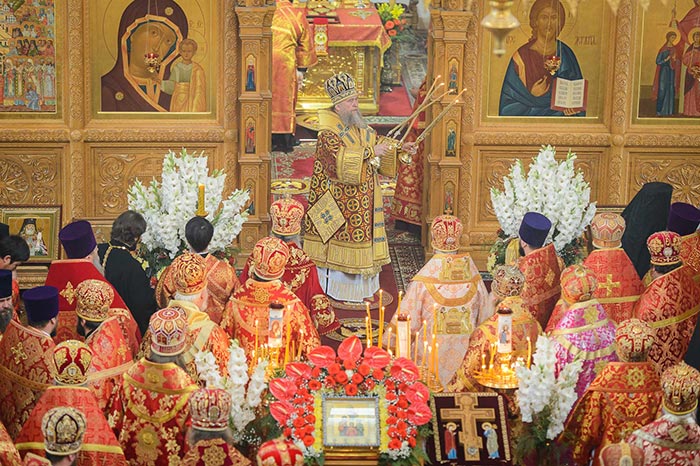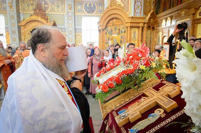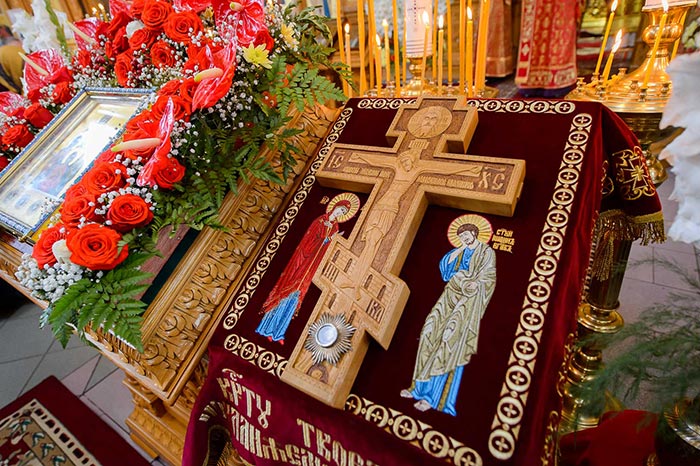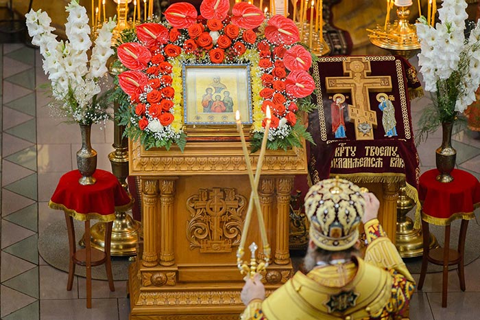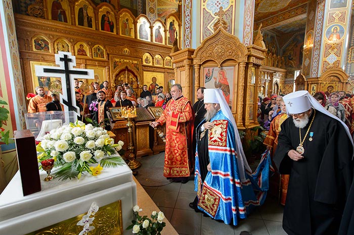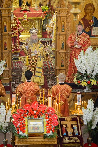 Богослужение завершилось поклонением честному и животворящему Кресту и славлением святым мученицам Вере, Надежде, Любови и матери их Софии.