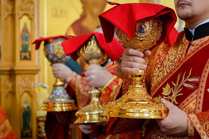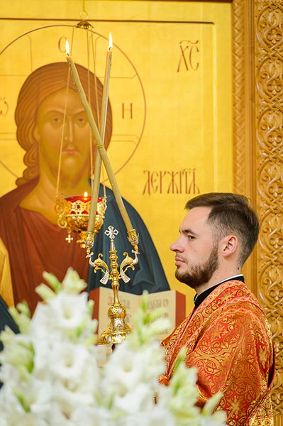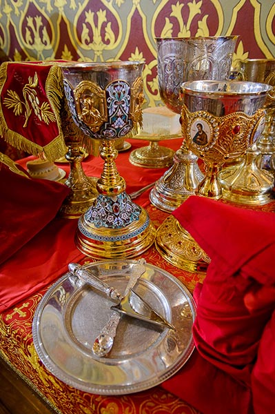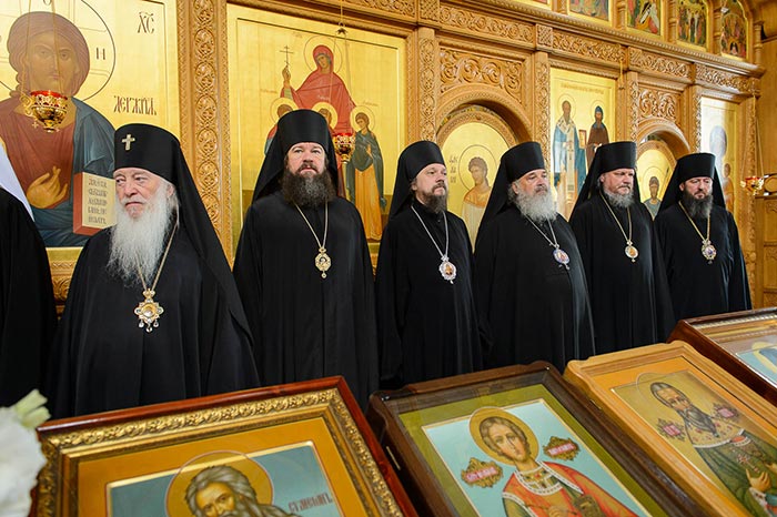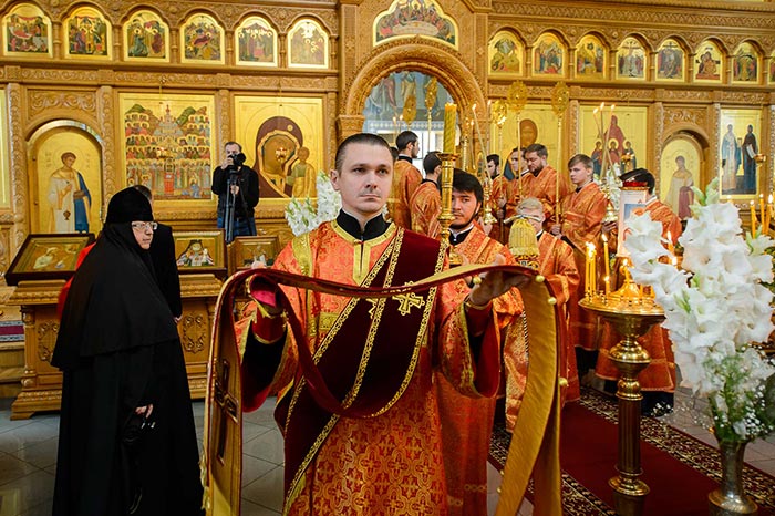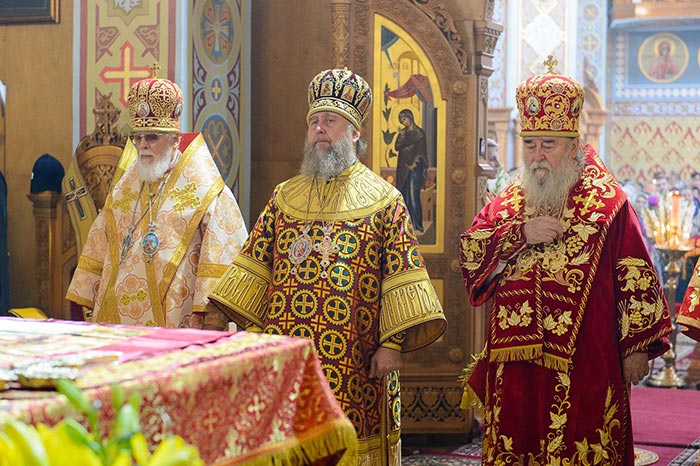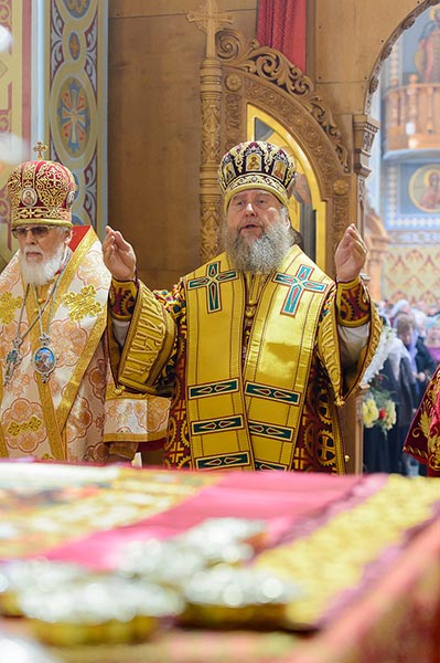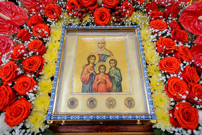 На аналое в центре собора, рядом с Животворящим Крестом Христовым, был установлен ковчег с мощами мучениц Веры, Надежды, Любови и Софии.
