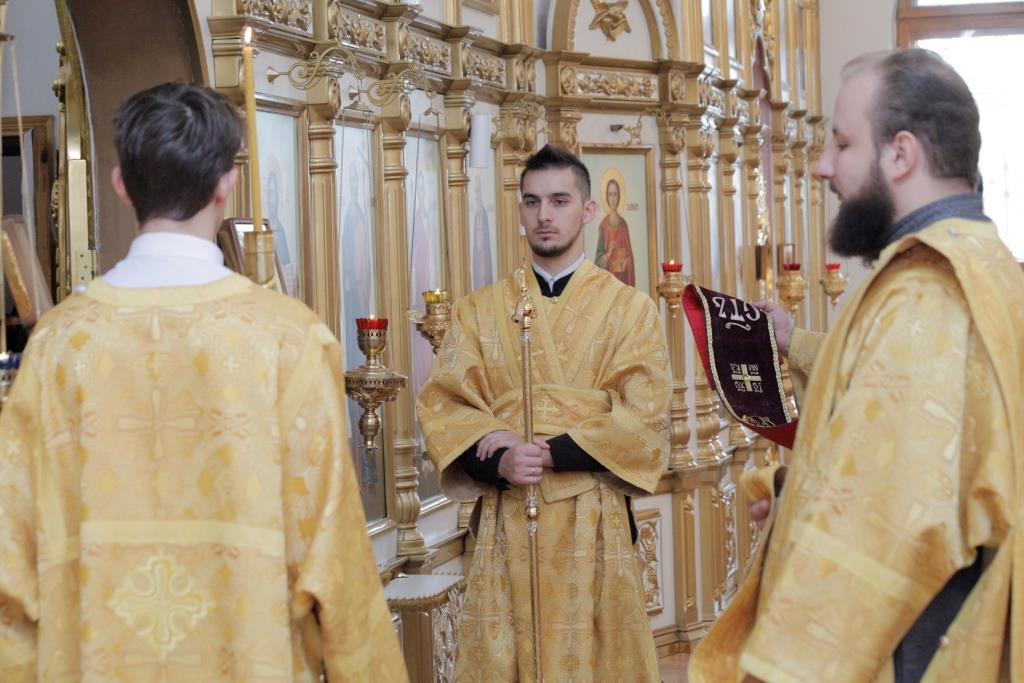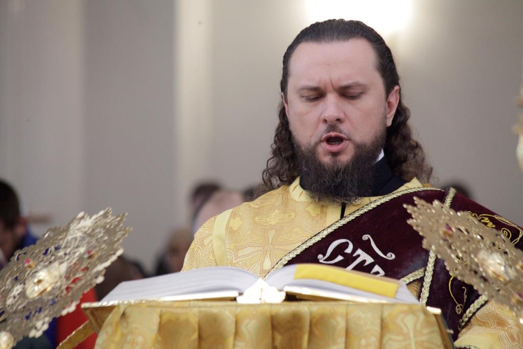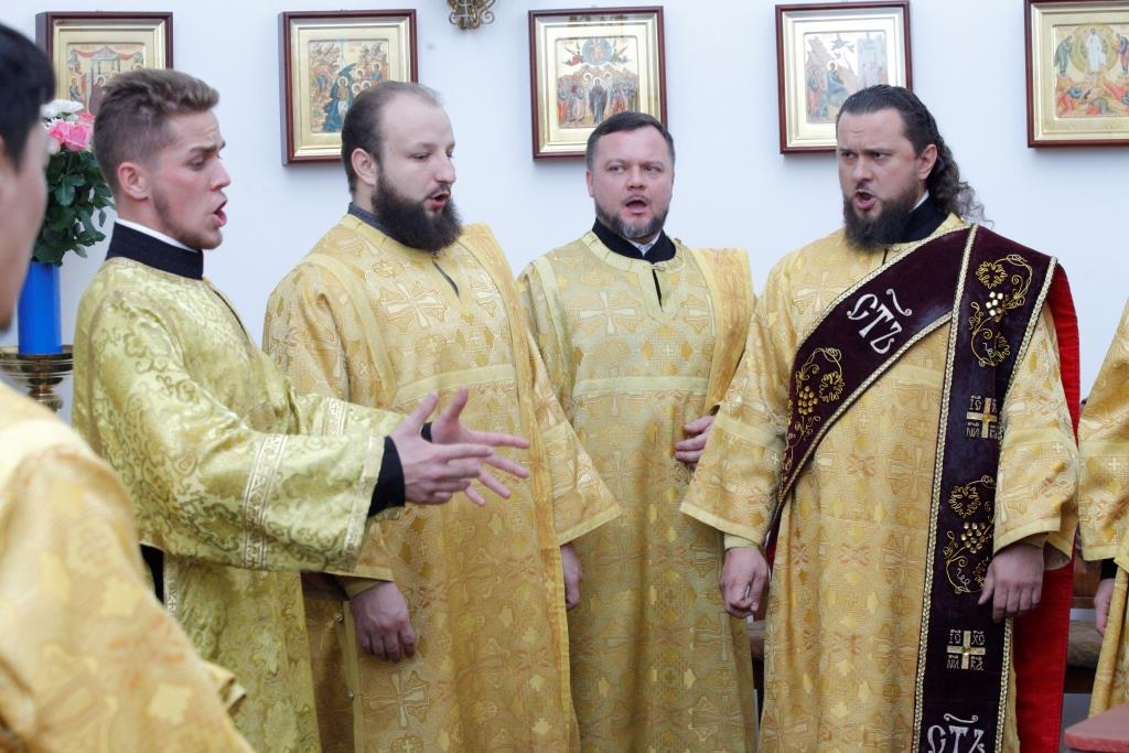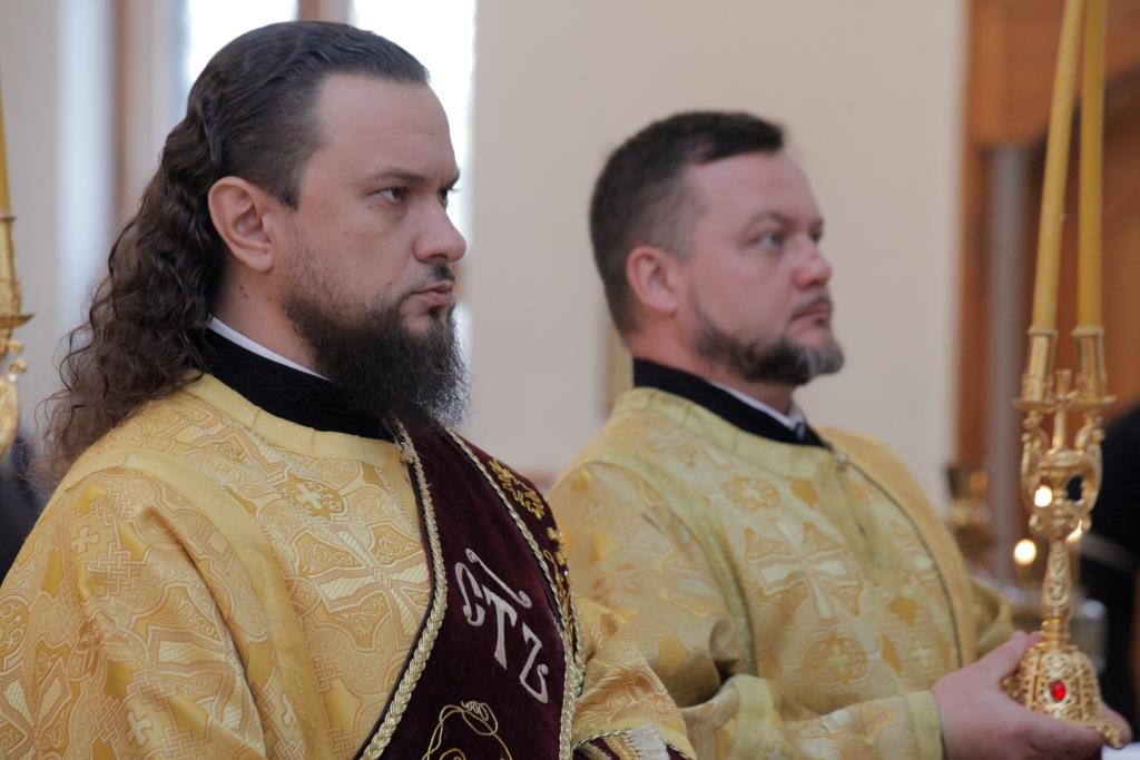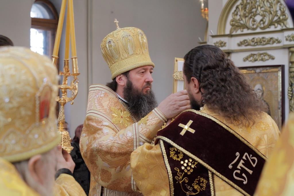 Преосвященнейшему Архипастырю сослужили: духовник епархии архимандрит Спиридон (Теплухин), ключарь собора иеромонах Никодим (Авдеев), клирик собора иерей Алексий Клепиков, протодиакон Андрей Дудник, диакон Алексий Горбунов, диакон Владимир Лаврешин.
