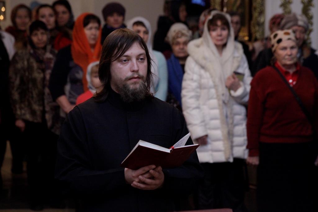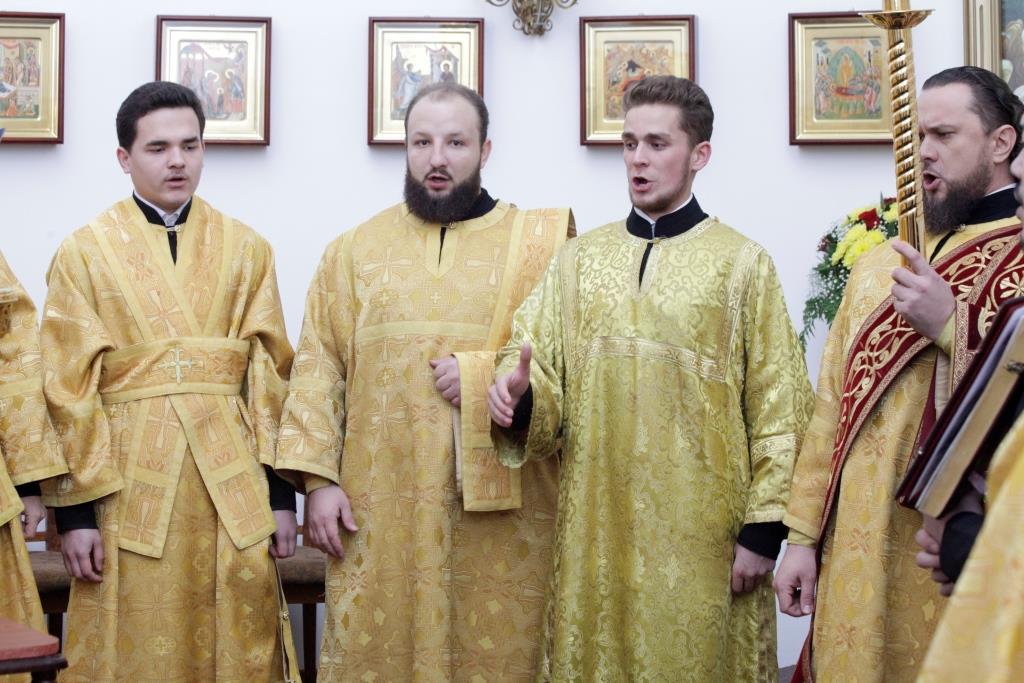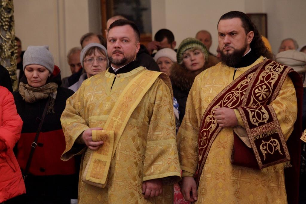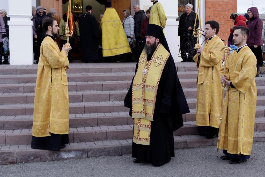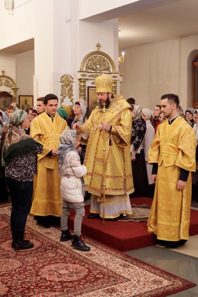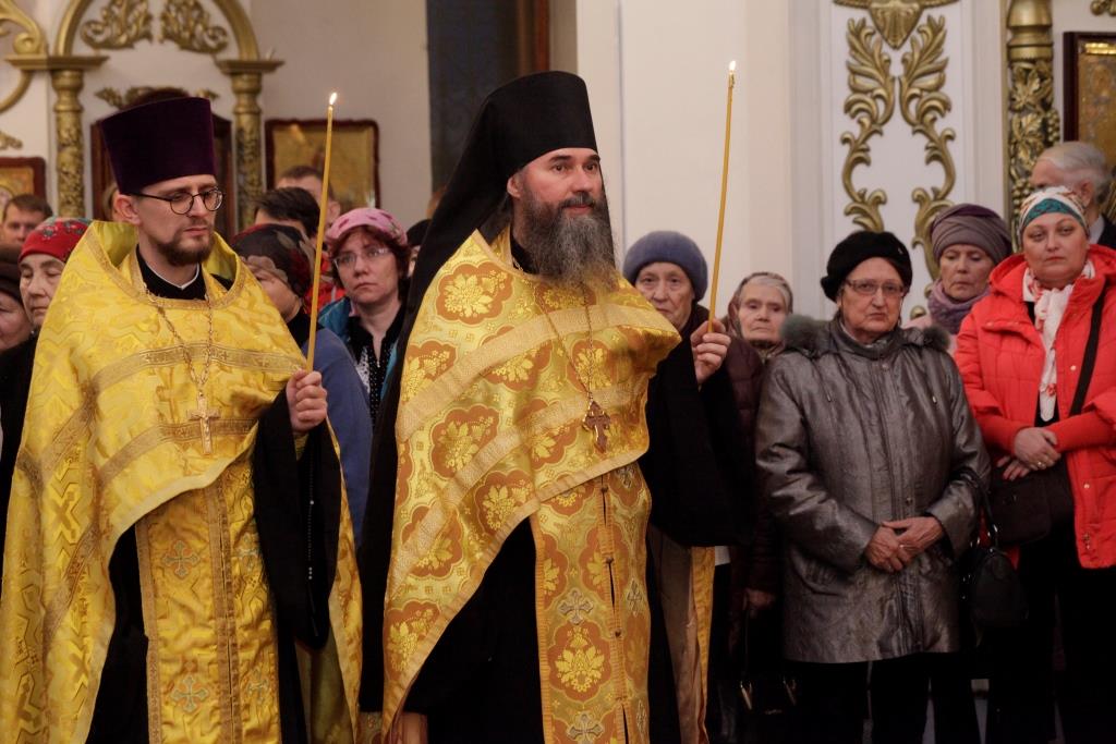 За богослужением Его Преосвященству сослужили: ключарь собора иеромонах Никодим (Авдеев), клирики собора иерей Алексий Клепиков и иерей Константин Дьяков. Диаконский чин возглавил протодиакон Андрей Дудник. Хор под управлением регента Н. Романцовой исполнял песнопения воскресного Богослужения. В храме молились насельники Свято-Троицкого мужского монастыря, сотрудники епархиального управления, прихожане и паломники главного храма Рудного Алтая.