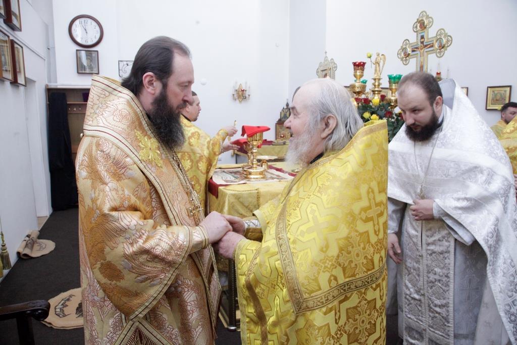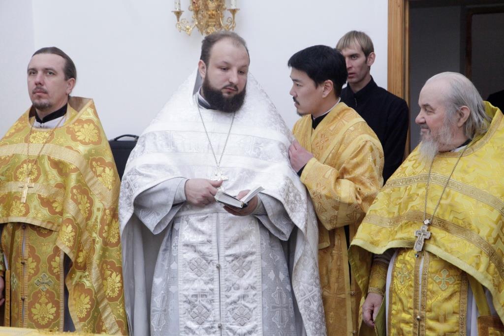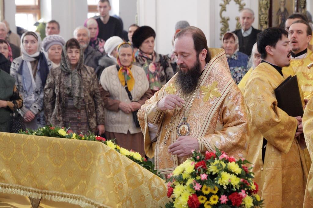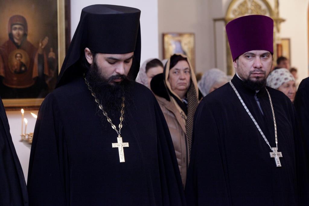 За Божественной Литургией Его Преосвященству сослужили: духовник епархии архимандрит Спиридон (Теплухин), ключарь кафедрального собора иеромонах Никодим (Авдеев), настоятель Трёхсвятительского храма поселка Глубокое иерей Константин Акентьев, настоятель Пророко-Илиинского храма села Урджар иеромонах Агафангел (Меринов), настоятель Свято-Зиновьевского храма города Усть-Каменогорска иерей Вячеслав Гутов, клирики кафедрального собора иерей Алексий Клепиков и иерей Константин Дьяков. Диаконский чин возглавил протодиакон Андрей Дудник. Песнопения праздничной Литургии исполнял Архиерейский хор под управлением регента Н. Романцовой. За Богослужением молились прихожане и паломники Андреевского собора, насельники Свято-Троицкого мужского монастыря, сотрудники епархиального управления.