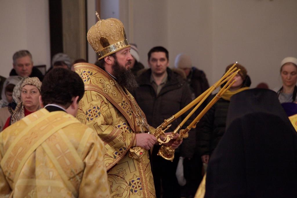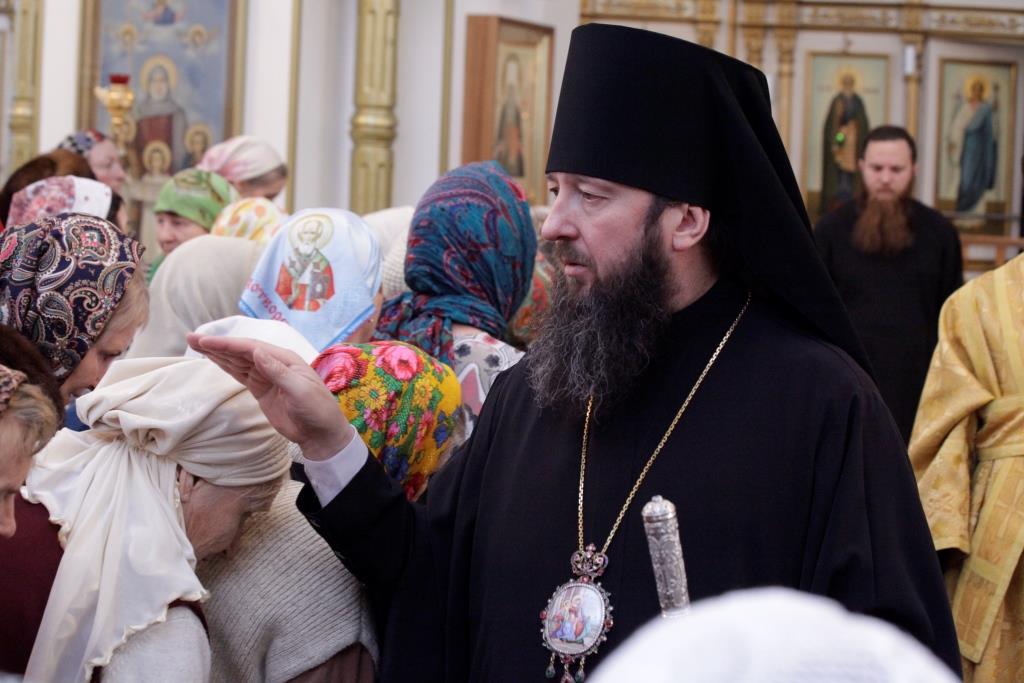 В завершение богослужения было совершено славление «правилу веры и образу кротости» - святителю Николаю. После славления Преосвященнейший Владыка поздравил всех молящихся с торжеством и обратился к народу Божию со словами проповеди.