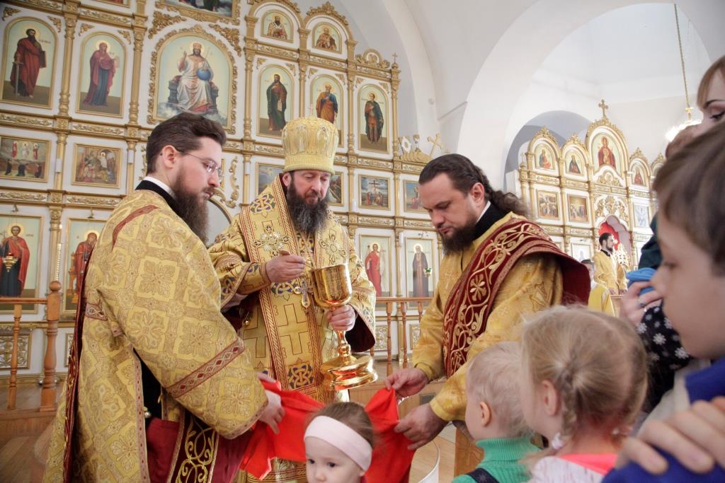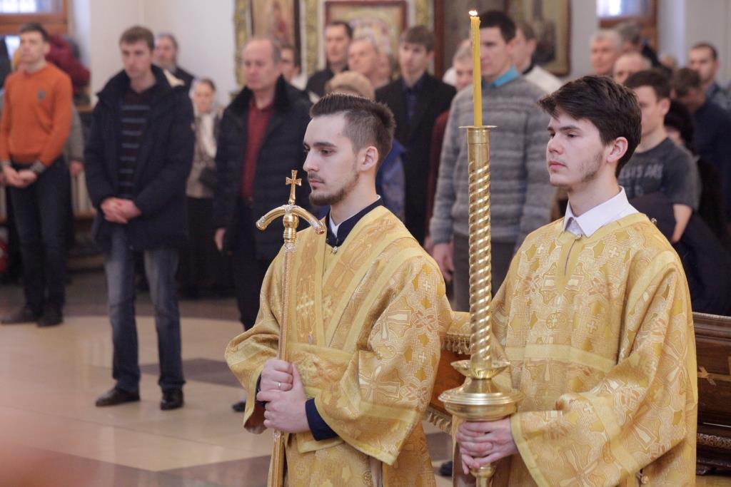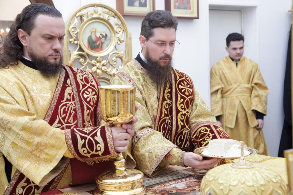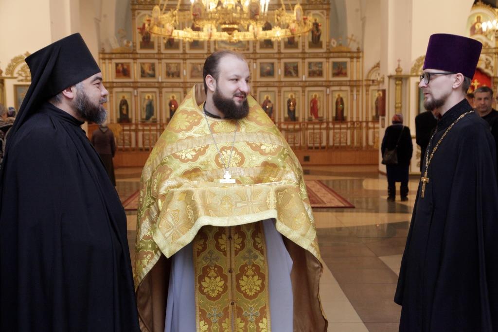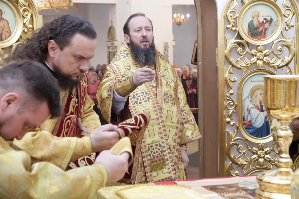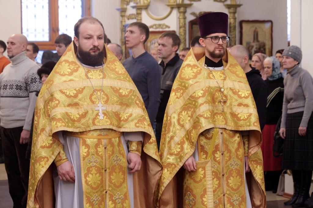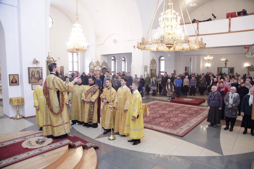 Песнопения Недели святых отец и Божественной Литургии исполнял Архиерейский хор под управлением В. Федоровой. За Литургией молились и причащались Святых Христовых Таин прихожане и паломники Андреевского кафедрального собора, сотрудники епархиального управления, насельники Свято-Троицкого мужского монастыря. Перед причастием мирян проповедовал священник Алексий Горбунов.