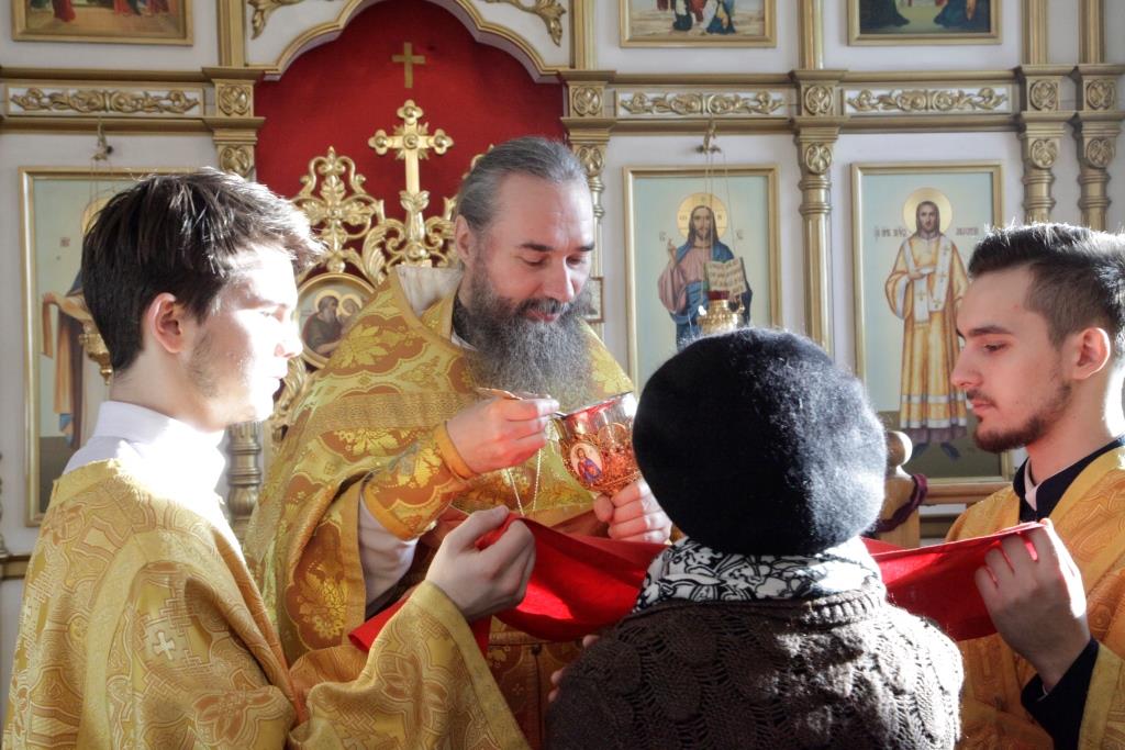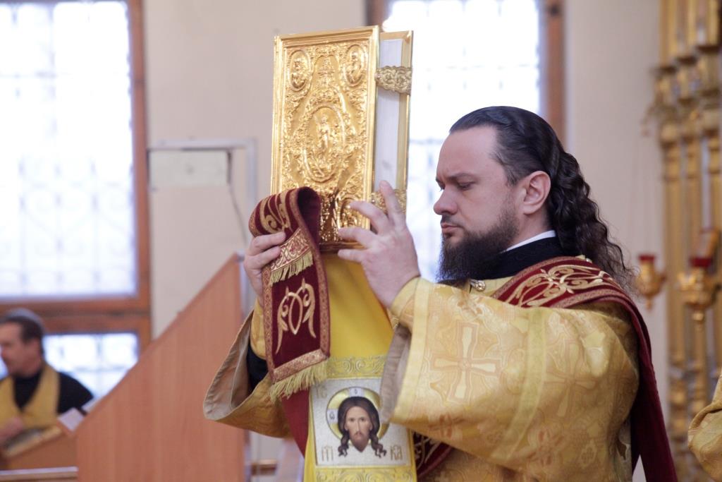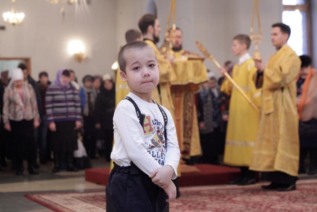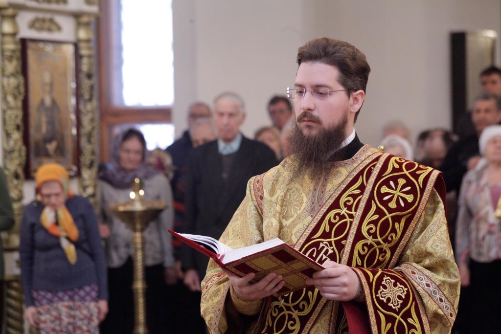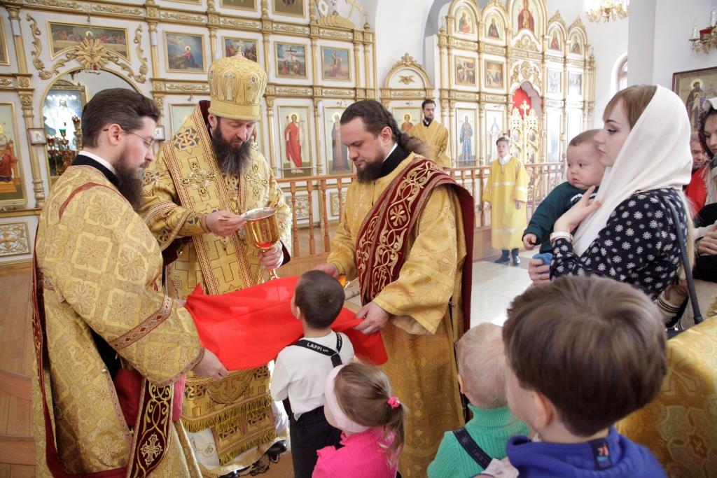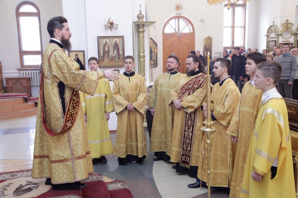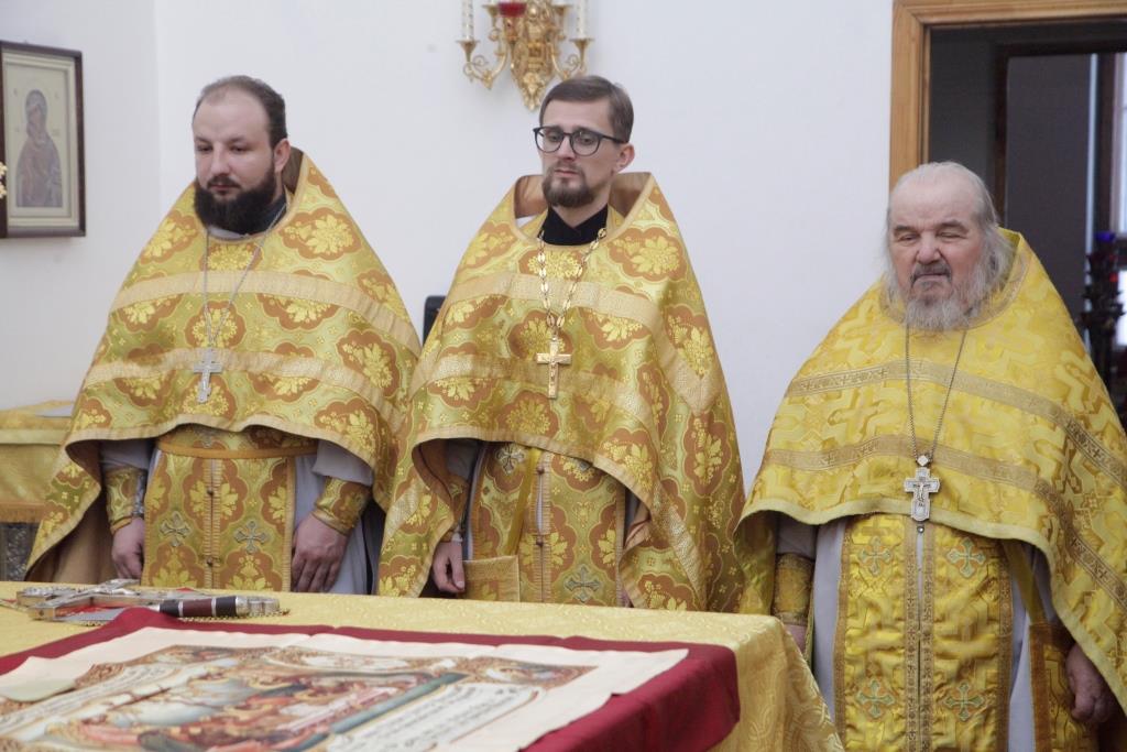 Песнопения Недели святых отец и Божественной Литургии исполнял Архиерейский хор под управлением В. Федоровой. За Литургией молились и причащались Святых Христовых Таин прихожане и паломники Андреевского кафедрального собора, сотрудники епархиального управления, насельники Свято-Троицкого мужского монастыря. Перед причастием мирян проповедовал священник Алексий Горбунов.