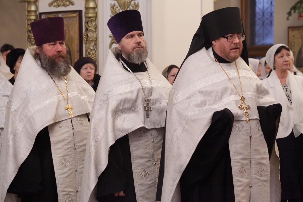 За Богослужением молились насельники Свято-Троицкой обители, сотрудники епархиального управления, прихожане кафедрального собора и паломники с городских храмов и окрестных населенных пунктов. Праздничные песнопения исполнял хор Андреевского собора под управлением В. Федоровой.