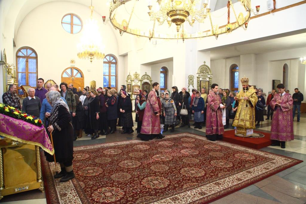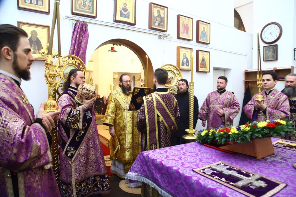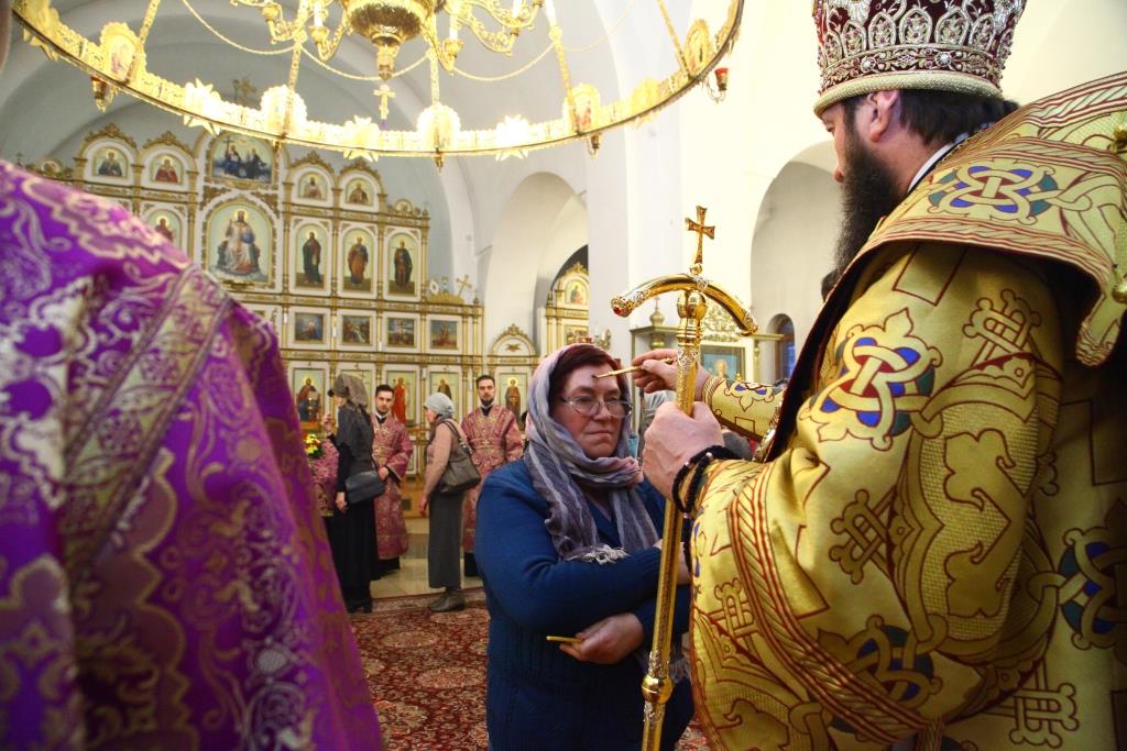 За богослужением молились прихожане главного православного храма Восточного Казахстана и насельники Свято-Троицкого мужского монастыря. По традиции, полиелей совершался в алтаре. Во время пения великого славословия епископ Амфилохий с клириками изнес из алтаря на середину храма святой Крест, после чего все молящиеся совершили поклонение святыне. Под пение особых крестопоклонных стихир Архипастырь помазал духовенство и собравшихся освященным елеем. Все пришедшие на Богослужение получили очередной номер епархиального миссионерского издания «Андреевский листок».