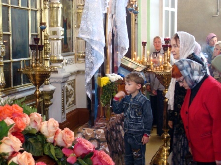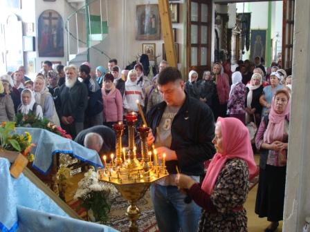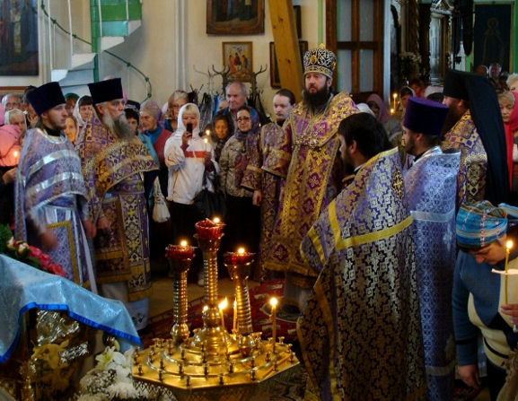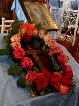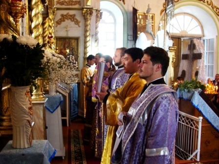 Литургия завершилась славлением перед Крестом Господнем – духовенство и хор пропели тропарь, кондак и величание празднику, а также песнопение «Кресту Твоему покланяемся, Владыко…».