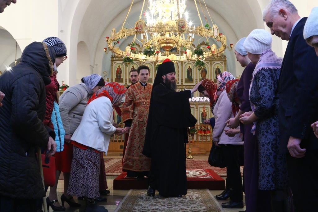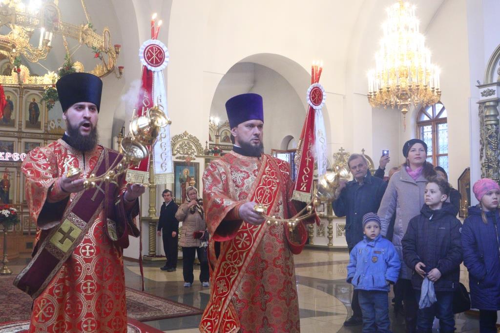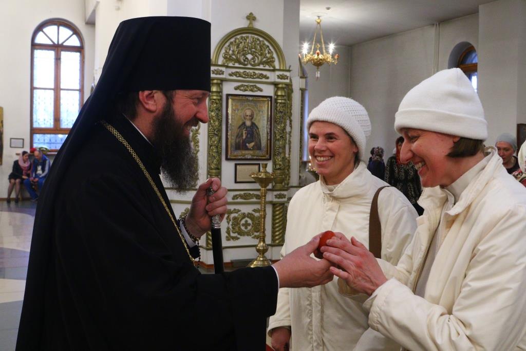 На вечернем богослужении молились сотрудники епархиального управления, братия Свято-Троицкой мужской обители города Усть-Каменогорска, паломники и прихожане кафедрального собора. За богослужением епископ Амфилохий прочитал Евангельское зачало о явлении Воскресшего Христа ученикам (Ин. 20:19-25).