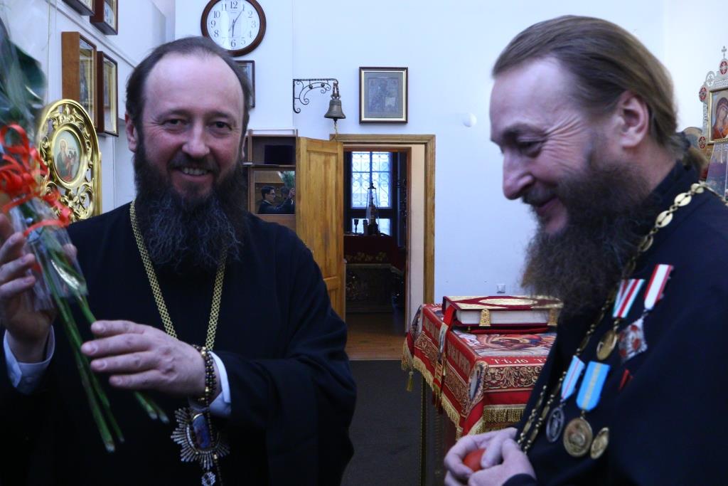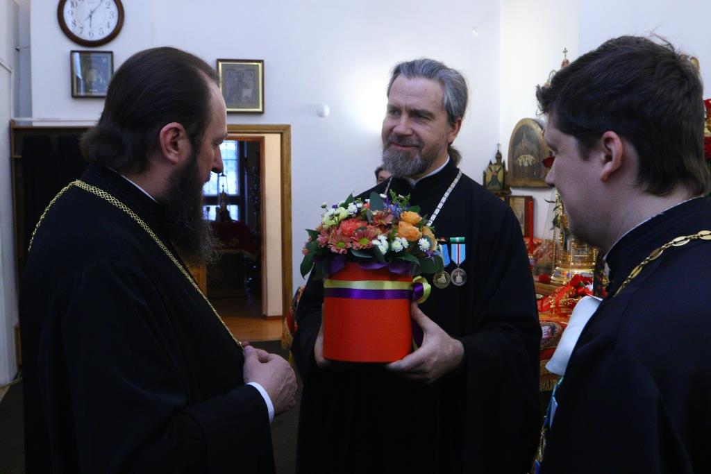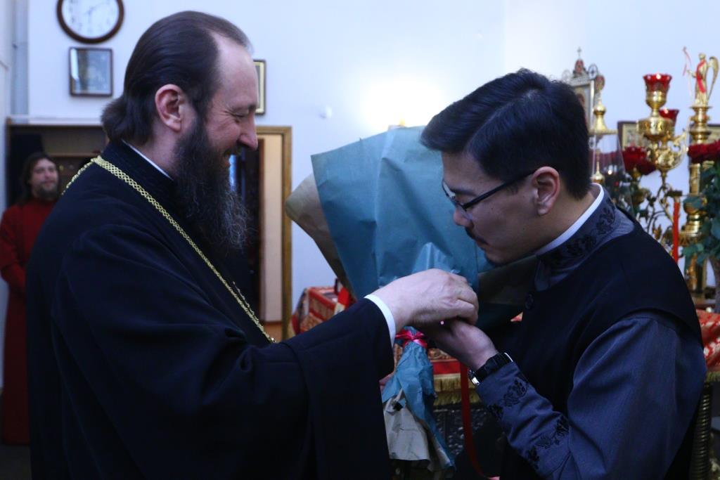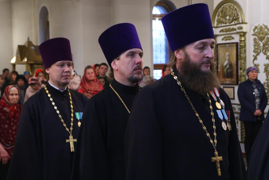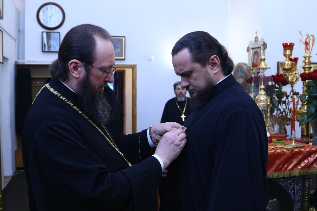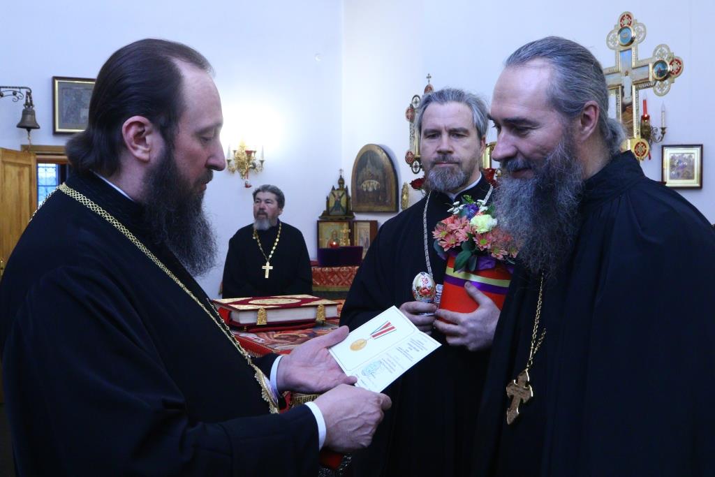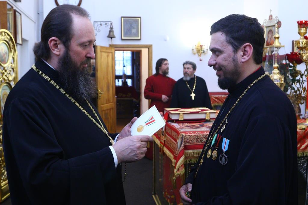 В конце вечерни Преосвященнейший Владыка к празднику Пасхи Христовой и за усердные труды на благо Святого Православия удостоил высокой церковной награды – медали «В память 100-летия восстановления Патриаршества в Русской Православной Церкви» иеромонаха Никодима (Авдеева), иерея Вячеслава Гутова и протодиакона Андрея Дудника.