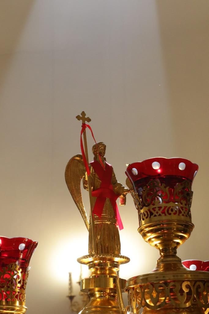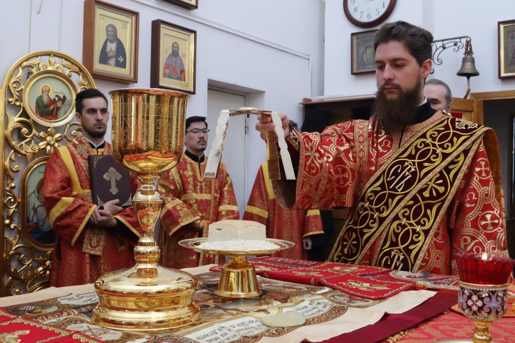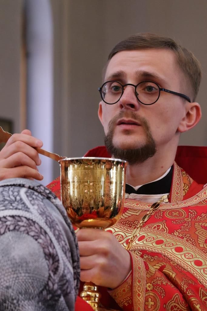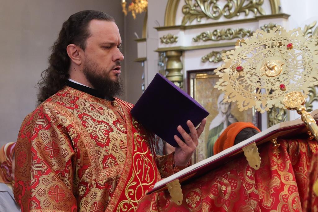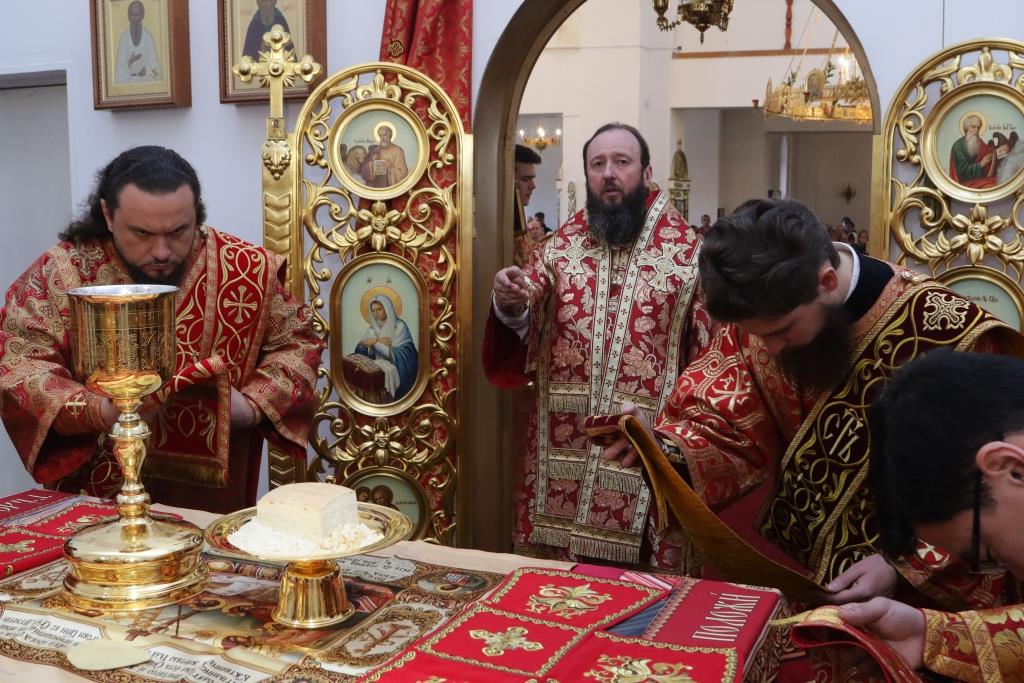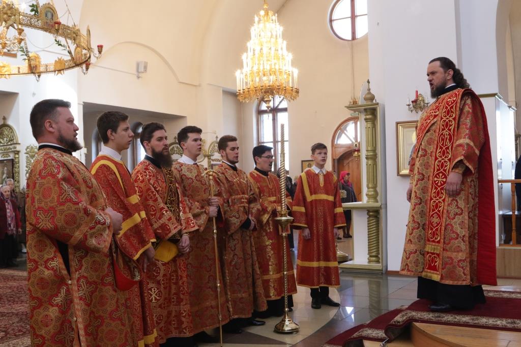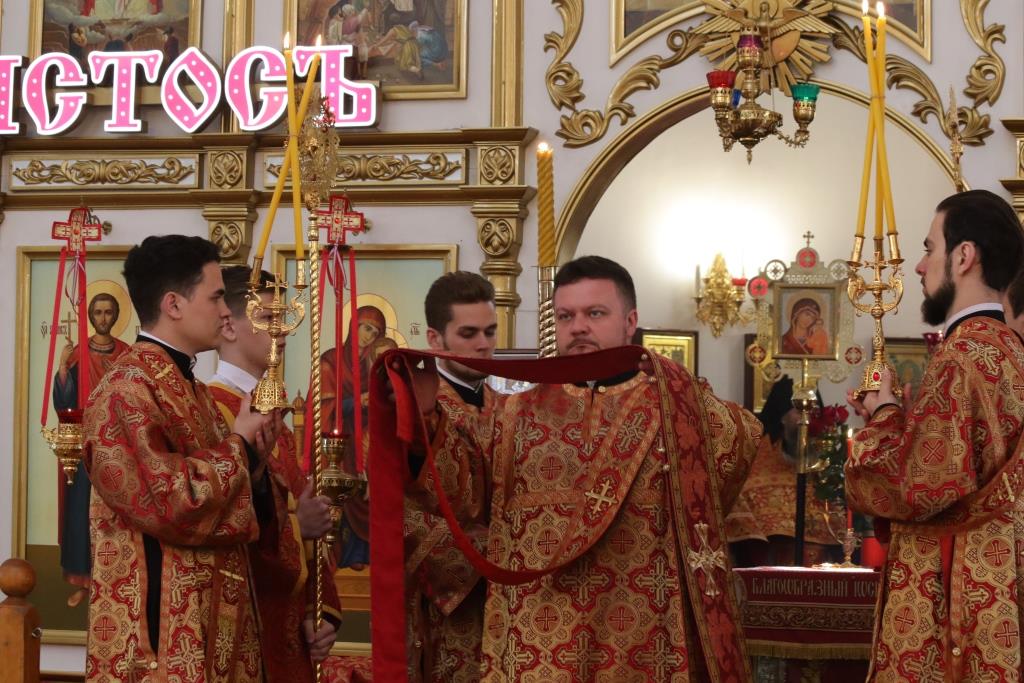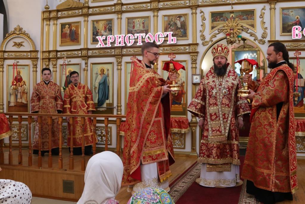 Божественная Литургия началась торжественным возглашением гимна победы Господа Иисуса Христа над смертью – троекратным пением пасхального тропаря «Христос воскресе из мертвых». Перед причастием мирян проповедовал ключарь кафедрального собора.