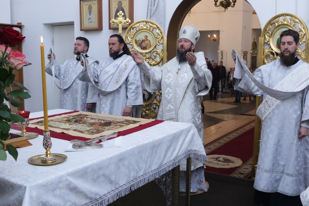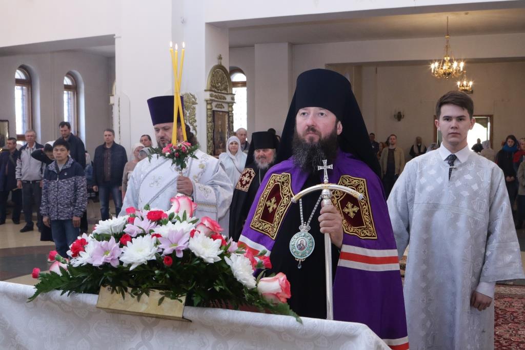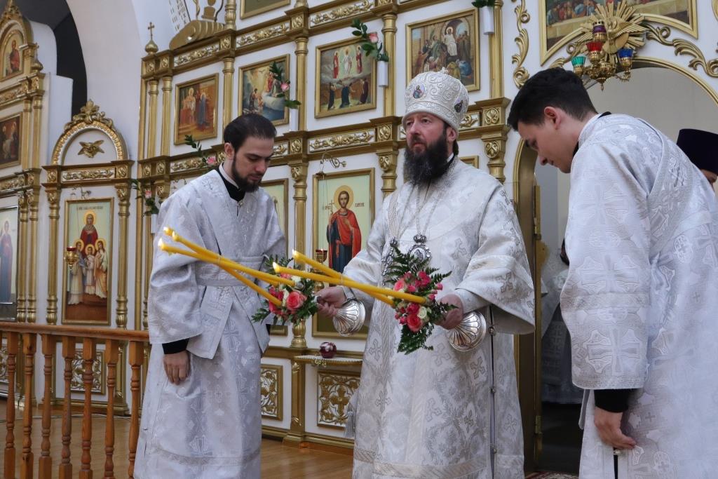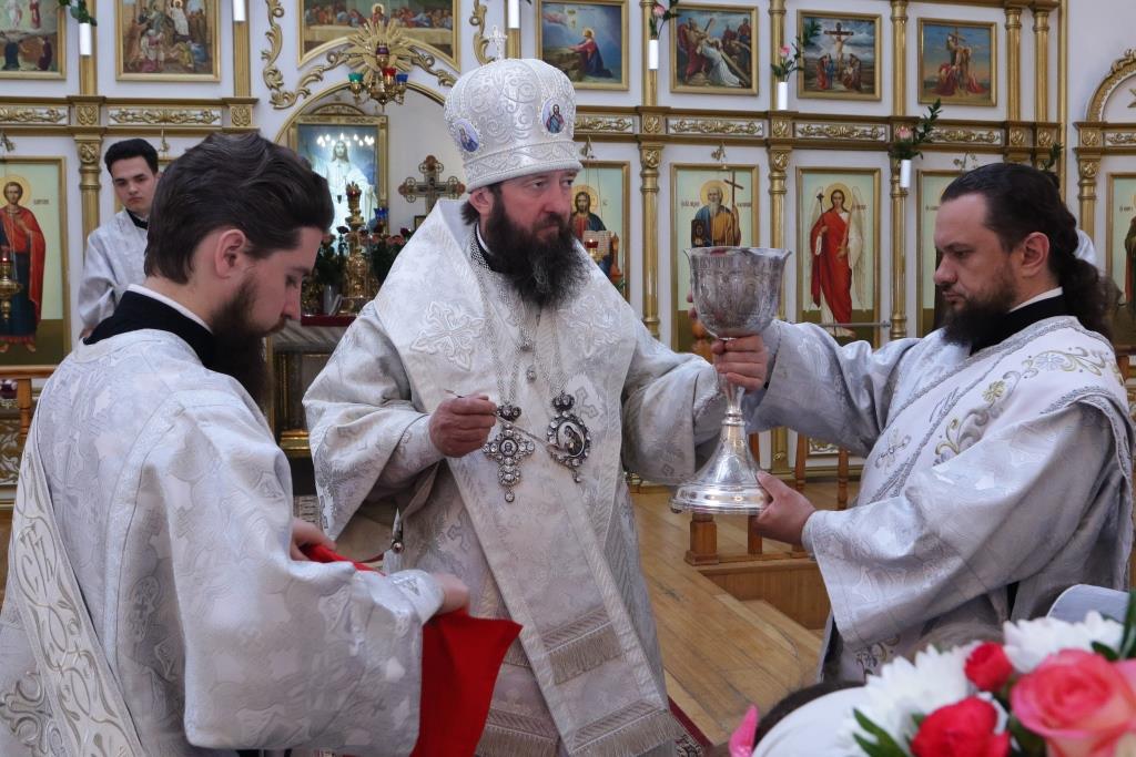 Перед причастием мирян проповедовал ключарь кафедрального собора. Праздничное богослужение завершилось славлением Господу и Спасителю Иисусу Христу, после чего Владыка епископ обратился к молящимся со словами проповеди.
