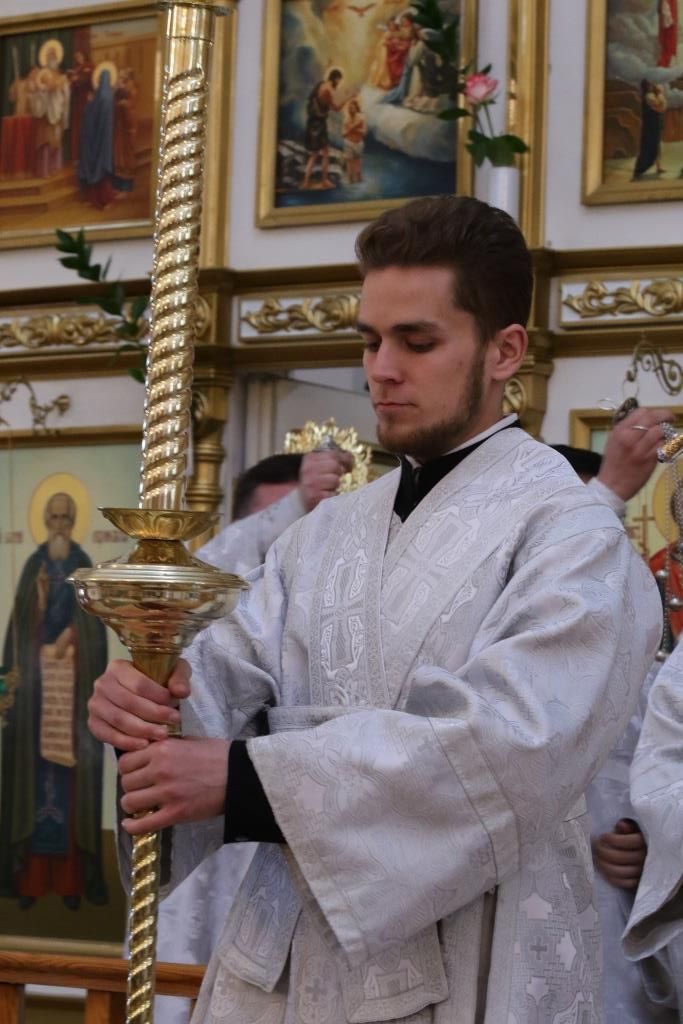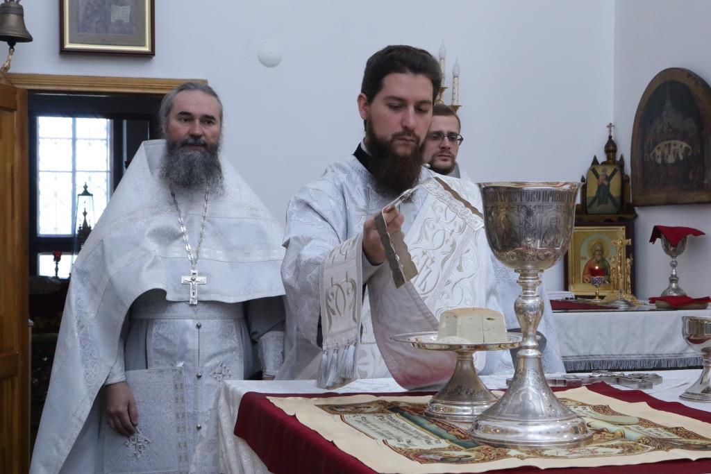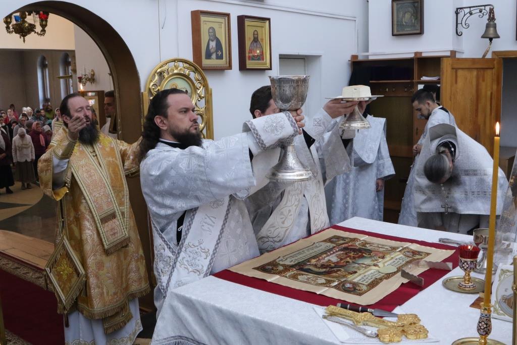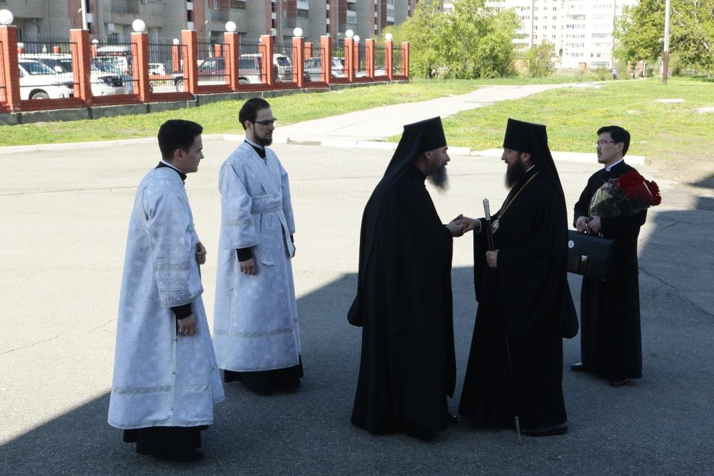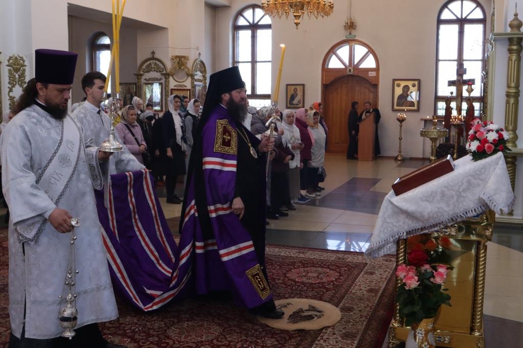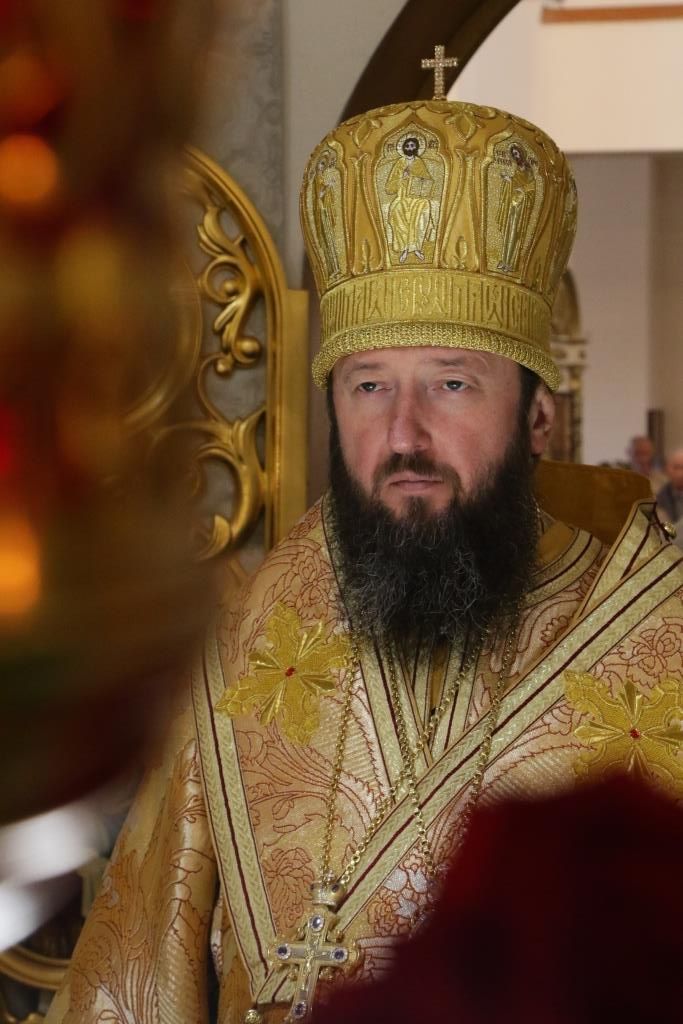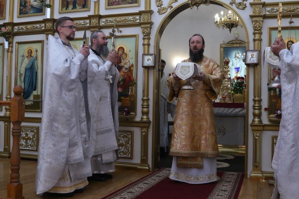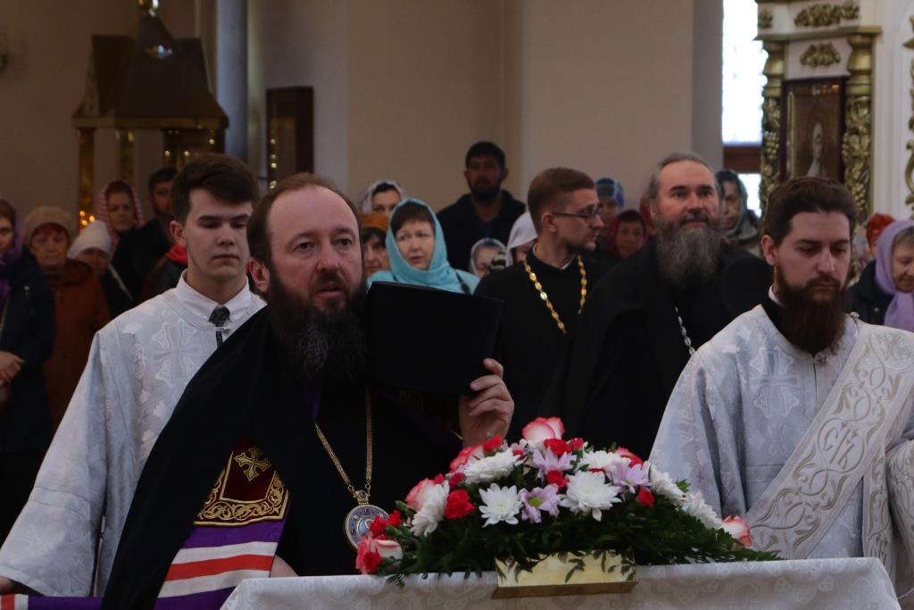 Преосвященнейшему Владыке сослужили: духовник епархии архимандрит Спиридон (Теплухин), ключарь кафедрального собора иеромонах Никодим (Авдеев), клирики собора иерей Алексий Клепиков, иерей Константин Дьяков, протодиакон Андрей Дудник, иеродиакон Мефодий (Шевчук), диакон Владимир Лаврешин, секретарь епархии диакон Илия Кван.