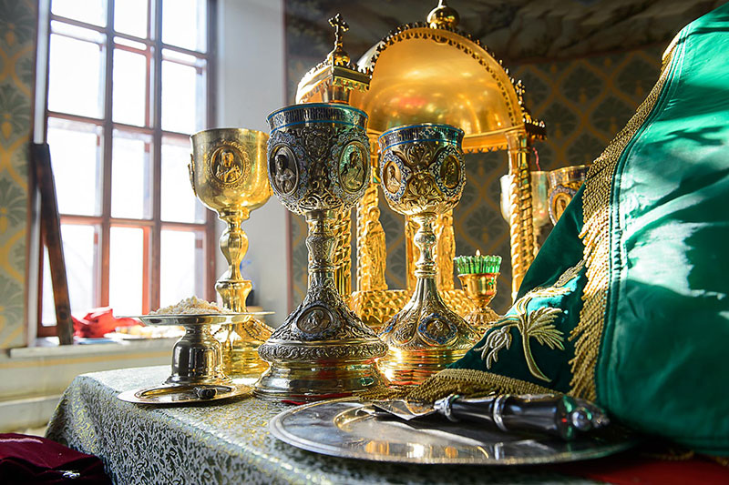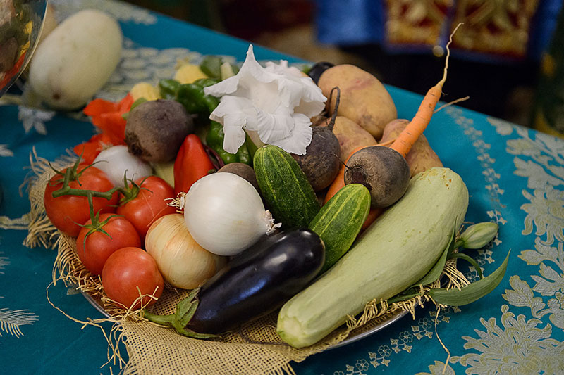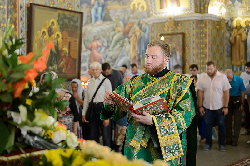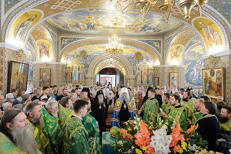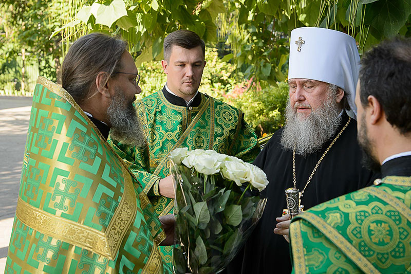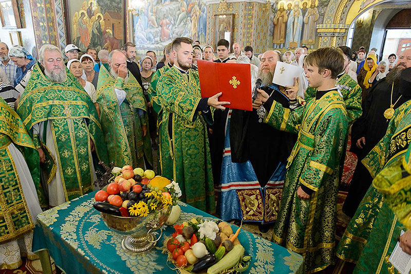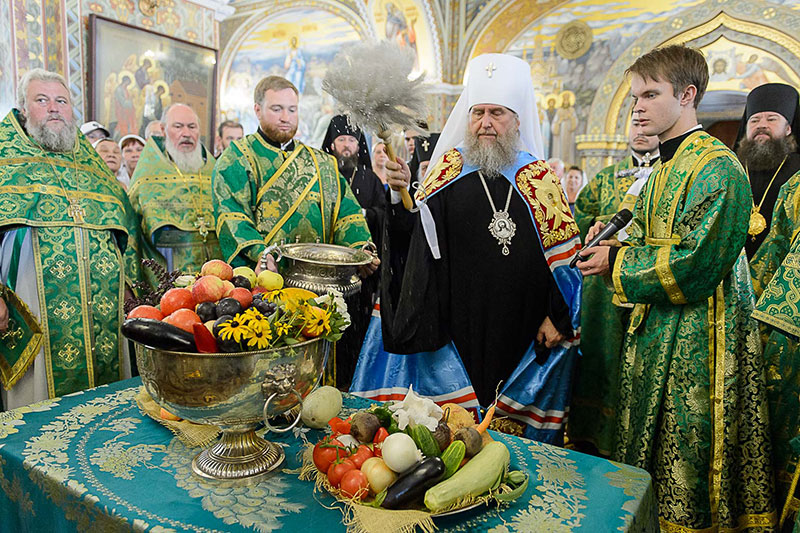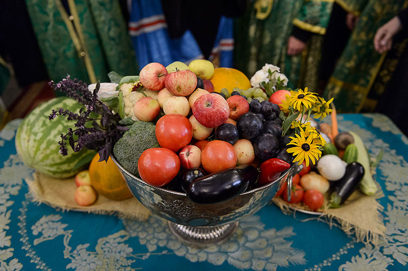 По старинной традиции, связанной с Ильиным днем, владыка митрополит совершил чин освящения плодов нового урожая – прочитал молитву «О приносящих начатки овощей»: «Владыко Господи Боже наш, Твоя от Твоих приносити Тебе по предложению комуждо повелевый...» и окропил овощи и фрукты святой водой.