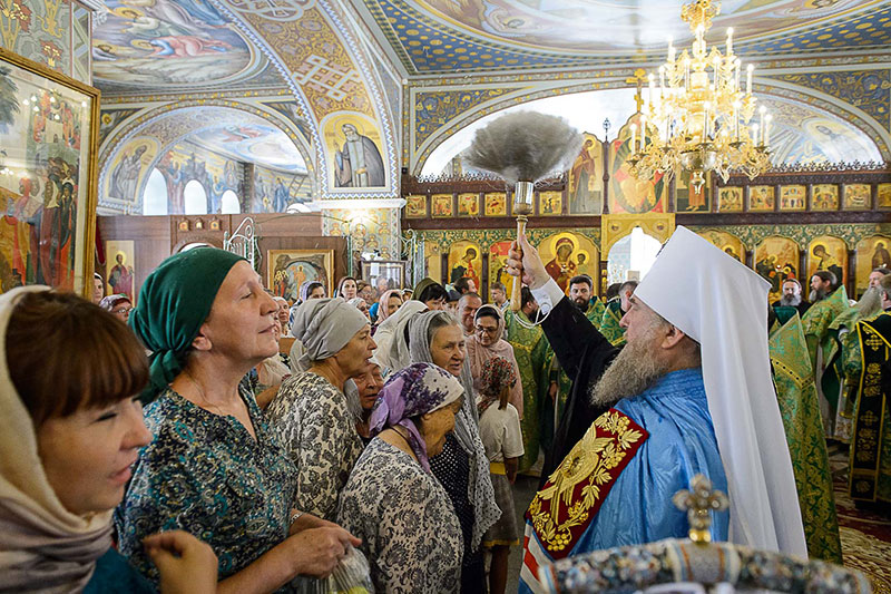 При пении тропаря и величания пророку Илии владыка митрополит окропил святой водой собравшихся.