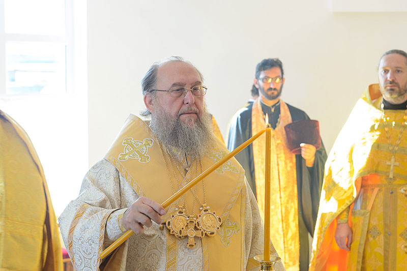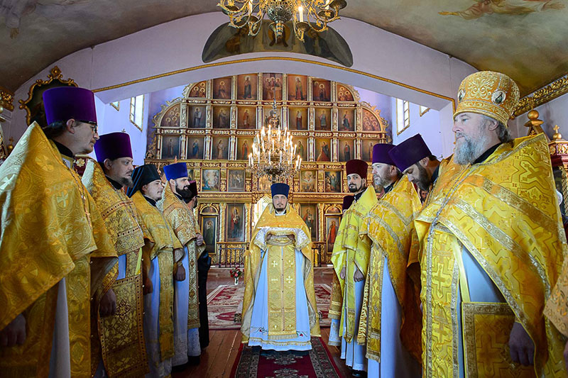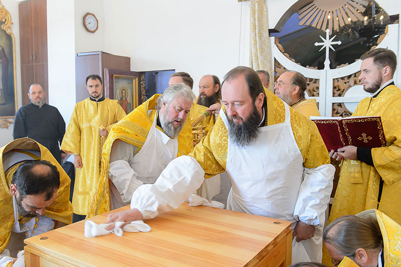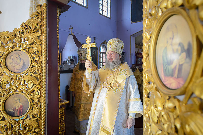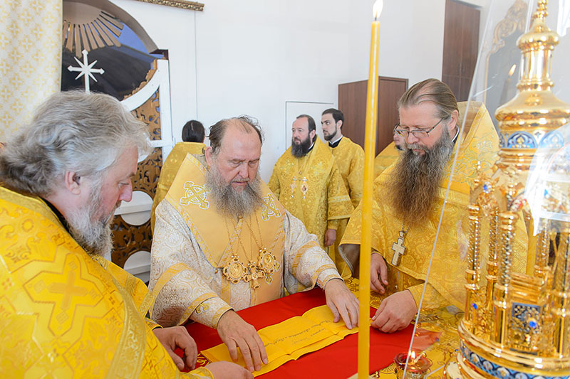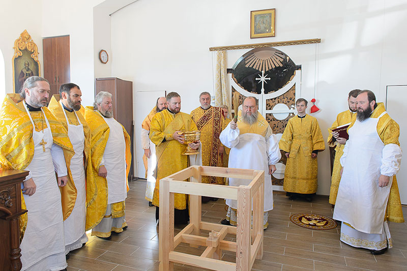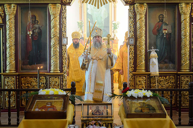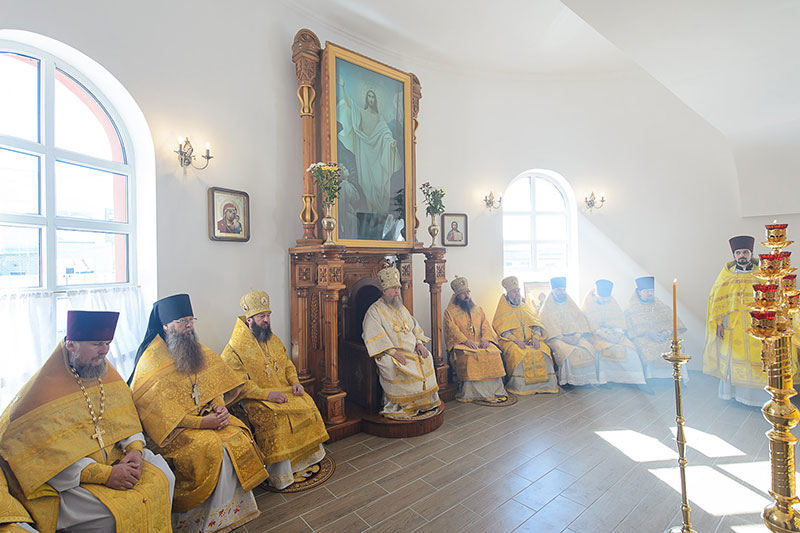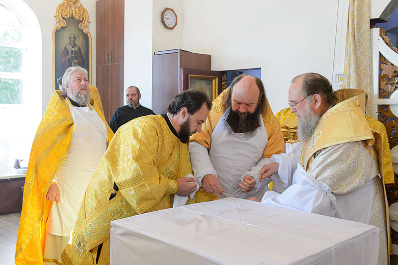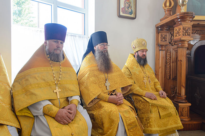 За богослужением великого освящения и Божественной Литургией Предстоятелю Православной Церкви Казахстана сослужили: викарий Астанайской епархии епископ Талдыкорганский Нектарий, епископ Усть-Каменогорский и Семипалатинский Амфилохий; настоятель храма в честь иконы Пресвятой Богородицы «Всех скорбящих радость» протоиерей Евгений Воробьев, благочинный Талдыкорганского церковного округа иеромонах Клавдиан (Поляков), ключарь Петропавловского храма Алма-Аты протоиерей Кирилл Шкляр, ключарь храма Веры, Надежды, Любови и Софии – Представительства Митрополичьего округа в Москве – иерей Сергий Неретин, помощник Главы Митрополичьего округа иерей Георгий Сидоров, духовенство Талдыкорганского благочиния, диаконский чин возглавил клирик Вознесенского кафедрального собора города Алма-Аты протодиакон Николай Гринкевич.