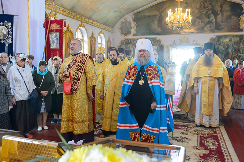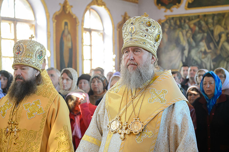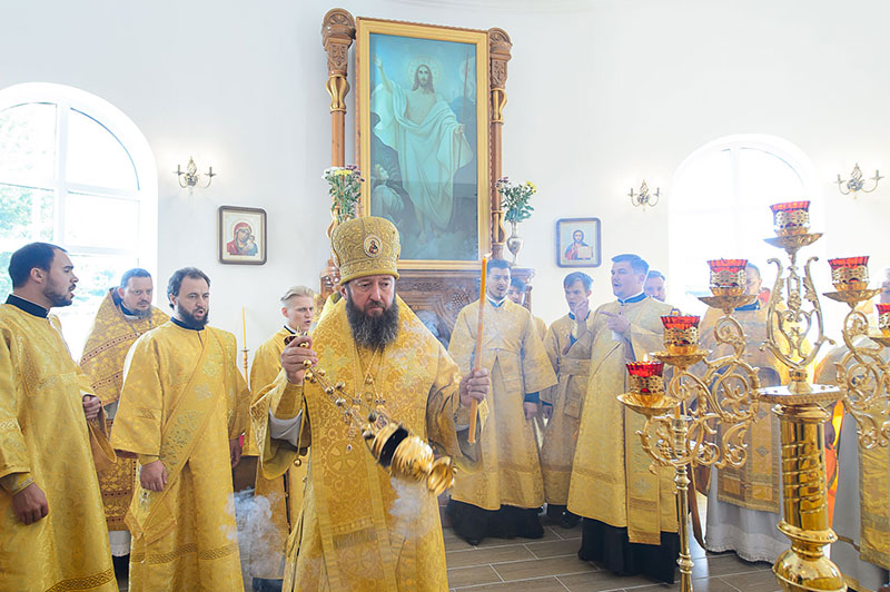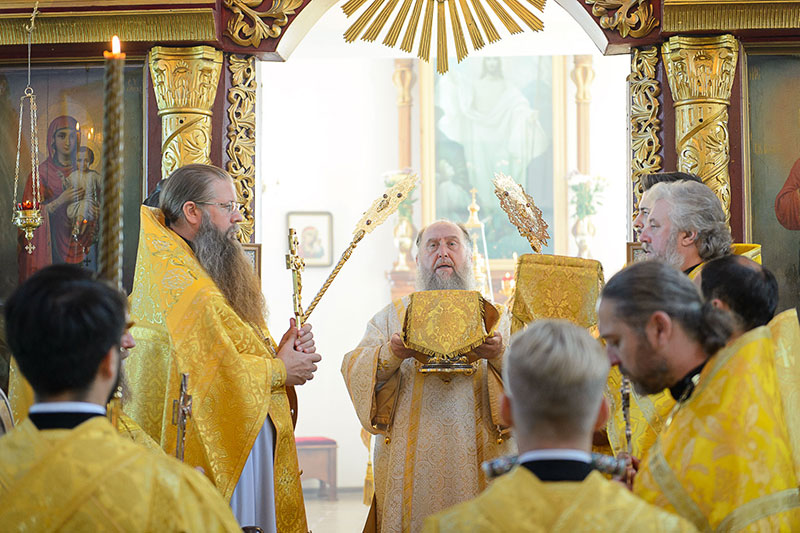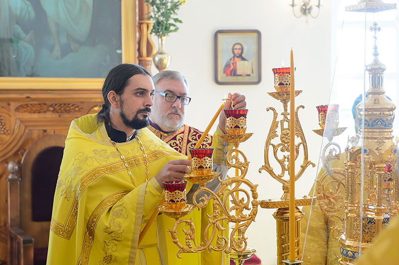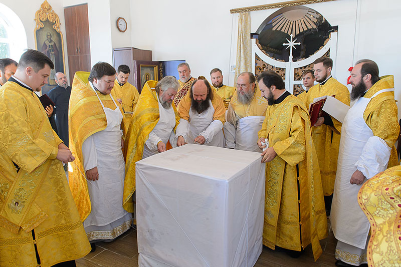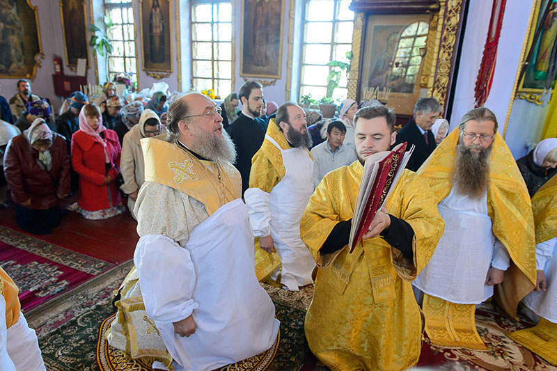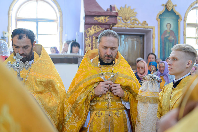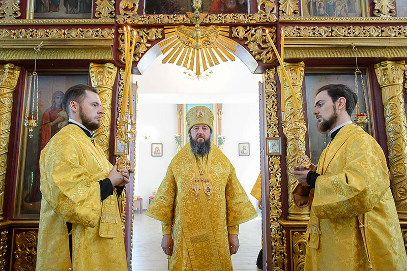 За богослужением великого освящения и Божественной Литургией Предстоятелю Православной Церкви Казахстана сослужили: викарий Астанайской епархии епископ Талдыкорганский Нектарий, епископ Усть-Каменогорский и Семипалатинский Амфилохий; настоятель храма в честь иконы Пресвятой Богородицы «Всех скорбящих радость» протоиерей Евгений Воробьев, благочинный Талдыкорганского церковного округа иеромонах Клавдиан (Поляков), ключарь Петропавловского храма Алма-Аты протоиерей Кирилл Шкляр, ключарь храма Веры, Надежды, Любови и Софии – Представительства Митрополичьего округа в Москве – иерей Сергий Неретин, помощник Главы Митрополичьего округа иерей Георгий Сидоров, духовенство Талдыкорганского благочиния, диаконский чин возглавил клирик Вознесенского кафедрального собора города Алма-Аты протодиакон Николай Гринкевич.