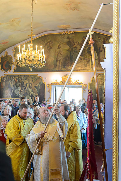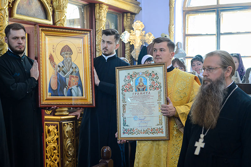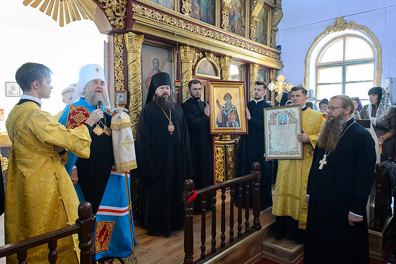 В благословение приходу архипастырь передал образ святителя Спиридона Тримифунтского. Отцу благочинному вручена Грамота о великом освящении храма.