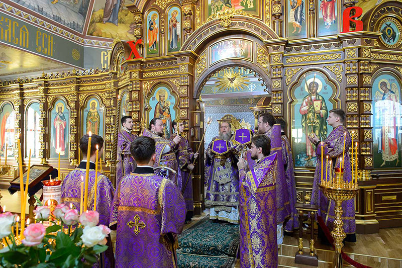 Литургия завершилась славлением перед Крестом Господним – духовенство, хор, монашествующие и прихожане пропели тропарь, кондак и величание празднику, а также стихиру «Кресту Твоему покланяемся, Владыко...».