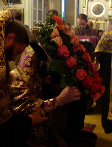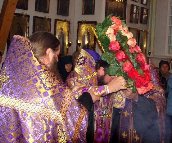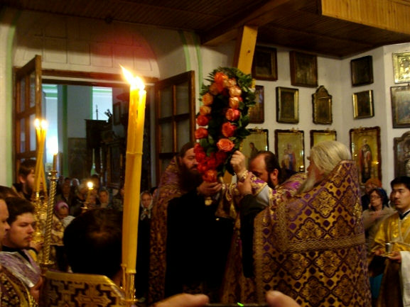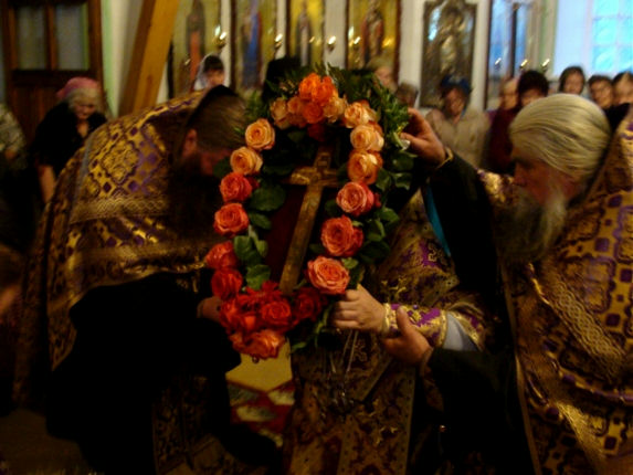 А между тем, в храме таинственно отверсты двери святого алтаря. И Преосвященнейший владыка Амфилохий, держа над собой и над всем народом Крест Господень сходит с кафедры и поставляет Его на специально приготовленном аналое. И стоя уже перед Крестом все духовенство храма трижды поют «Кресту Твоему поклоняемся, Владыко…» и совершают три земных поклона.