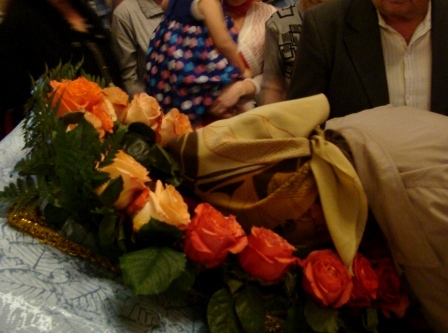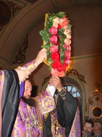 Так и в нашем храме сегодня, за вечернем богослужением Владыка Амфилохий в полном облачении, как при совершении Литургии, окруженный сонмом духовенства, посередине храма держал высоко над головой и над молящимися украшенный алыми розами Крест, а священники орошали Распятие благовонной водой, тем самым, соучаствуя в чине Воздвижения. «Именно так патриарх Макарий поднимал крест над многотысячным народом, а священство помогало ему, – объяснил прихожанам в своей проповеди владыка. Именно так патриарх Макарий поднимал крест над многотысячным народом, а священство помогало ему.