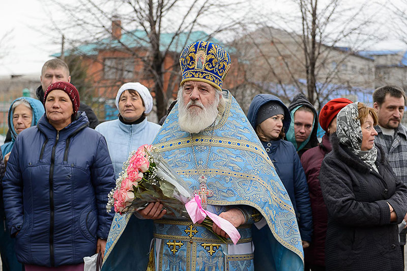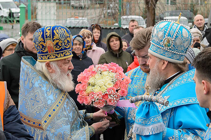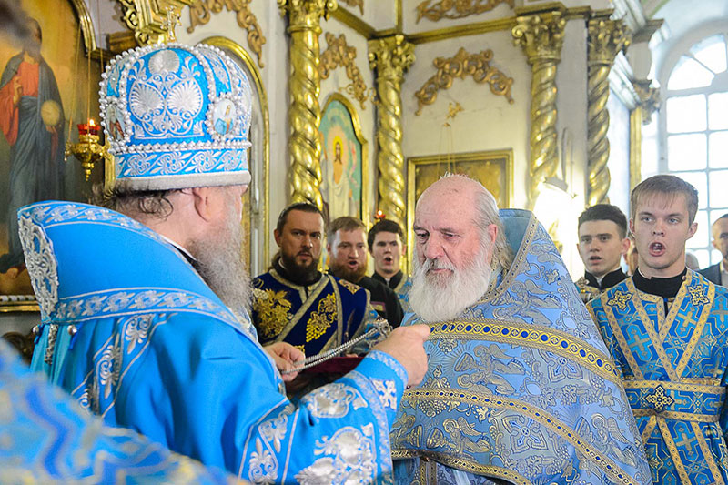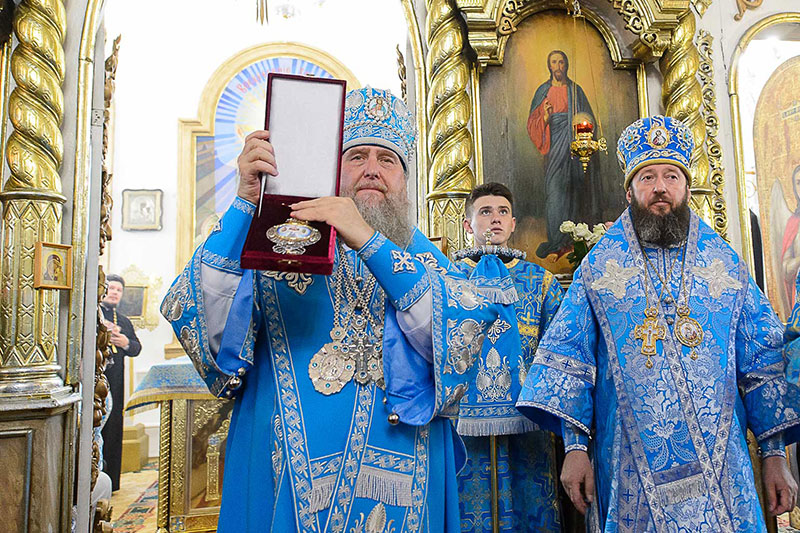 После произнесения проповеди на память о состоявшемся праздновании Глава Православной Церкви Казахстана в дар старейшему храму города передал напрестольный крест, а ключарю Воскресенского собора протоиерею Феодору Проскурину подарил крест с украшениями.