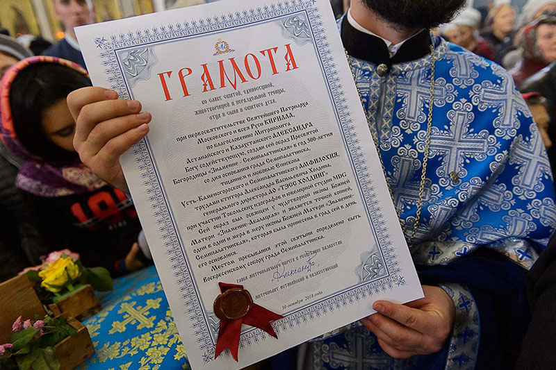 По запричастном стихе было оглашено Обращение Главы Казахстанского Митрополичьего округа митрополита Астанайского и Казахстанского Александра по случаю 300-летия со дня основания города Семипалатинска.
