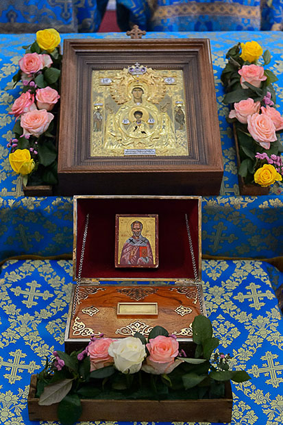 На аналое в центре храма пребывал ковчег с частью мощей святителя и чудотворца Николая, архиепископа Мир Ликийских, который накануне был доставлен на землю Рудного Алтая митрополитом Астанайским и Казахстанским Александром.