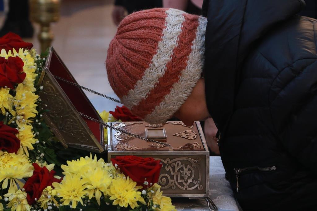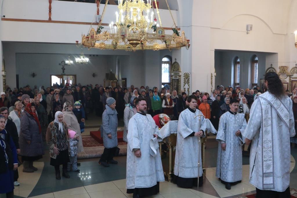 Песнопения Божественной Литургии и вселенской панихиды исполнял хор Андреевского собора под управлением регента Н. Романцовой. За Богослужением молились прихожане главного храма Рудного Алтая, насельники Свято-Троицкого мужского монастыря, сотрудники епархиального управления и паломники к мощам святителя Николая Чудотворца. Перед причастием мирян проповедовал иерей Константин Дьяков.