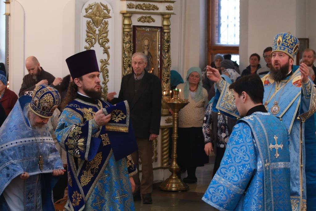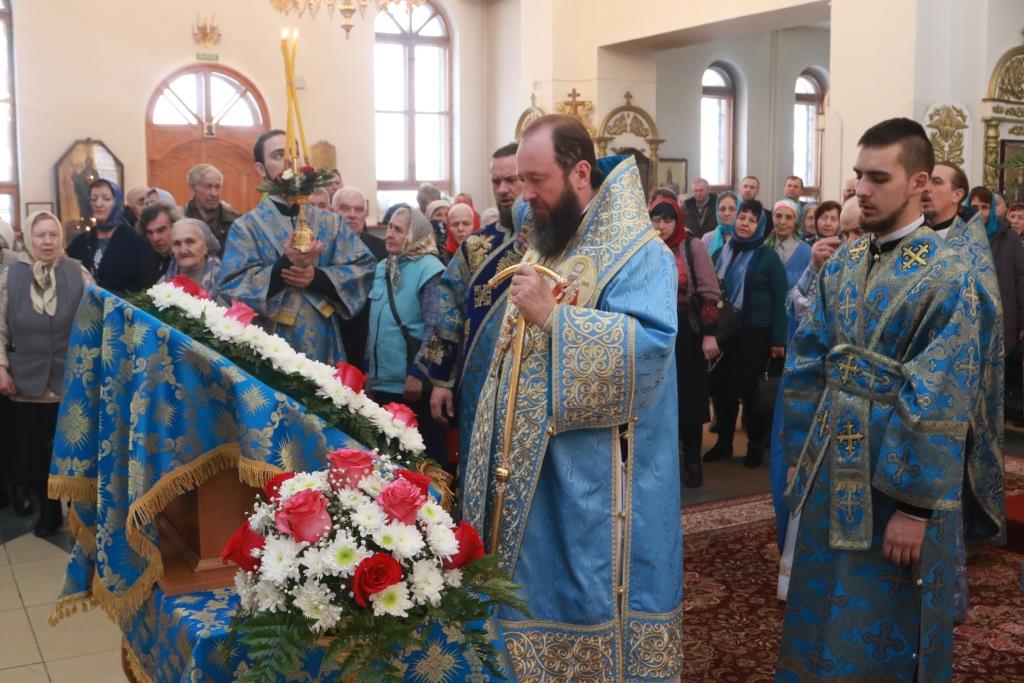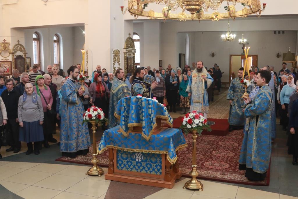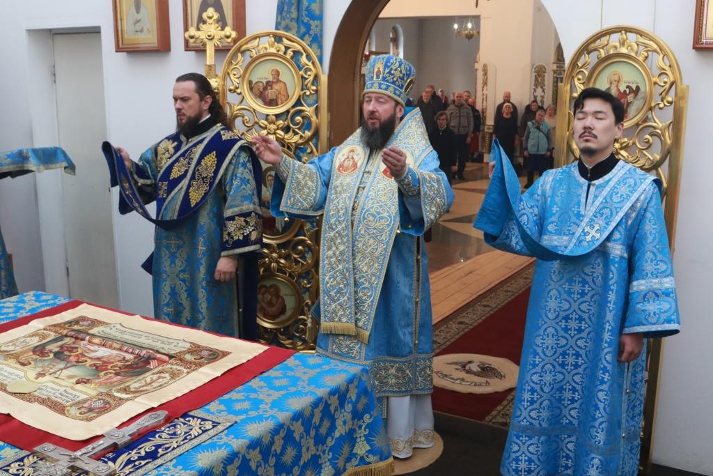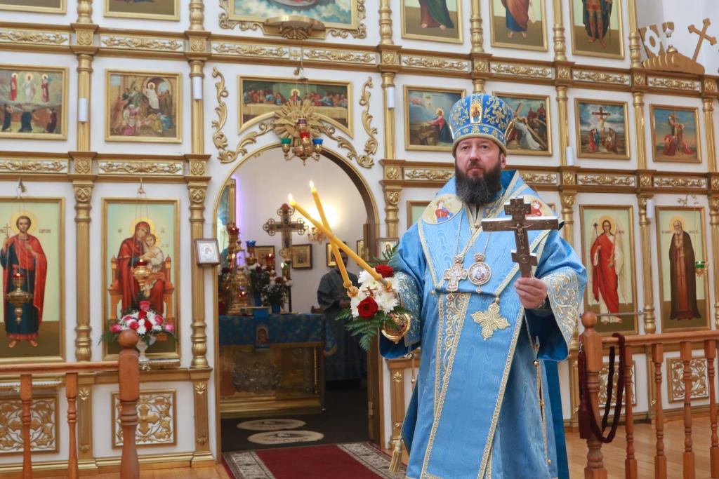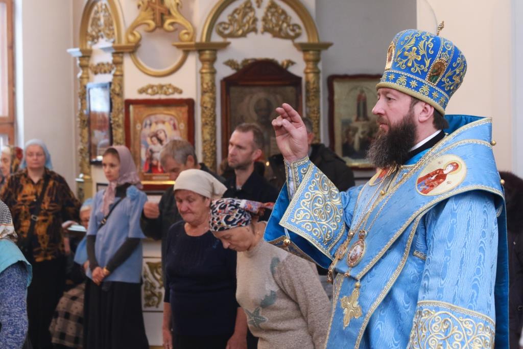 В завершение богослужения Архипастырь и духовенство совершили славление Пресвятой Богородицы перед праздничной иконой. По окончании Литургии Преосвященнейший Владыка обратился к молящимся со словами наставления.