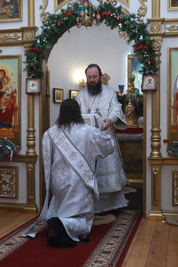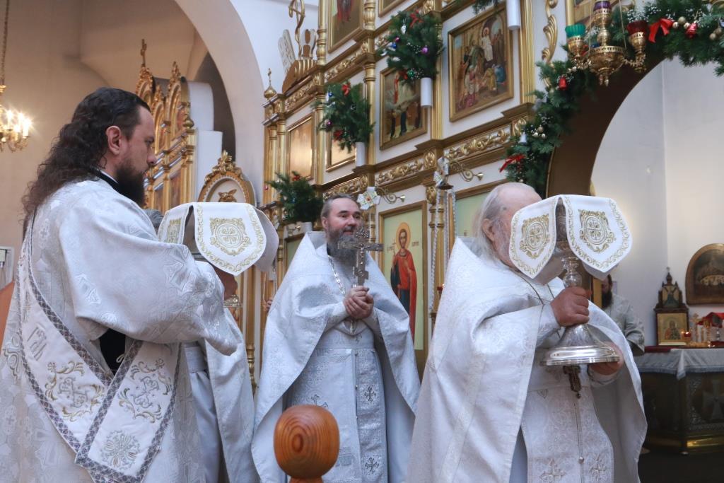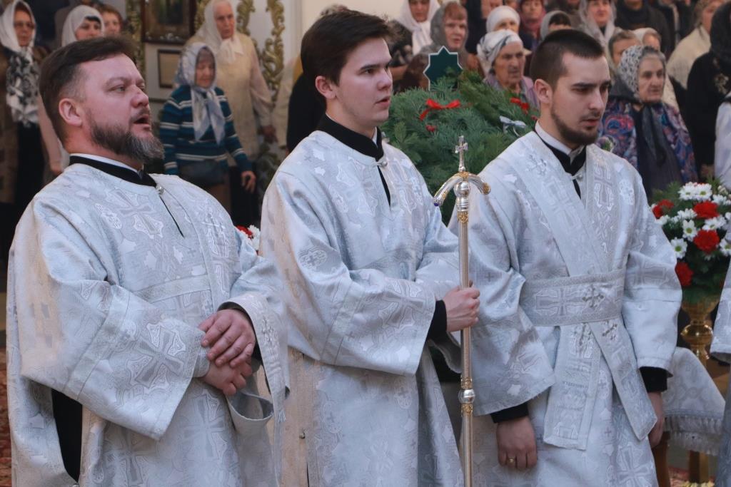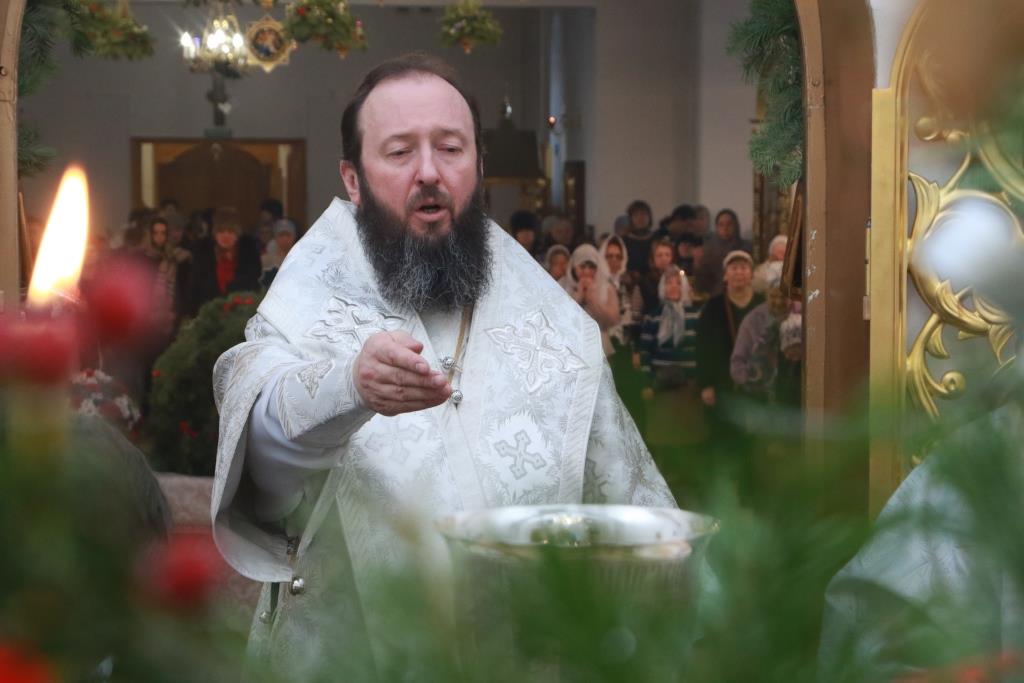 Песнопения Божественной Литургии и Навечерия Рождества Христова исполнял хор Андреевского собора под управлением Н. Романцовой. После причащения духовенства иеромонах Никодим (Авдеев) обратился к многочисленным прихожанам со словами проповеди.