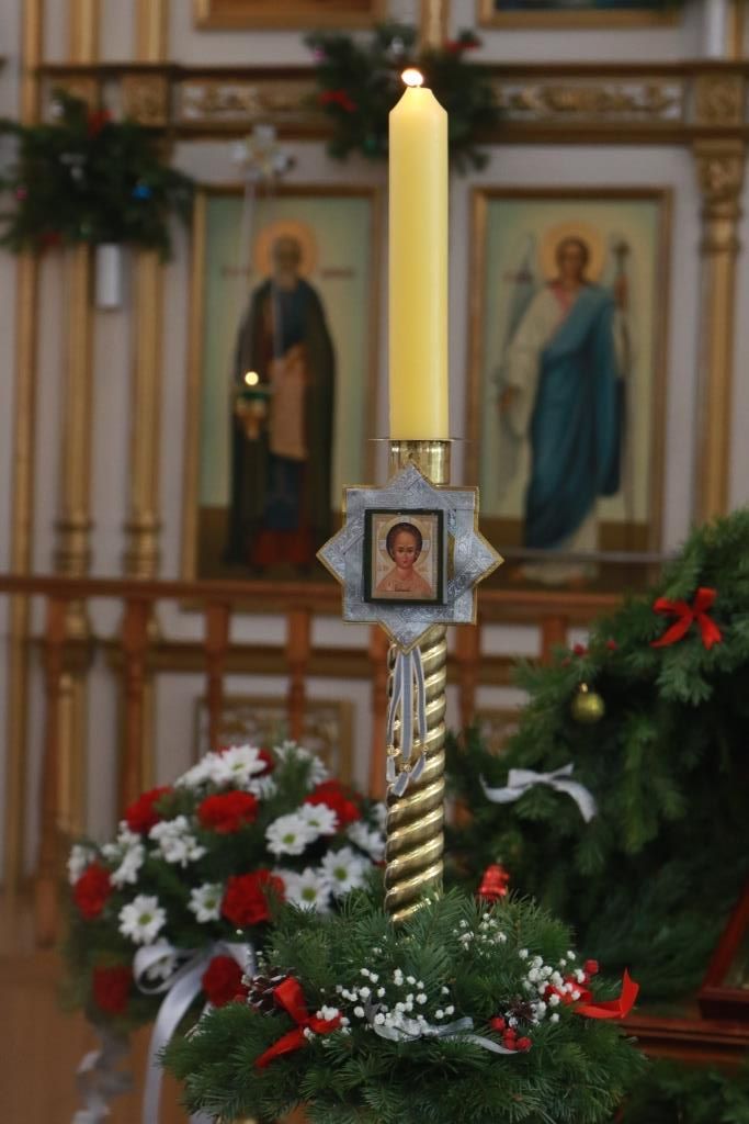 После Литургии была совершена великая вечерня с чтением Евангелия, которому предшествовало чтение восьми паремий праздника Рождества Христова. По отпусте вечерни на середину храма был изнесен горящий светильник, знаменующий собой грядущее Рождество Богомладенца Еммануила, и около него священнослужители пропели тропарь и кондак Рождества Христова. В заключение Богослужения Преосвященнейший епископ Амфилохий поздравил духовенство и мирян с наступающим праздником:
