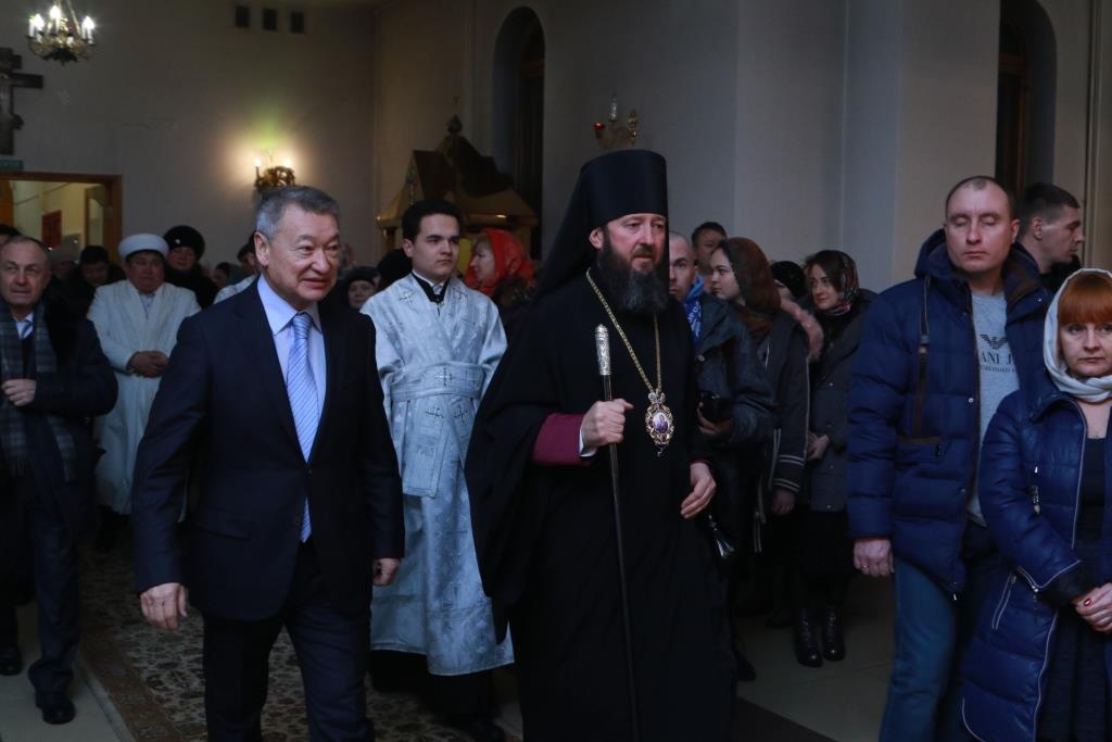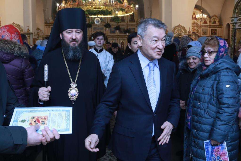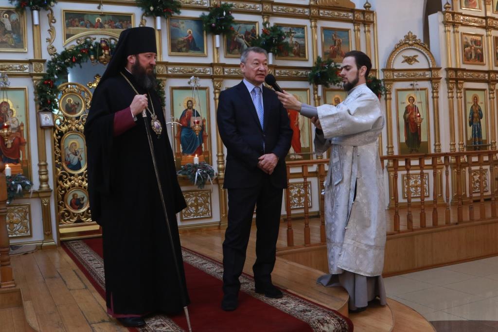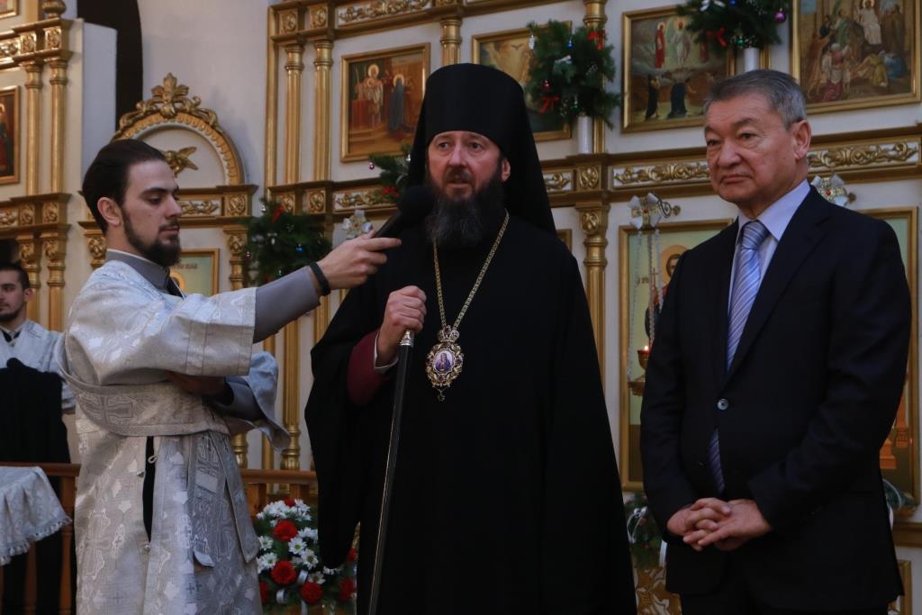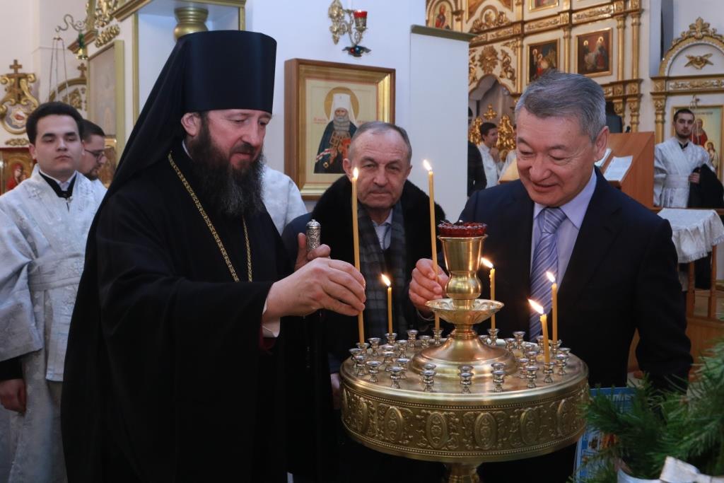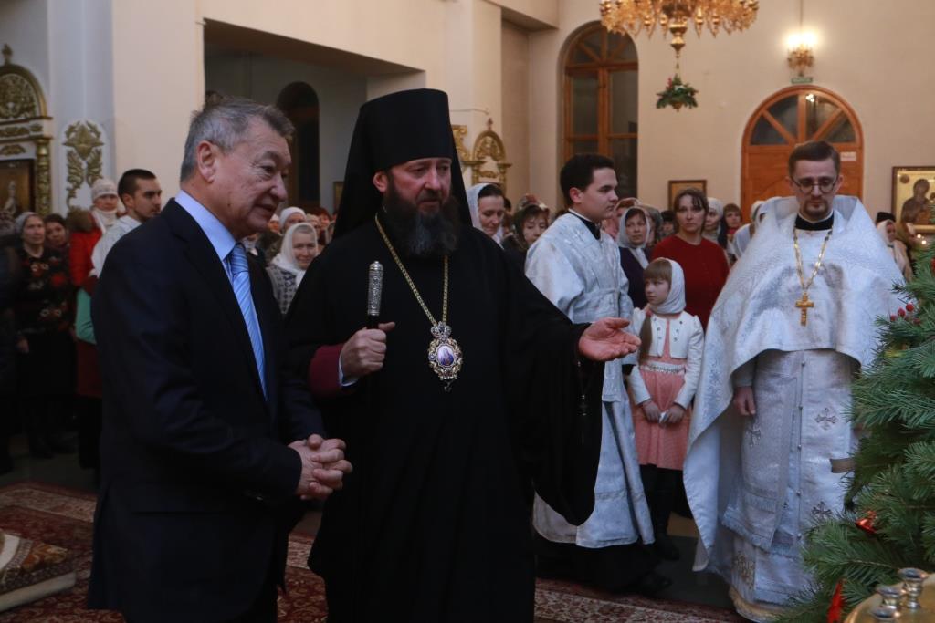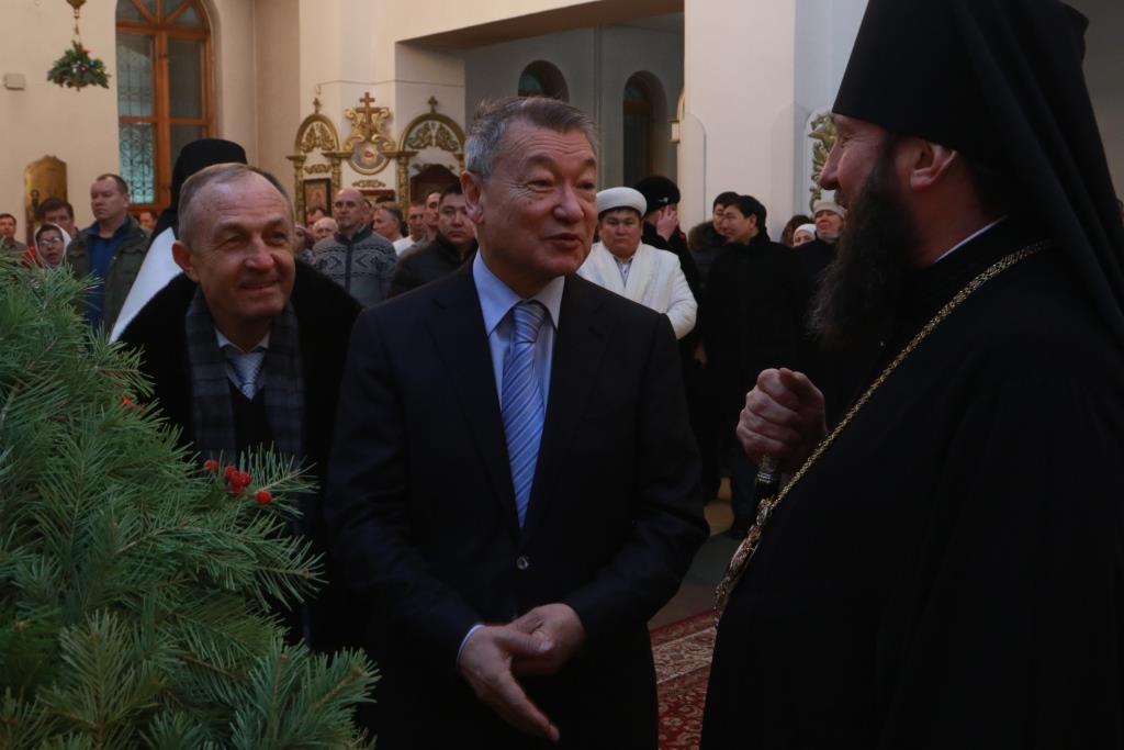 Высоких гостей встречал епископ Амфилохий, духовенство и многочисленные прихожане кафедрального собора. Управляющий Усть-Каменогорской епархией поблагодарил гостей за визит, отметив, что благодаря Всевышнему Творцу и разумной политике Главы нашего государства, а также взаимоуважению и взаимопониманию в Казахстане царят спокойствие и согласие. Единство, сплоченность и твердость духа казахстанцев способствовали активному развитию гражданского и межконфессионального согласия. Епископ Амфилохий поздравил Даниала Кенжетаевича с праздником Рождества Христова, пожелав руководителю области крепкого здоровья и плодотворного труда на благо Восточно-Казахстанской области и всего казахстанского общества. В ответном слове Д.К. Ахметов поздравил Архипастыря и всех православных христиан с великим праздником Рождества Христова. Глава области отметил, что суверенный Казахстан за годы независимости стал образцом мирного сосуществования представителей различных этносов, религиозных конфессий и культур. Государственная власть, духовные лидеры, общественность Казахстана сообща трудятся над созданием сильного, динамичного, современного государства. Большое место в этом процессе занимает Православие. Православная Церковь помогает людям обрести веру и покой, укрепляя их на жизненном пути; она играет заметную роль в упрочении института семьи, материнства и детства, гармонизации межнациональных и межрелигиозных отношений, внося огромный вклад в развитие духовного единства, укрепления дружбы и межконфессионального согласия в стране. Даниал Кенжетаевич призвал прихожан и паломников с любовью относиться к духовным традициям многонационального Казахстана, указав, что взаимное уважение и братская поддержка являются гарантом мирного развития нашего Отечества.