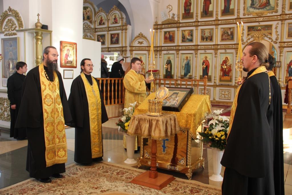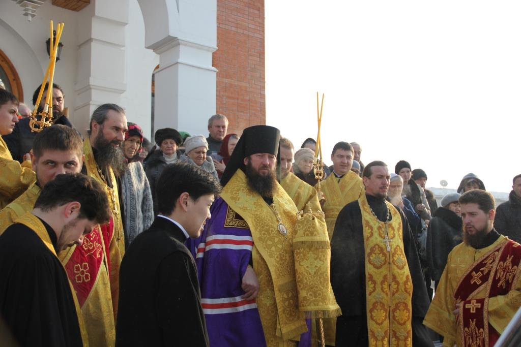 После Божественной Литургии Преосвященный Епископ Усть-Каменогорский и Семипалатинский Амфилохий в сослужении духовенства кафедрального собора совершил молебен Святителю Луке с возношением ему молитвы, после чего под многократное пение величания и колокольный звон Преосвященный Владыка изнес святые мощи из кафедрального собора. У порога храма Архипастырь осенил народ святыней, после чего ковчег принял благочинный Семипалатинского церковного округа протоиерей Феодор Проскурин. Честные мощи Святителя и врача Луки отбыли во второй кафедральный город Усть-Каменогорской епархии – Семипалатинск, дабы молитвенно утешить живущих там православных христиан.