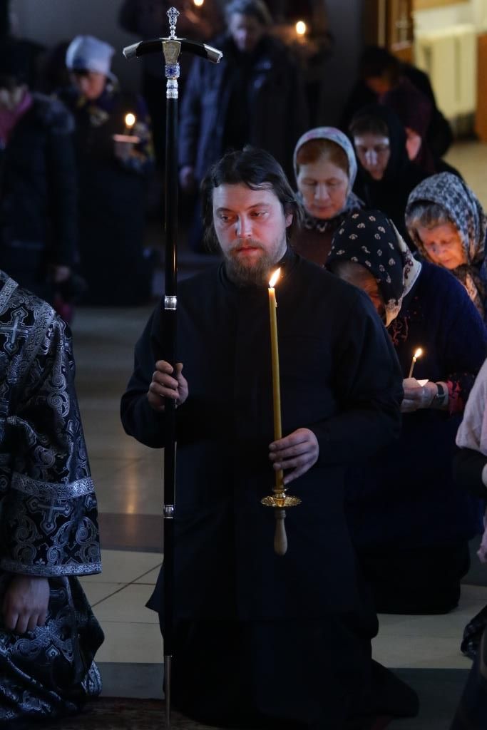 В среду первой седмицы Святой Четыредесятницы в Андреевском кафедральном соборе были совершены уставные великопостные богослужения – утреня, часы, изобразительны и вечерня в соединении с Литургией Преждеосвященных Даров. В среду вечером Преосвященнейший епископ Амфилохий возглавил служение Великого повечерия с чтением третьей части Великого покаянного канона преподобного Андрея Критского.