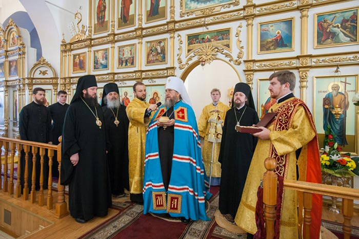 По прибытии Глава Митрополичьего Округа посетил Свято-Андреевский кафедральный собор, расположенный на территории Свято-Троицкого мужского монастыря, где совершил молитву перед святынями.