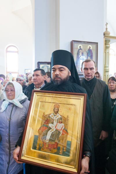 Благочинный Усть-Каменогорского церковного округа иерей Алексий Анищенко в дар от благочиния преподнес епископу Амфилохию икону «Спас – Великий Архиерей».