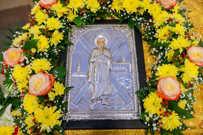 Литургия завершилась славлением перед иконой апостола Андрея Первозванного и ковчегом с мощами священноисповедника Луки, по окончании которого Глава Православной Церкви Казахстана обратился к собравшимся с архипастырским словом.