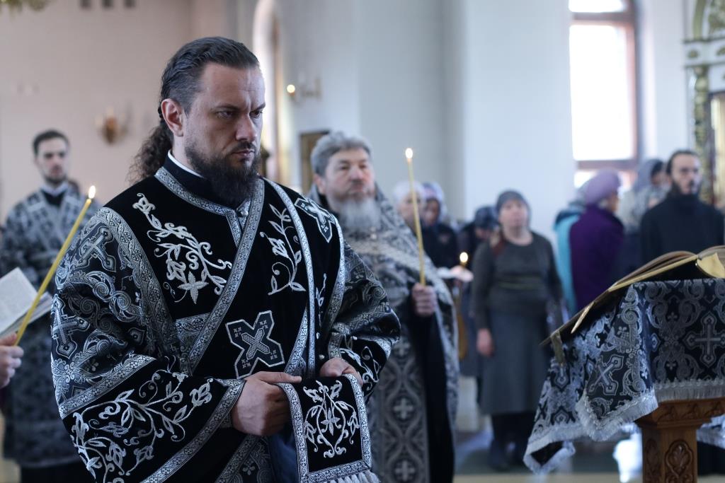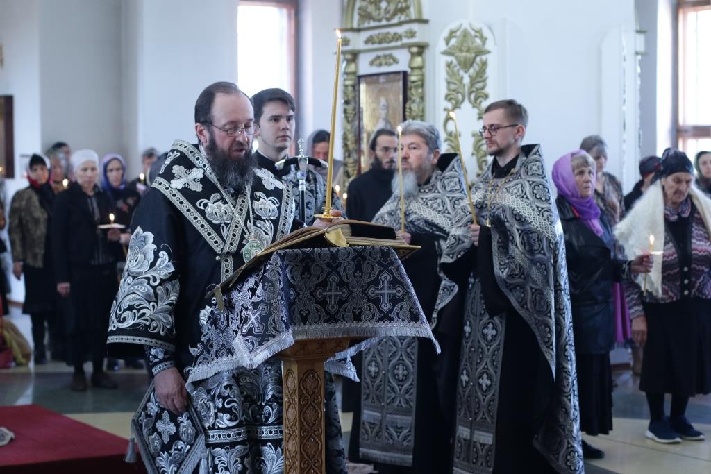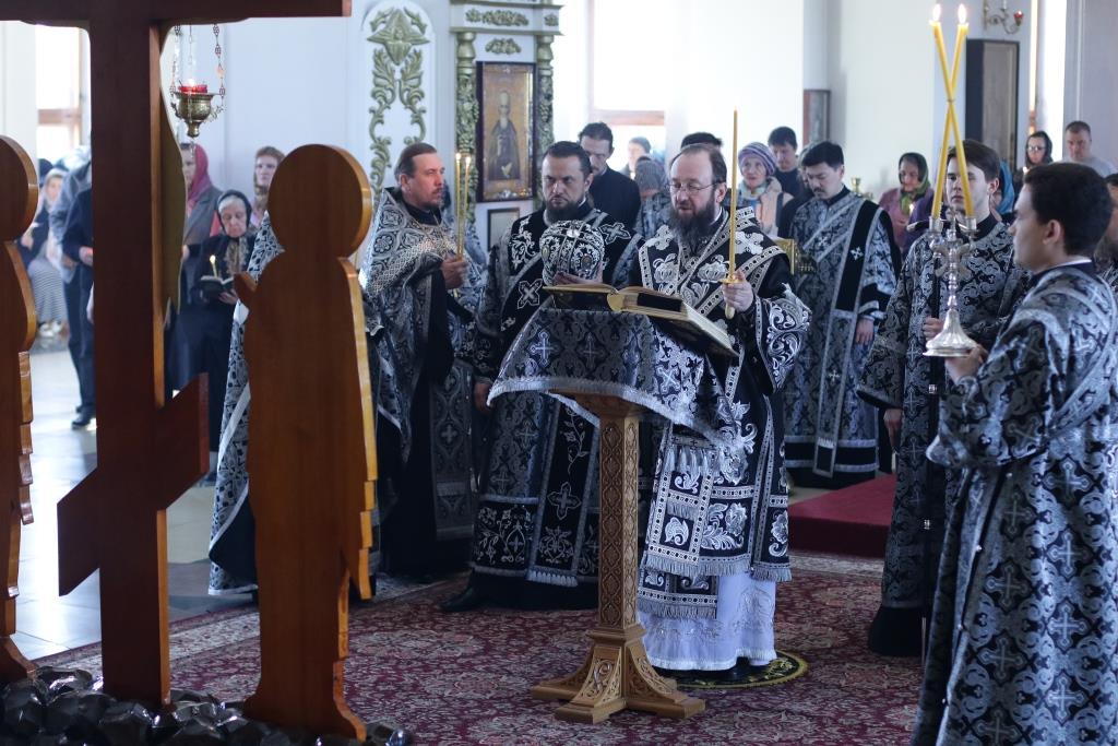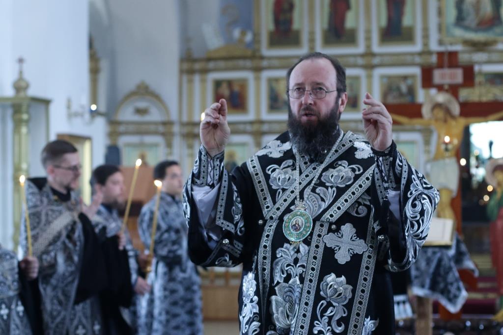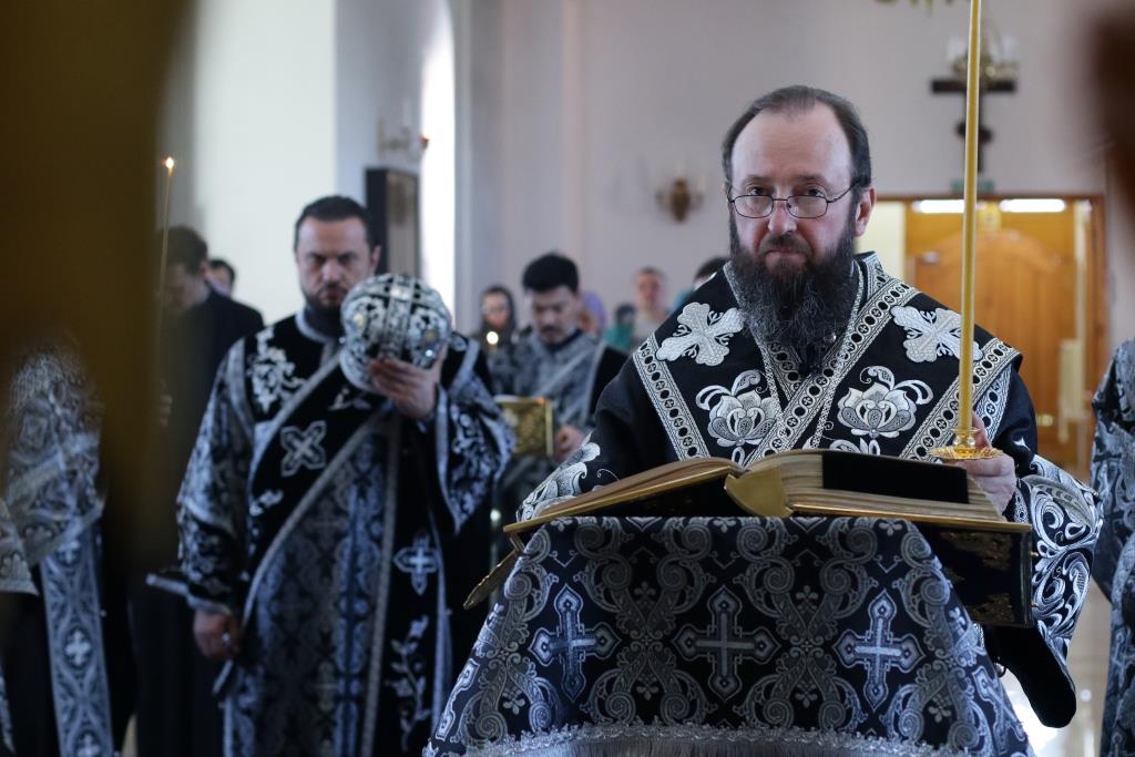 Архипастырю сослужили: духовник епархии архимандрит Спиридон (Теплухин), ключарь кафедрального собора иеромонах Никодим (Авдеев), протоиерей Николай Темирбаев, клирики собора иерей Алексий Клепиков, иерей Константин Дьяков, секретарь епархии диакон Илия Кван, протодиакон Андрей Дудник, диакон Владимир Лаврешин. Песнопения последования Страстных Евангелий исполнял хор Андреевского собора под управлением Н. Романцовой. За великопостным богослужением молились сотрудники епархиального управления, прихожане кафедрального соборного храма, братия Свято-Троицкого мужского монастыря.