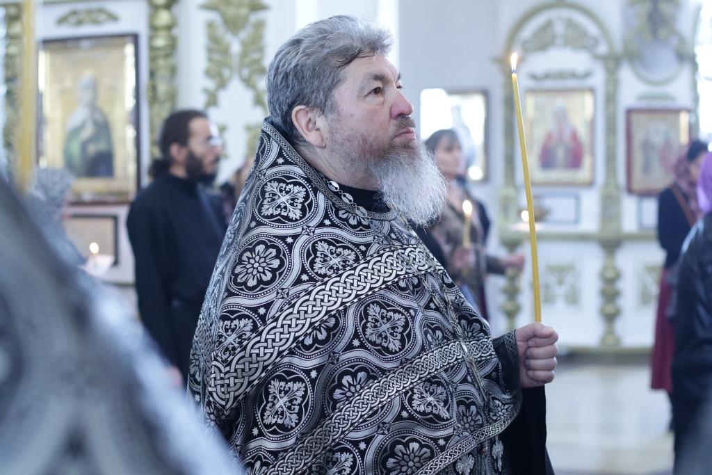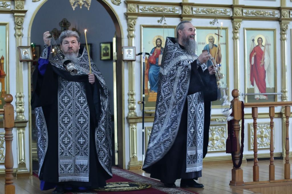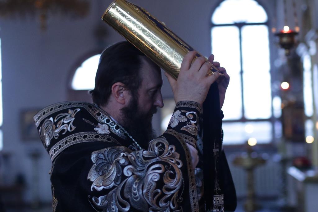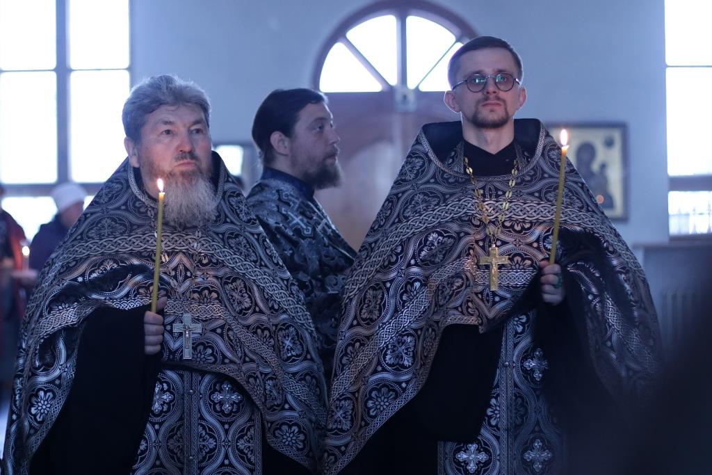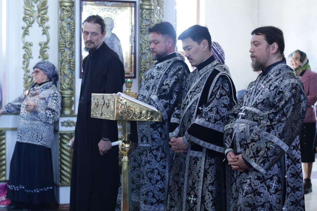 Архипастырю сослужили: духовник епархии архимандрит Спиридон (Теплухин), ключарь кафедрального собора иеромонах Никодим (Авдеев), протоиерей Николай Темирбаев, клирики собора иерей Алексий Клепиков, иерей Константин Дьяков, секретарь епархии диакон Илия Кван, протодиакон Андрей Дудник, диакон Владимир Лаврешин. Песнопения последования Страстных Евангелий исполнял хор Андреевского собора под управлением Н. Романцовой. За великопостным богослужением молились сотрудники епархиального управления, прихожане кафедрального соборного храма, братия Свято-Троицкого мужского монастыря.