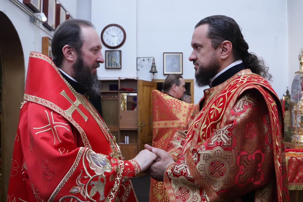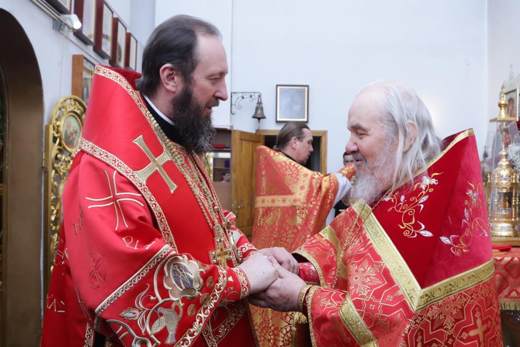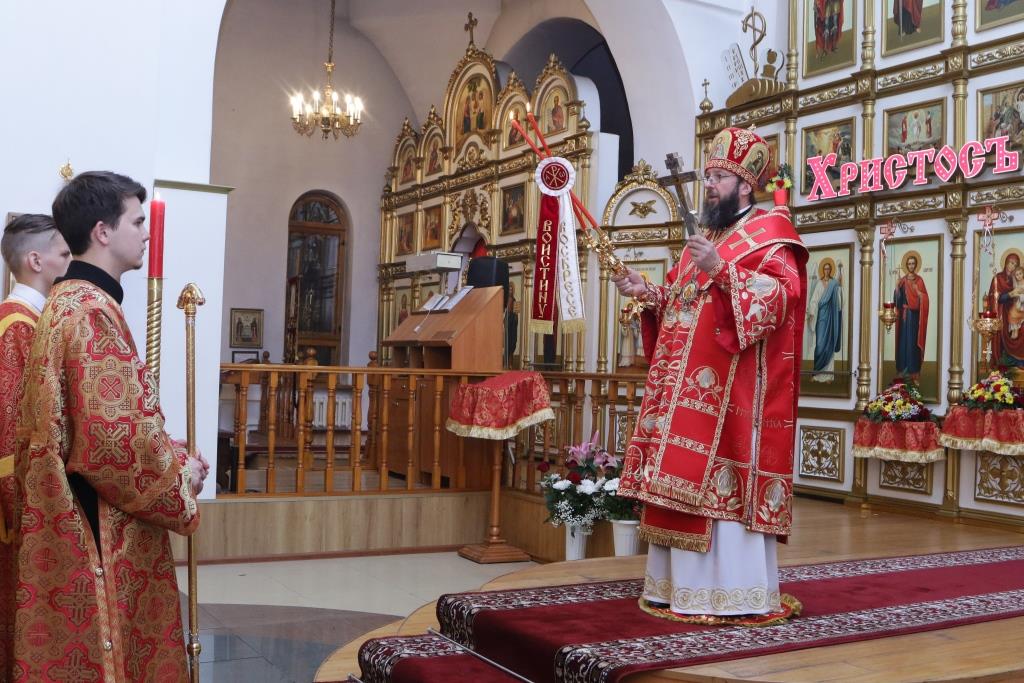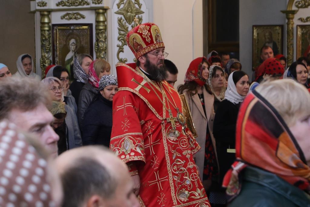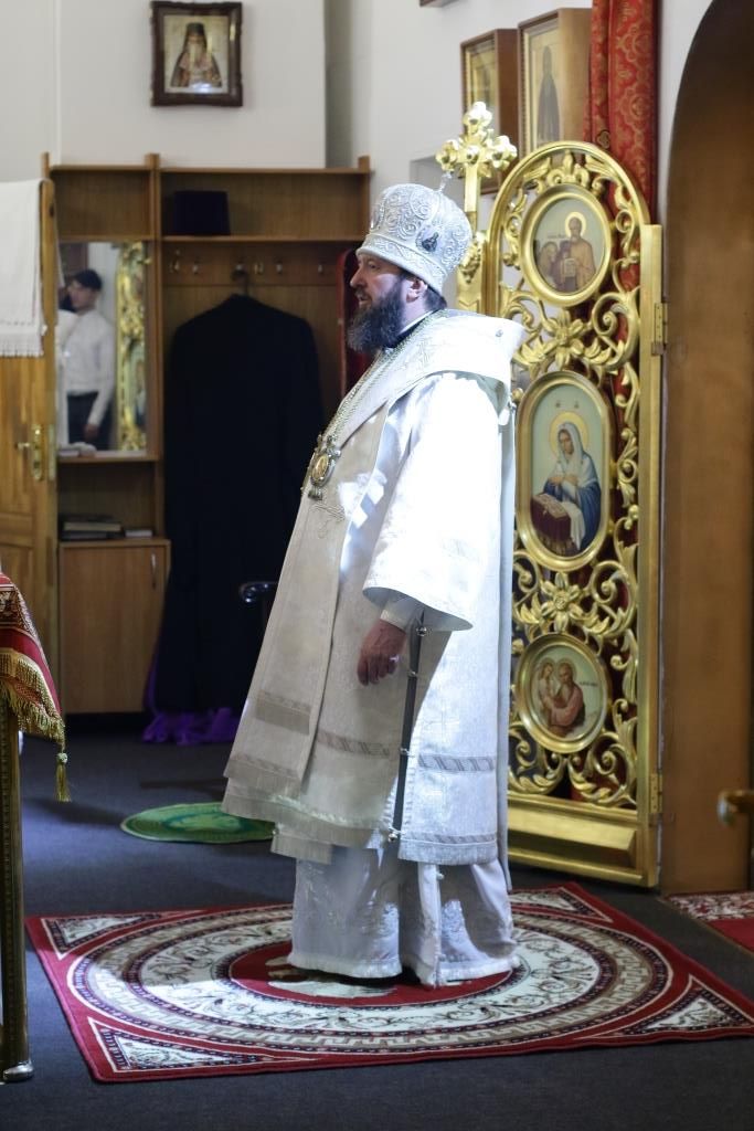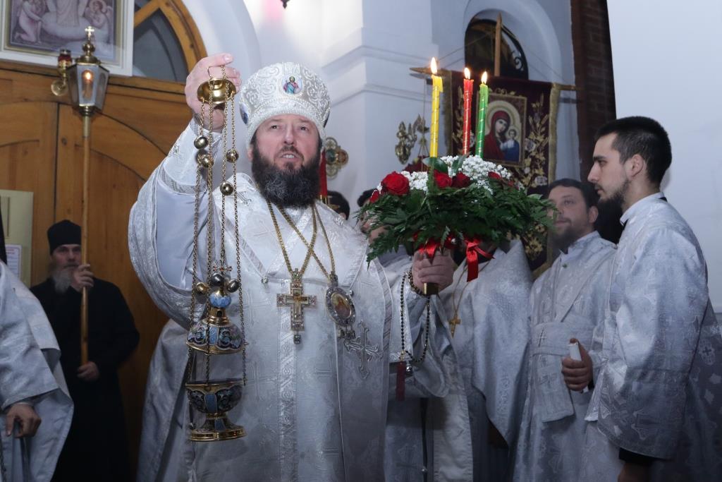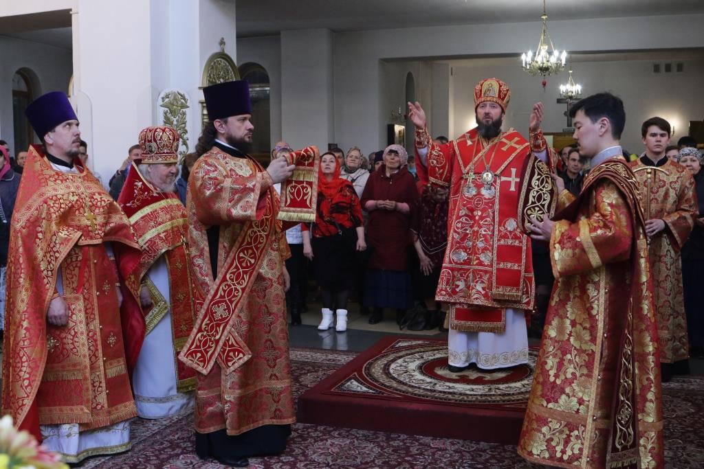 Его Преосвященству сослужили: духовник епархии архимандрит Спиридон (Теплухин), ключарь Андреевского собора иеромонах Никодим (Авдеев), клирики собора иерей Алексий Клепиков и иерей Константин Дьяков, секретарь епархии диакон Илия Кван, протодиакон Андрей Дудник.