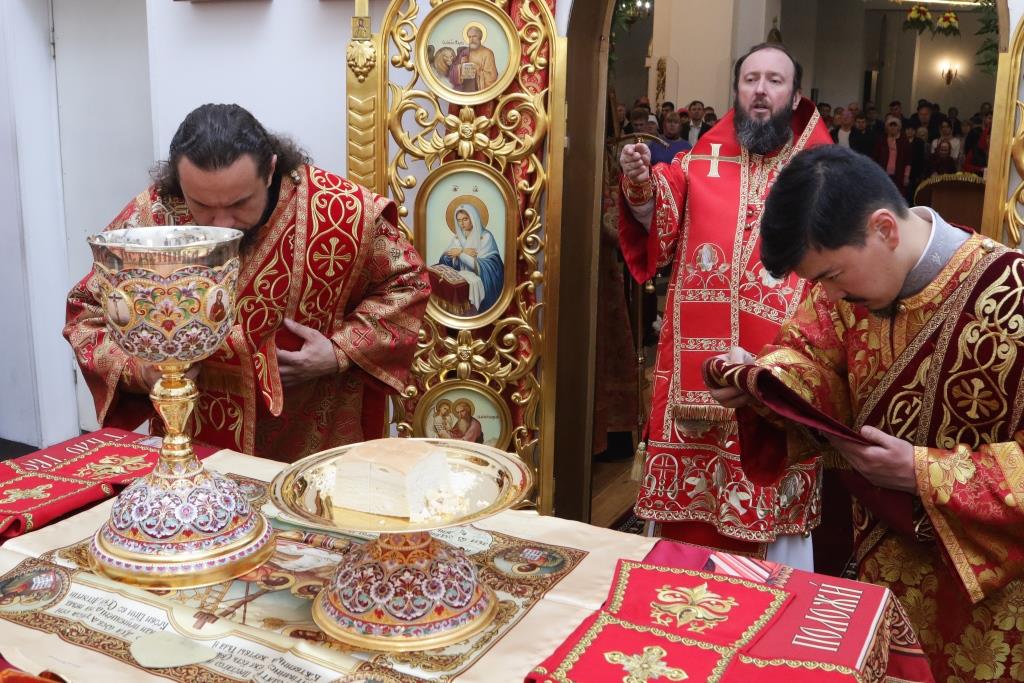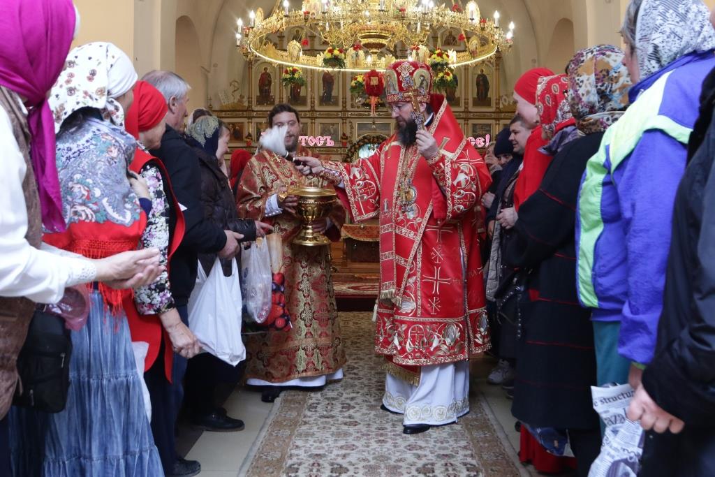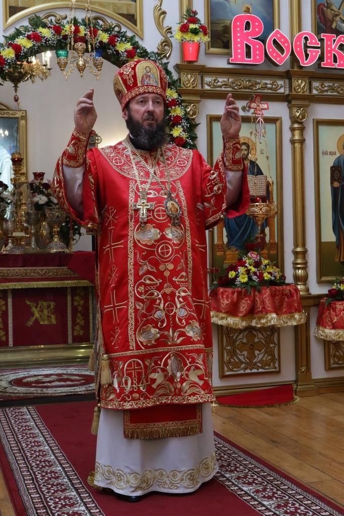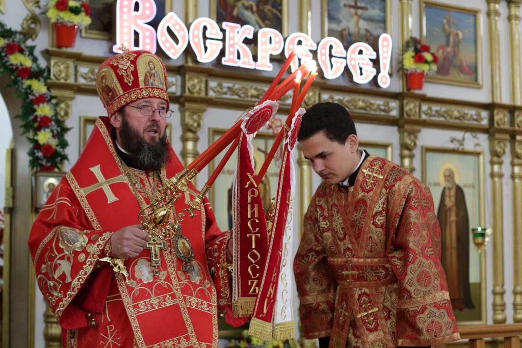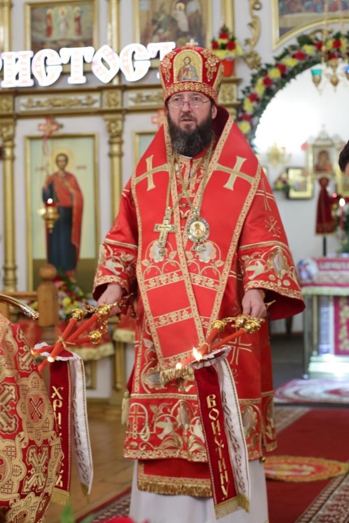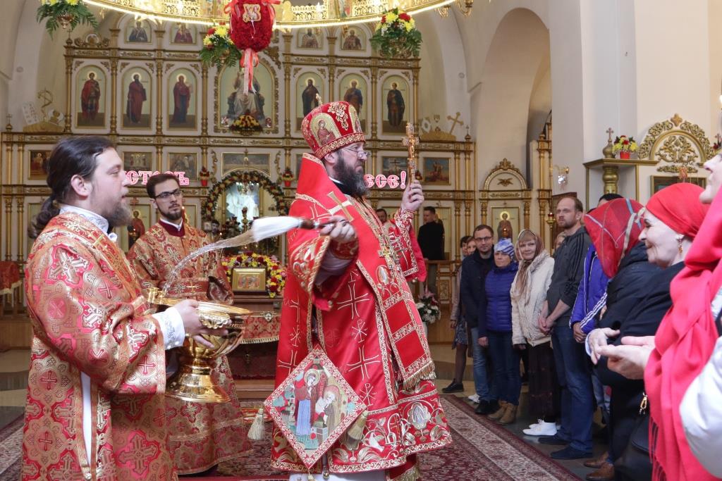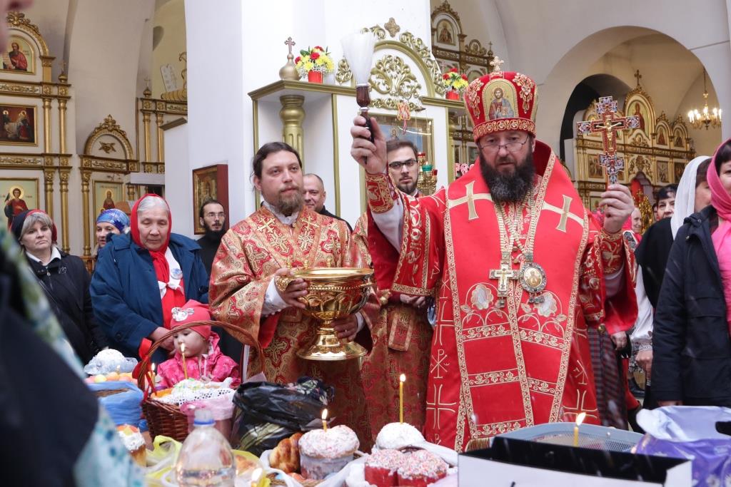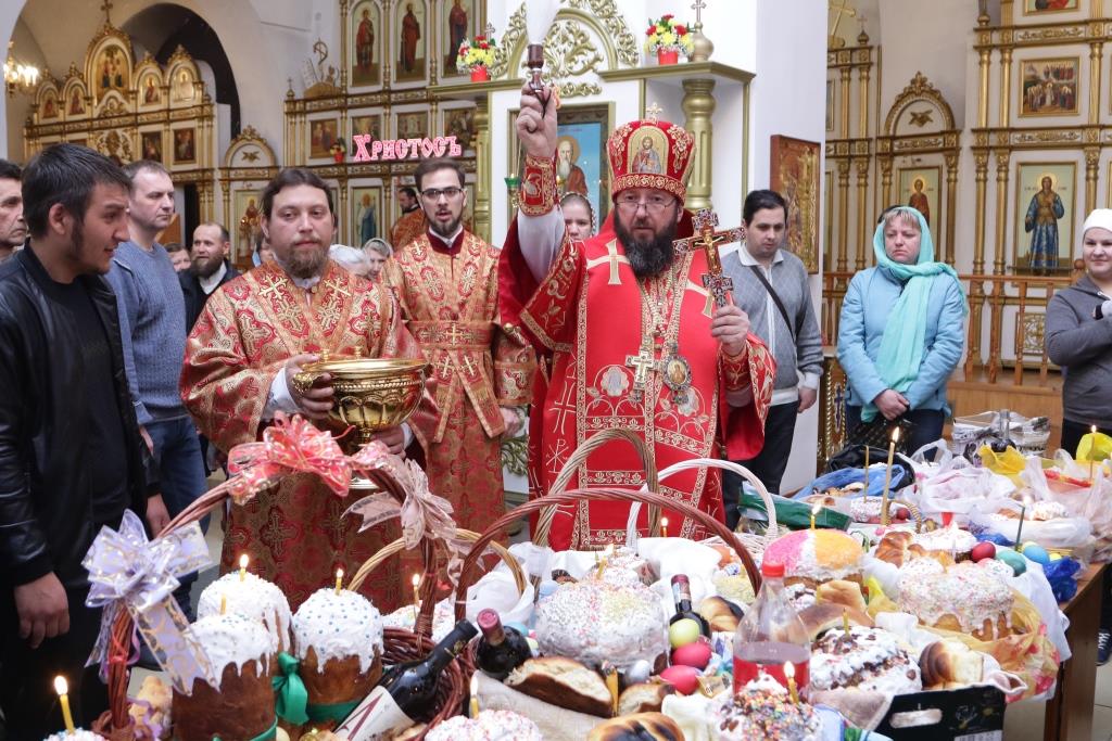После заамвонной молитвы епископ Амфилохий освятил артос и затем поздравил многочисленных прихожан с праздником Светлого Христова Воскресения: