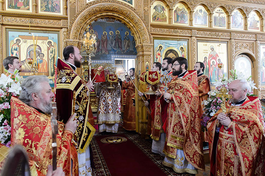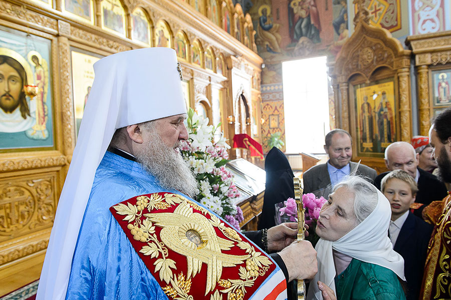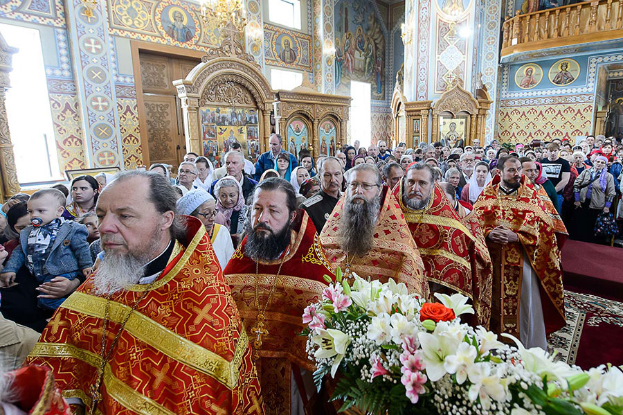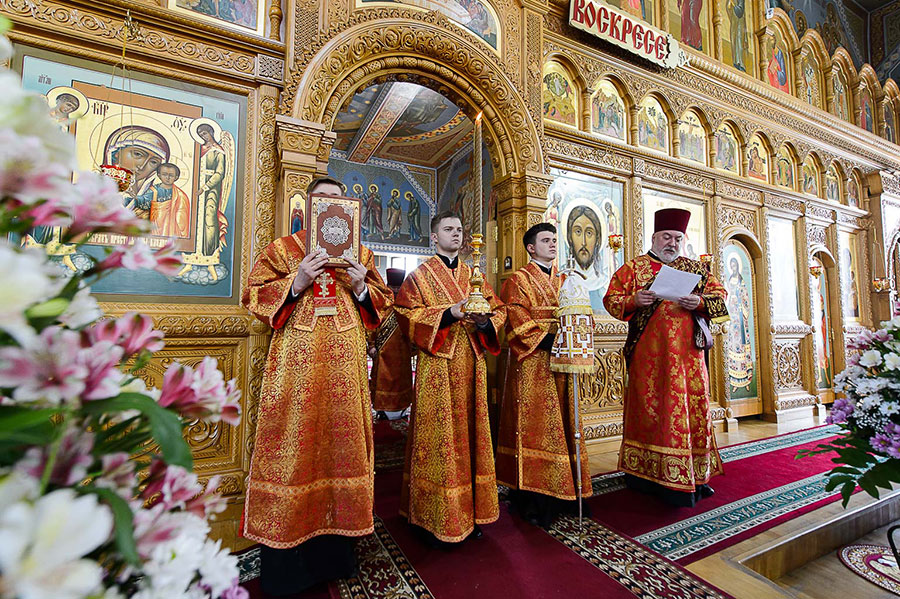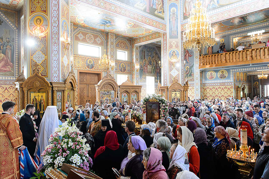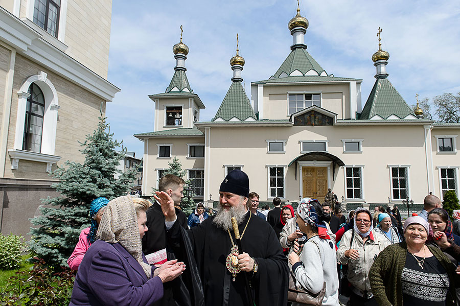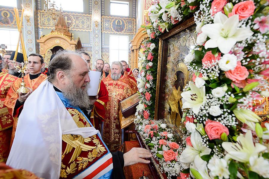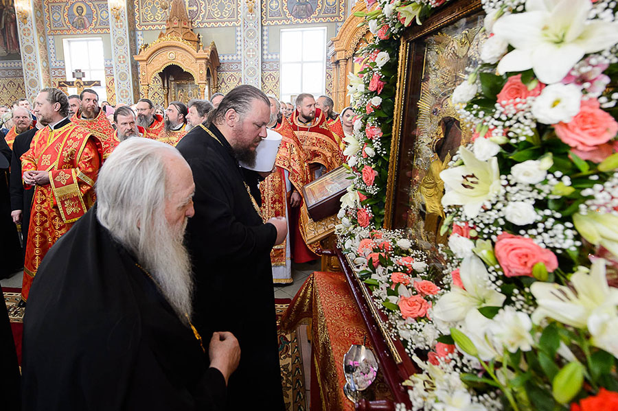 В завершение Литургии духовенство, хор и верующие совершили славление Пресвятой Богородице перед Ее чудотворным образом и пропели стихиры святой Пасхи.