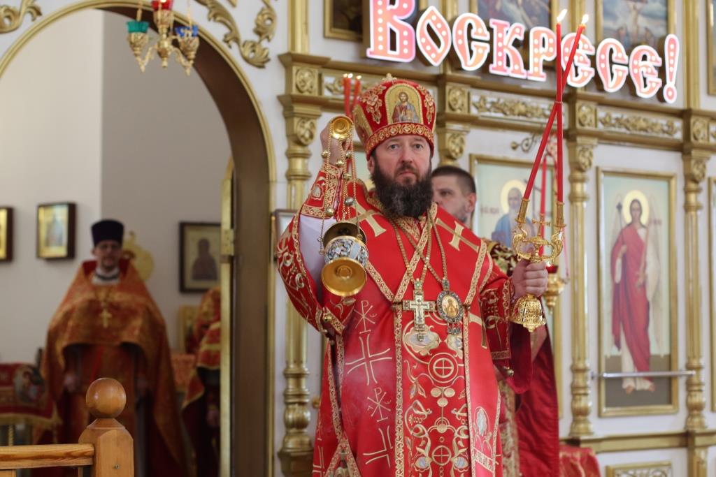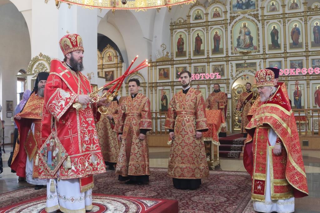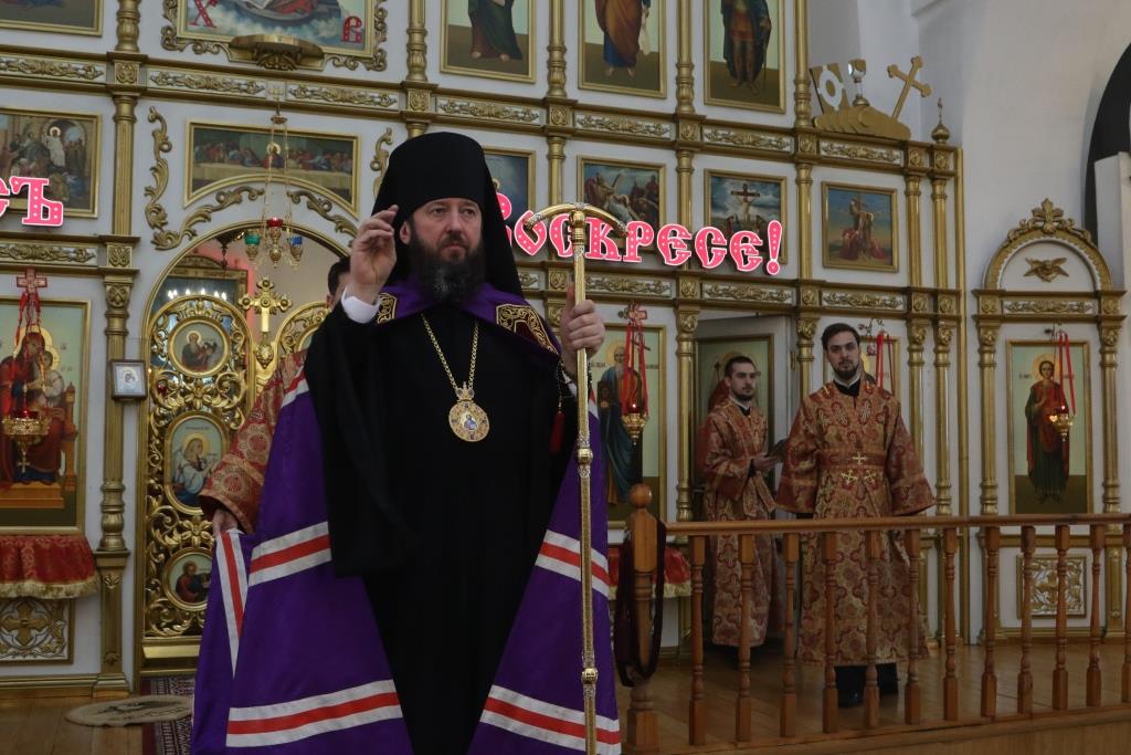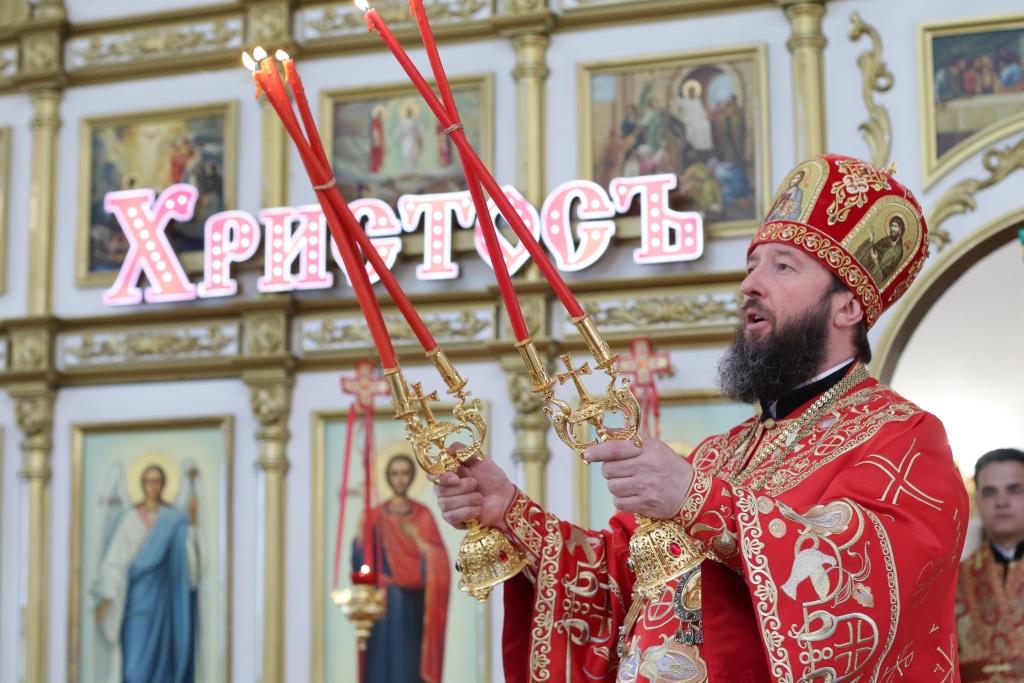 После заамвонной молитвы было совершено славление – всенародное пение пасхальных стихир. В завершение Богослужения Преосвященнейший Владыка поздравил духовенство и мирян с праздником Пасхи Господней и обратился к молящимся со словами проповеди.