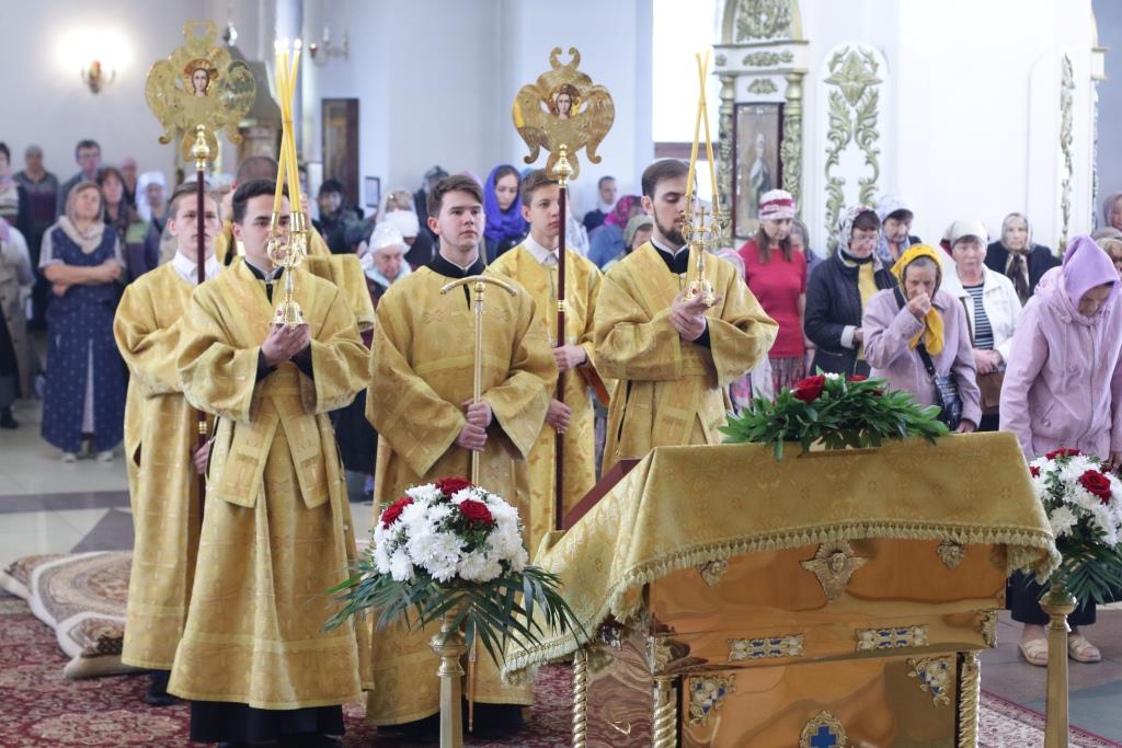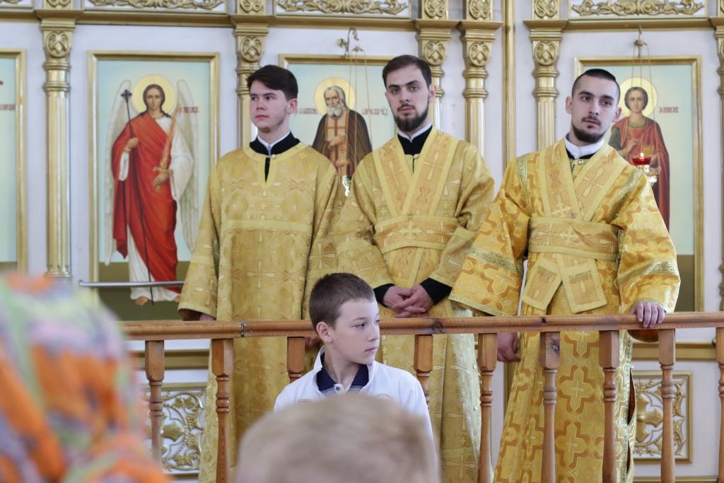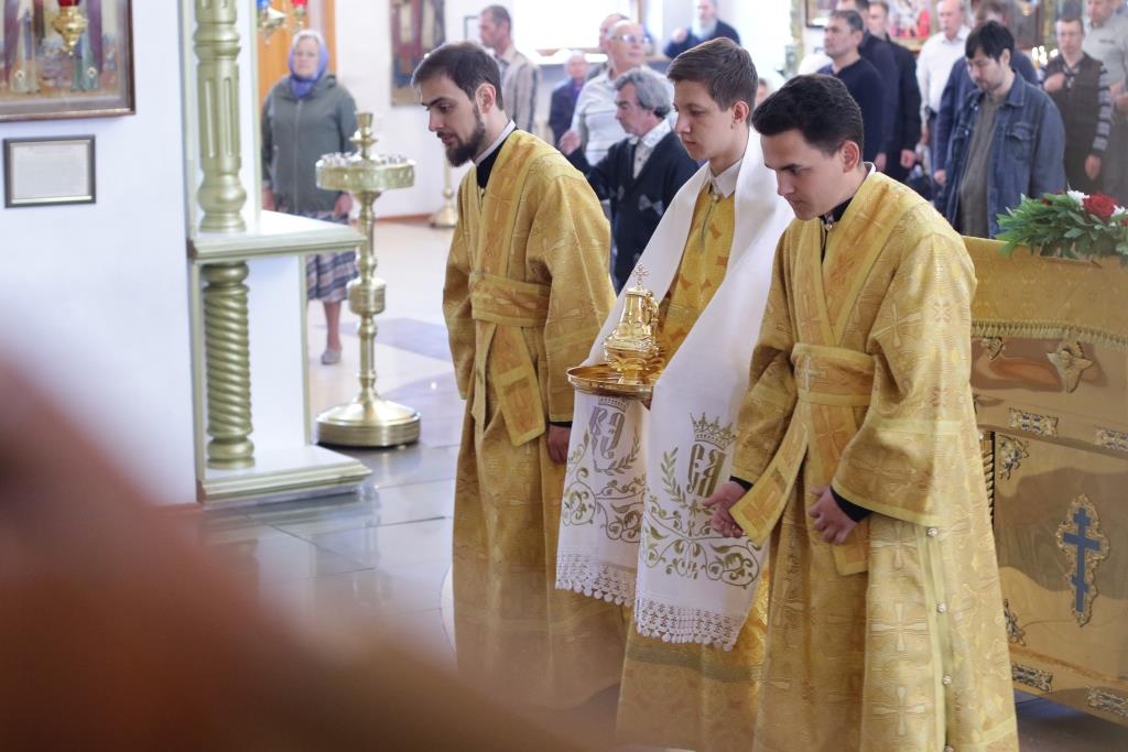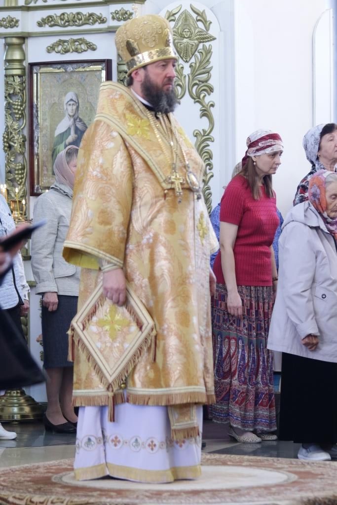 За Божественной Литургия молились сотрудники епархиального управления, братия Свято-Троицкого мужского монастыря и прихожане кафедрального собора. Песнопения Божественной Литургии и Недели 7-ой по Пасхе исполнял хор под управлением регента Н. Романцовой. Перед причастием мирян проповедовал иеромонах Никодим (Авдеев).