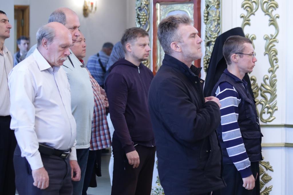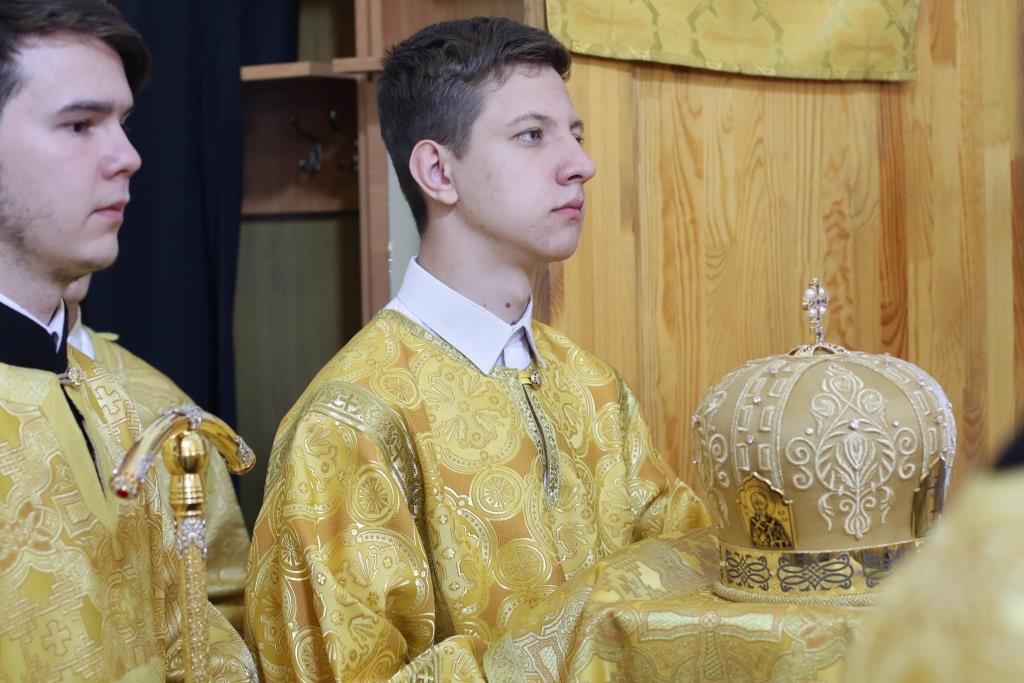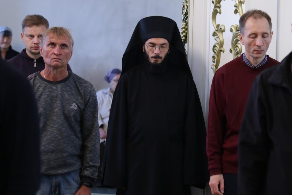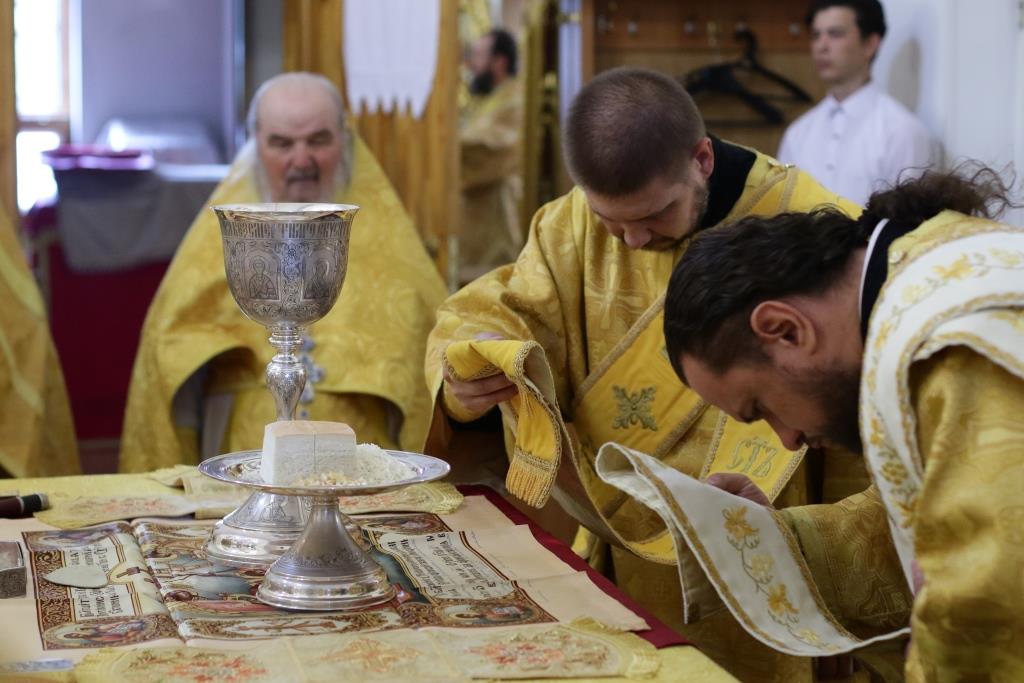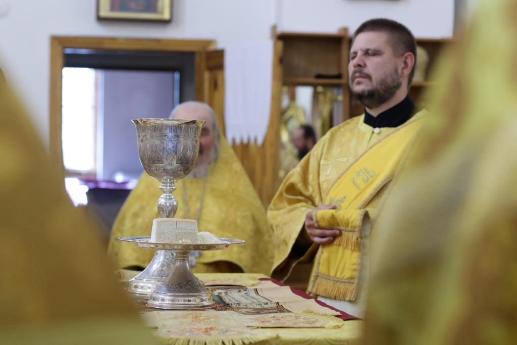За Божественной Литургия молились сотрудники епархиального управления, братия Свято-Троицкого мужского монастыря и прихожане кафедрального собора. Песнопения Божественной Литургии и Недели 7-ой по Пасхе исполнял хор под управлением регента Н. Романцовой. Перед причастием мирян проповедовал иеромонах Никодим (Авдеев).