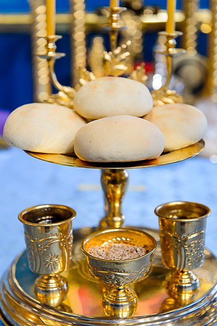 На великой вечерне по церковному Уставу была совершена лития (усиленное моление) с освящением хлеба, вина, пшеницы и елея (масла).