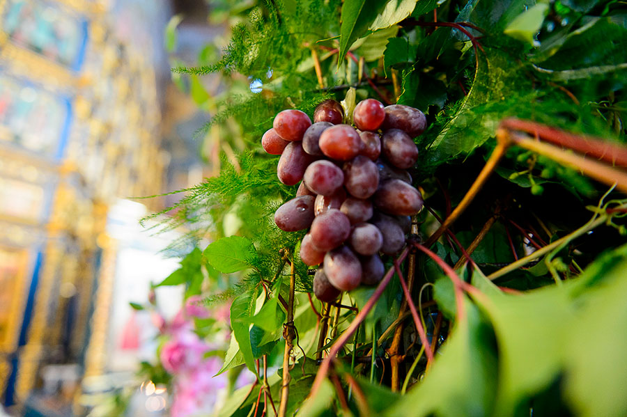 На утрени, во время пения тропаря праздника «В Рождестве девство сохранила еси», из алтаря на середину храма была изнесена плащаница с изображением Успения Божией Матери и положена на украшенную цветами и виноградной лозой гробницу.