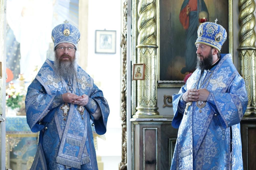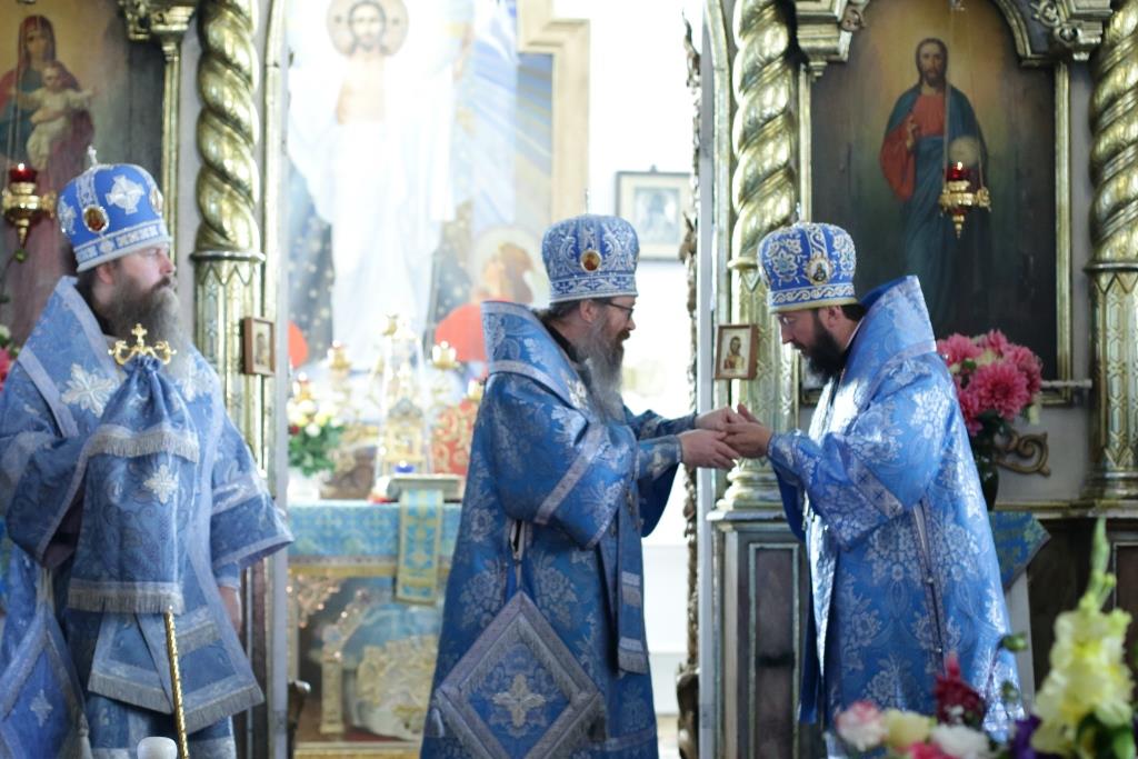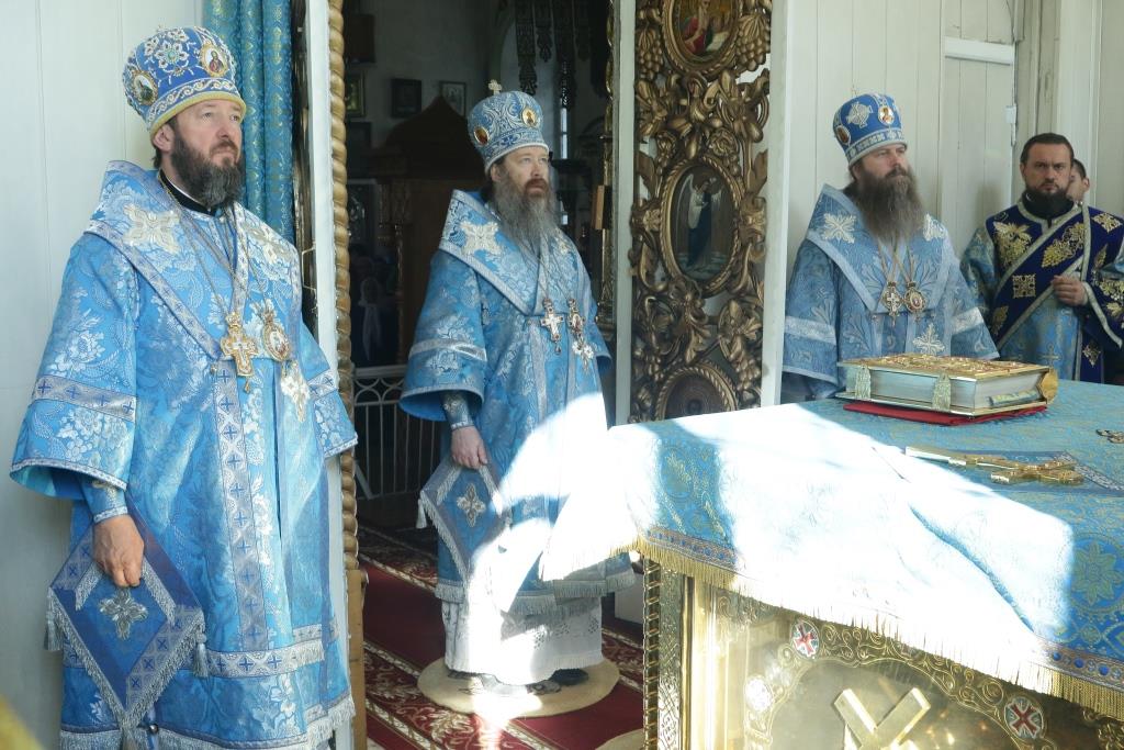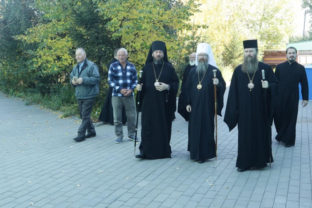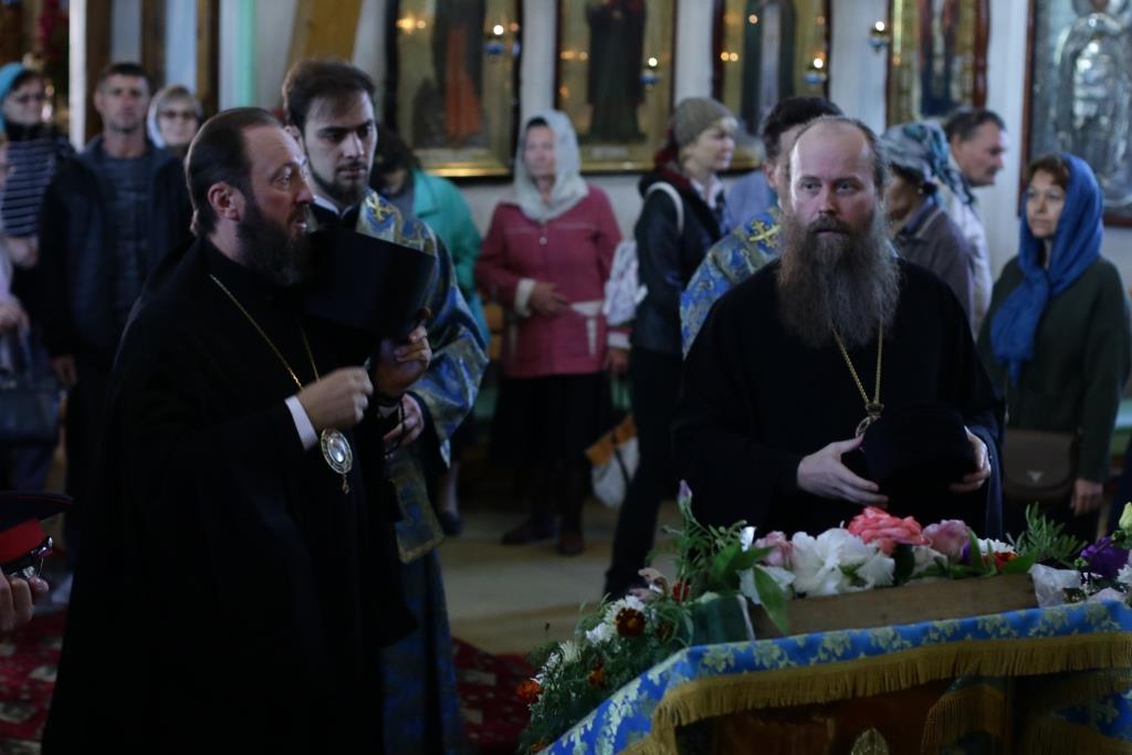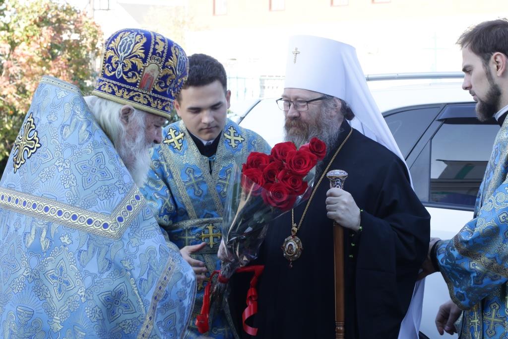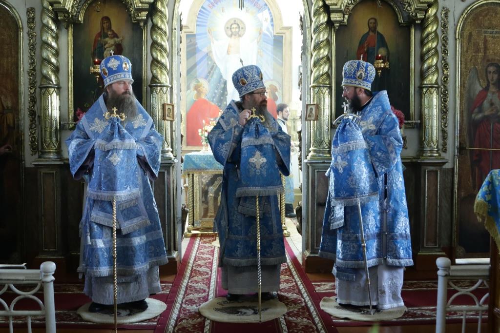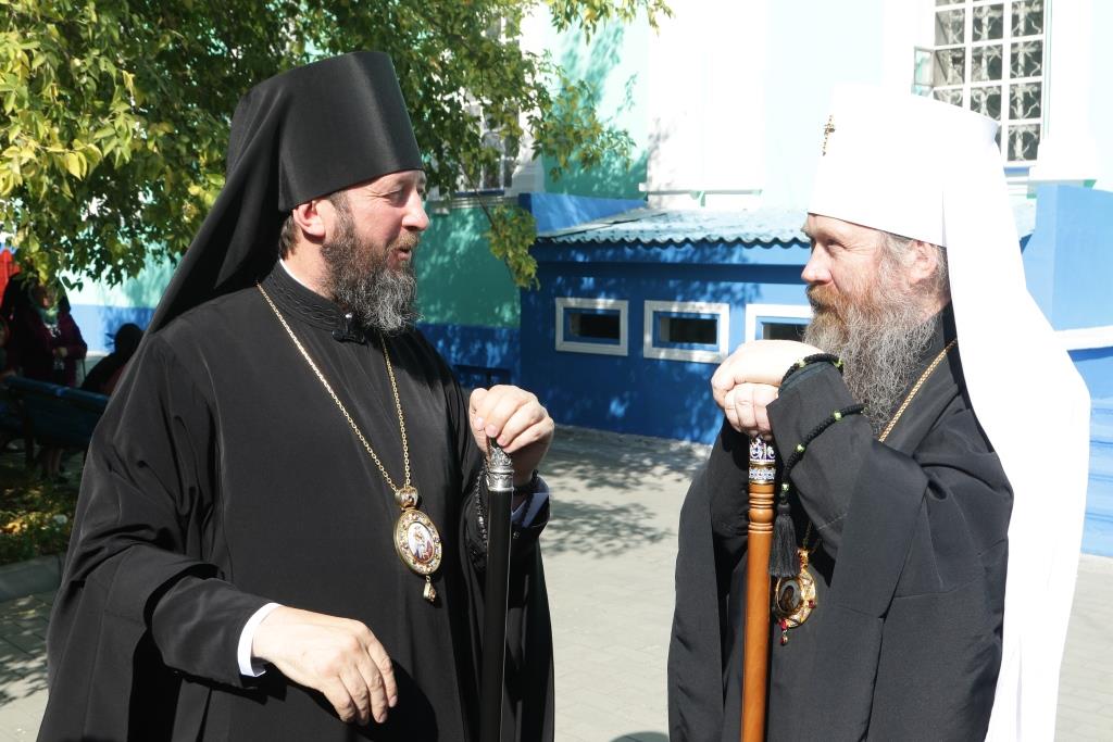 После заамвонной молитвы было совершено славление святым Новомученикам и Исповедникам Казахстанским. После окончания Литургии епископ Амфилохий обратился к архипастырям, духовенству и народу Божию со словами приветствия. В ответном слове Высокопреосвященнейший митрополит Ростислав поблагодарил епископа Амфилохия и православных христиан Семипалатинска за гостеприимство и радость совместной молитвы и передал в дар Воскресенскому собору частицу мощей святого благоверного князя Александра Невского.
