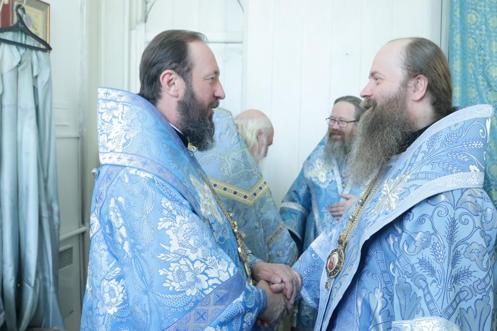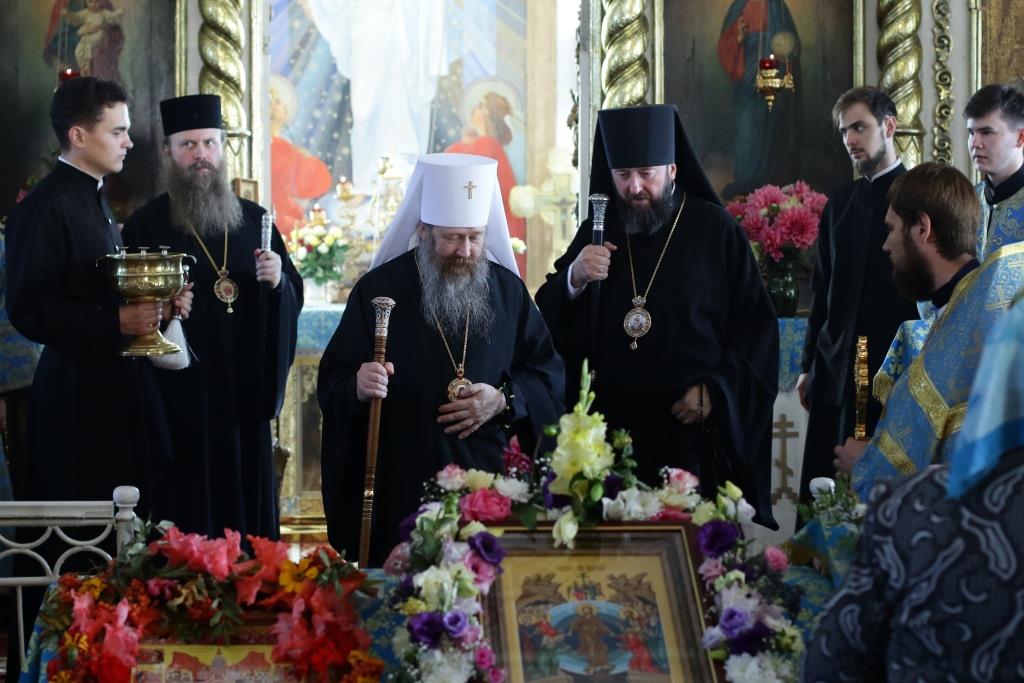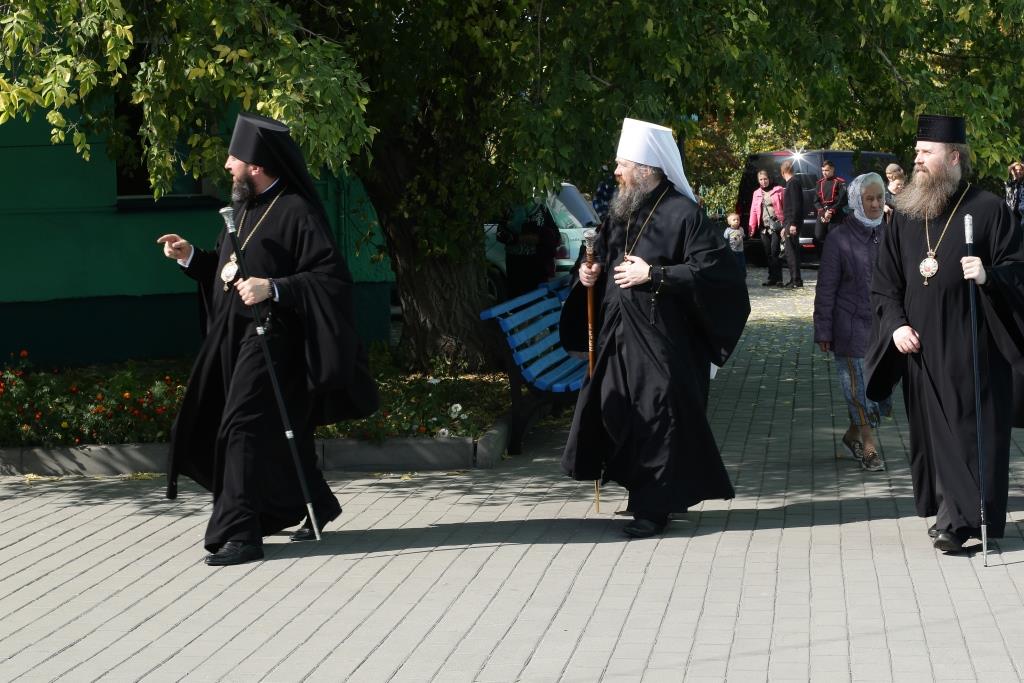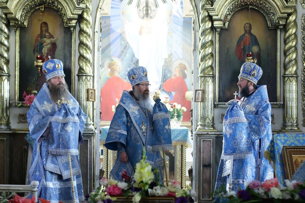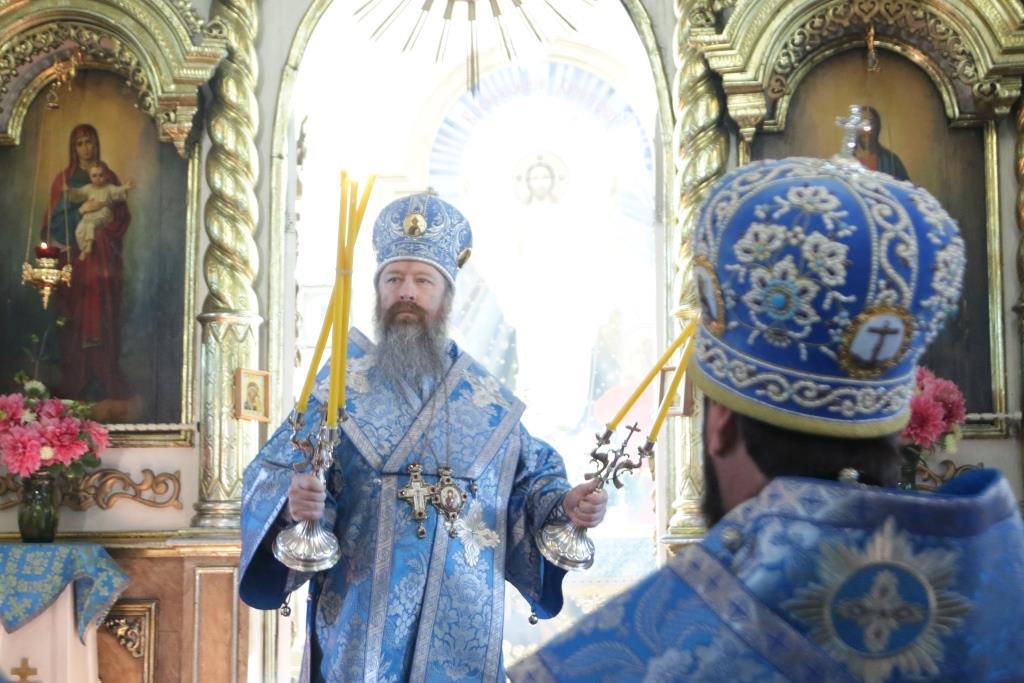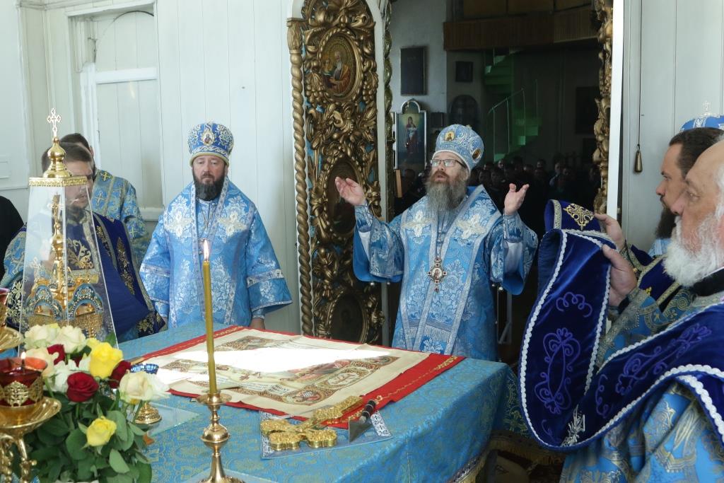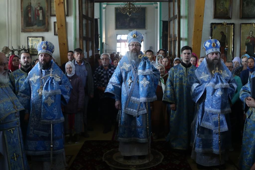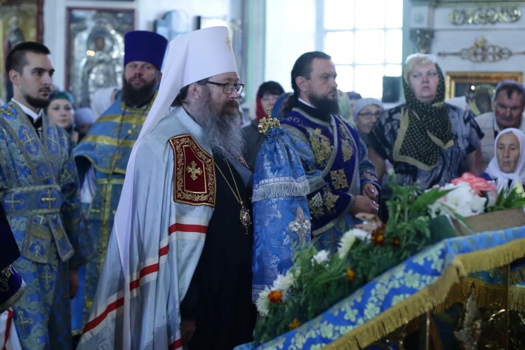 После заамвонной молитвы было совершено славление святым Новомученикам и Исповедникам Казахстанским. После окончания Литургии епископ Амфилохий обратился к архипастырям, духовенству и народу Божию со словами приветствия. В ответном слове Высокопреосвященнейший митрополит Ростислав поблагодарил епископа Амфилохия и православных христиан Семипалатинска за гостеприимство и радость совместной молитвы и передал в дар Воскресенскому собору частицу мощей святого благоверного князя Александра Невского.