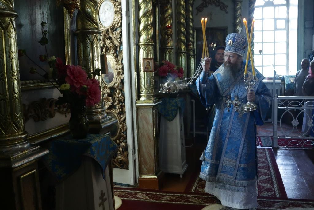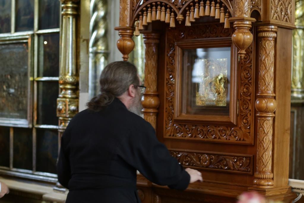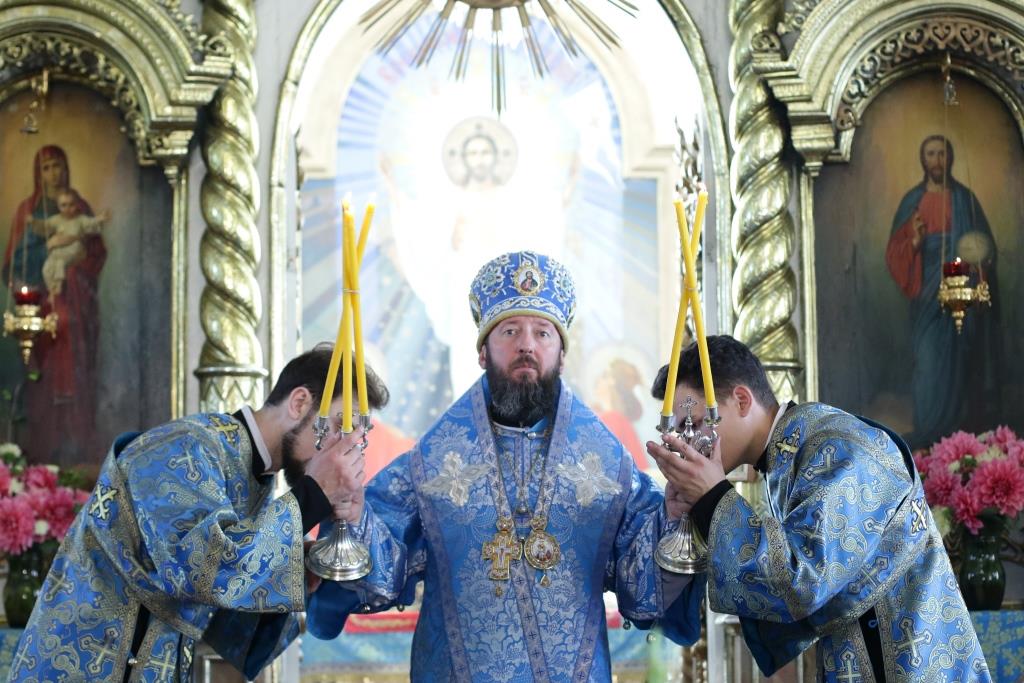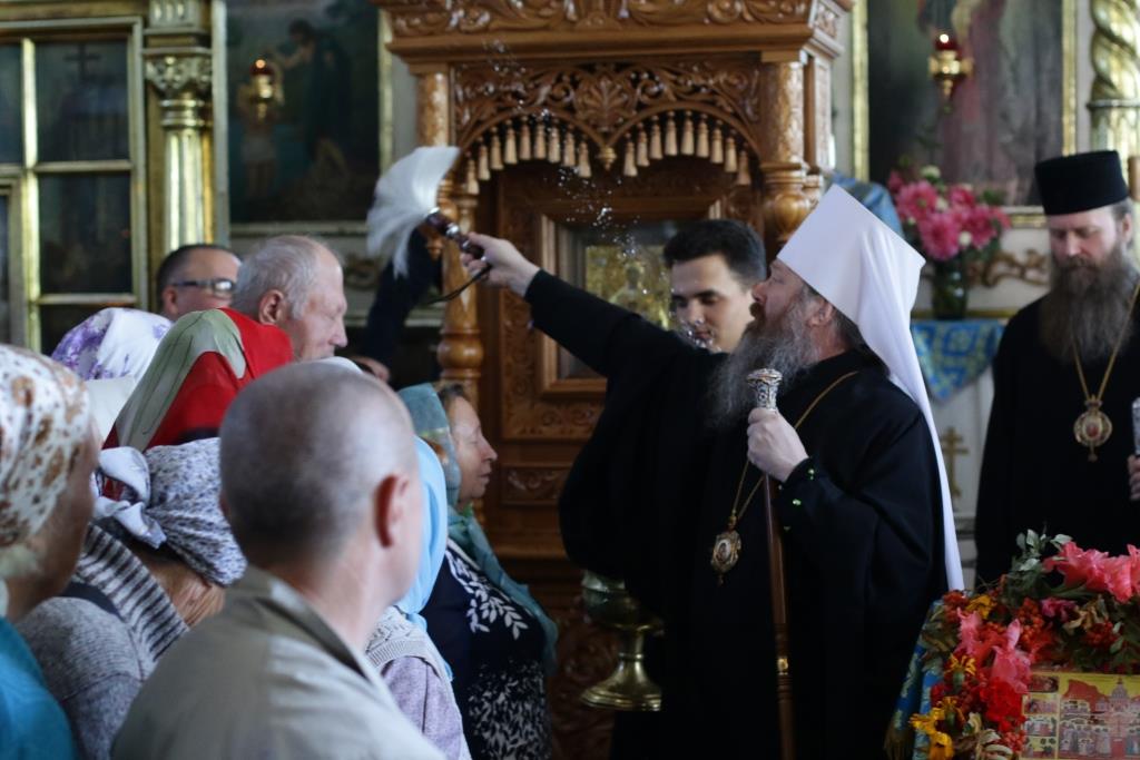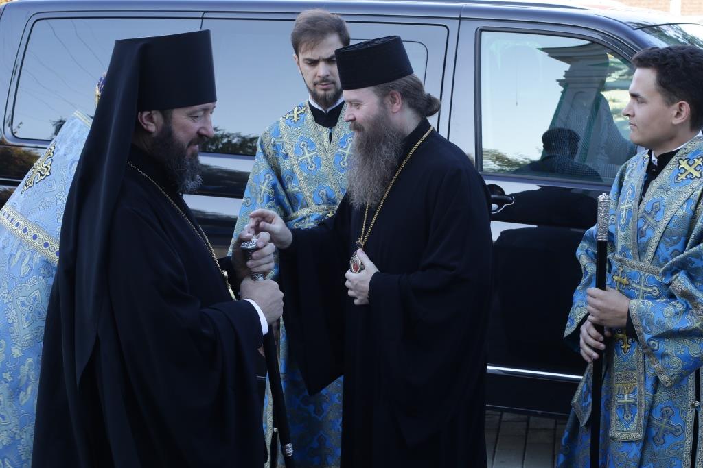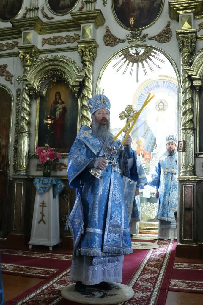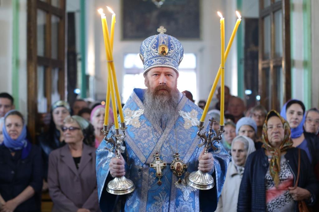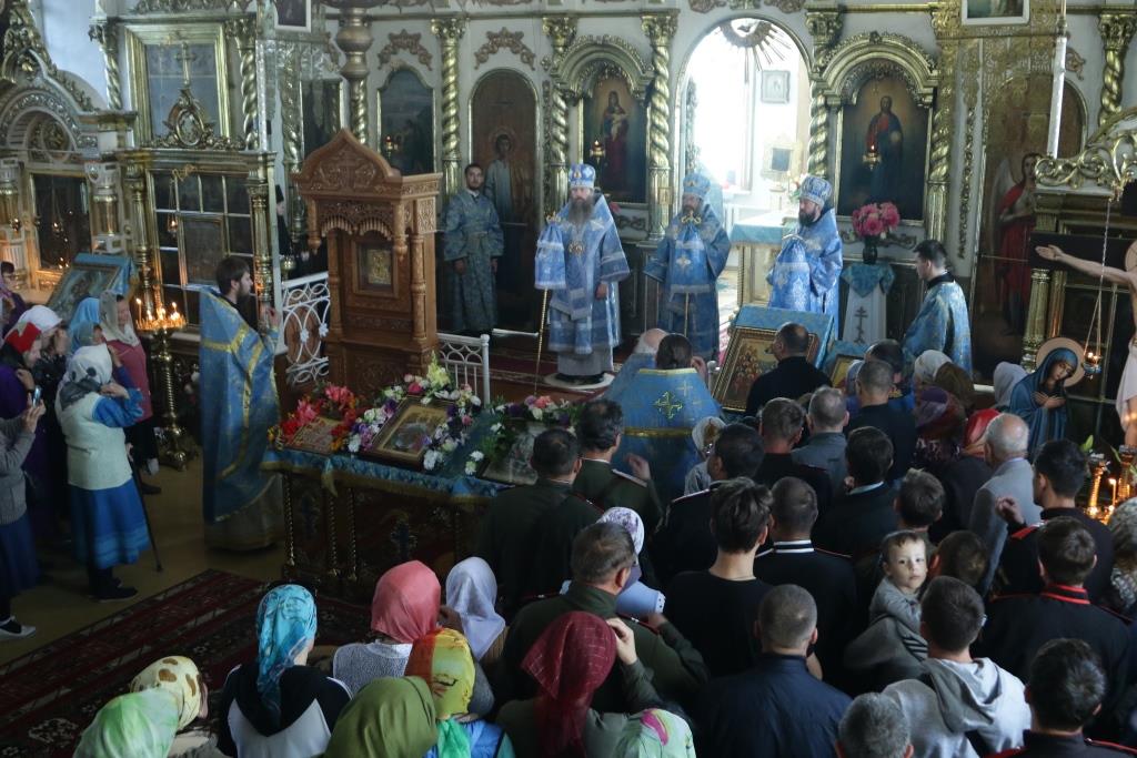 После заамвонной молитвы было совершено славление святым Новомученикам и Исповедникам Казахстанским. После окончания Литургии епископ Амфилохий обратился к архипастырям, духовенству и народу Божию со словами приветствия. В ответном слове Высокопреосвященнейший митрополит Ростислав поблагодарил епископа Амфилохия и православных христиан Семипалатинска за гостеприимство и радость совместной молитвы и передал в дар Воскресенскому собору частицу мощей святого благоверного князя Александра Невского.